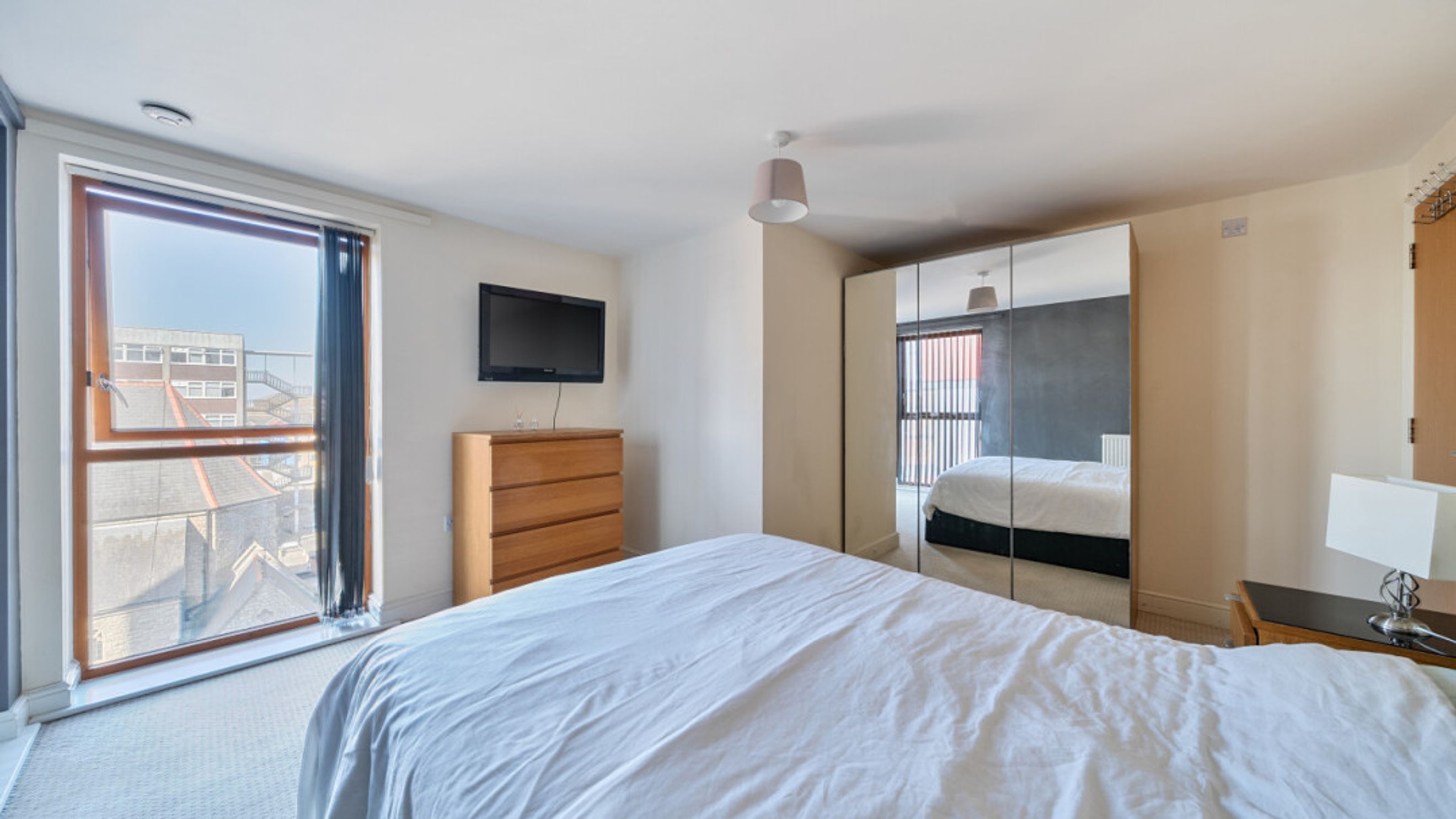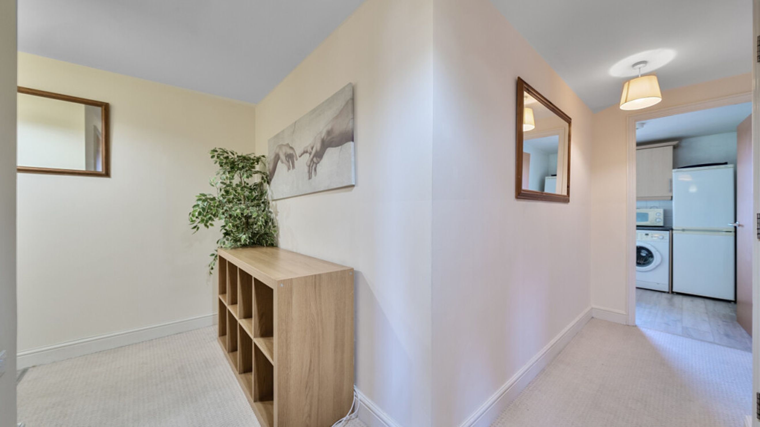 This triple aspect apartment, with generously proportioned rooms, features a dual aspect reception space with views over the well maintained communal gardens. A bright separate kitchen is fitted with a range of Beech wall and base units with an integrated oven, hob and extractor, dishwasher and spaces for all your white goods. There are two double bedrooms. the larger being dual aspect, and a family bathroom.