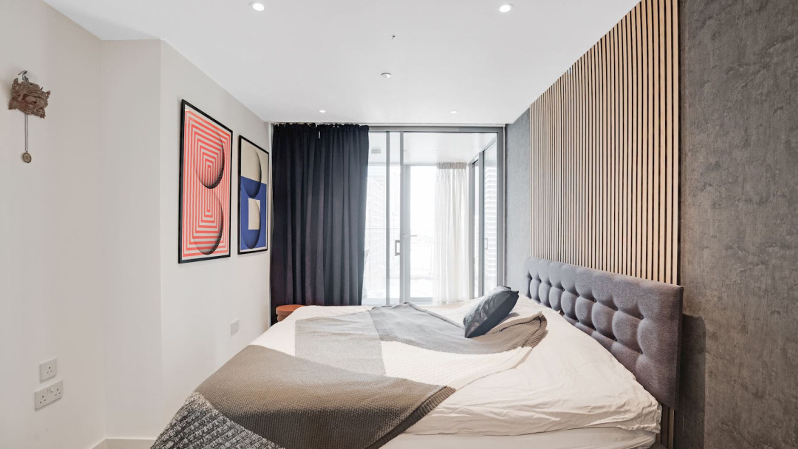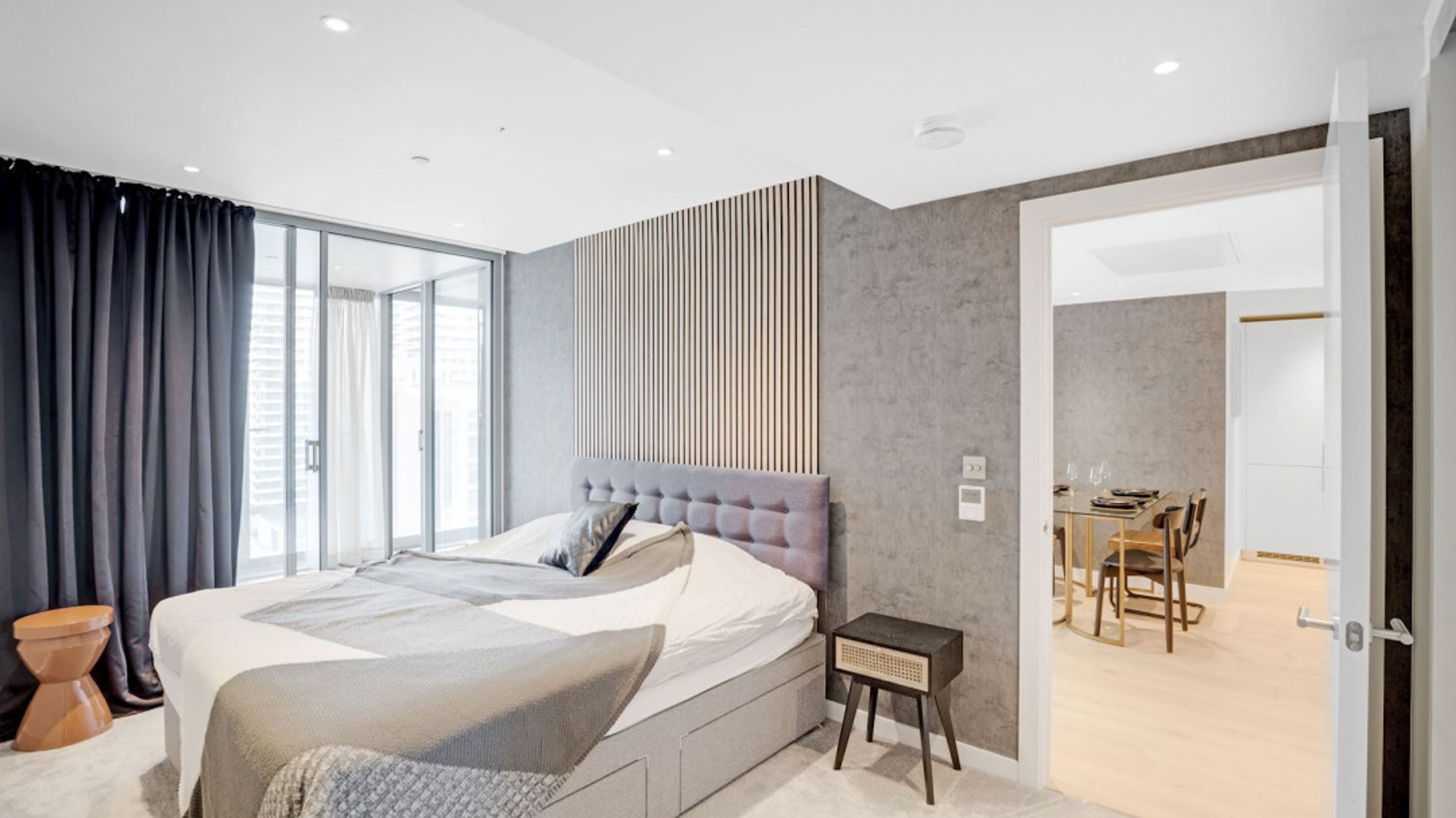 The spacious double bedroom is beautifully finished with a textured feature wall and soft neutral tones, opening onto a private winter garden that adds both light and calm to the space. The bathroom is contemporary and well-appointed, with a minimalist finish and quality fittings.