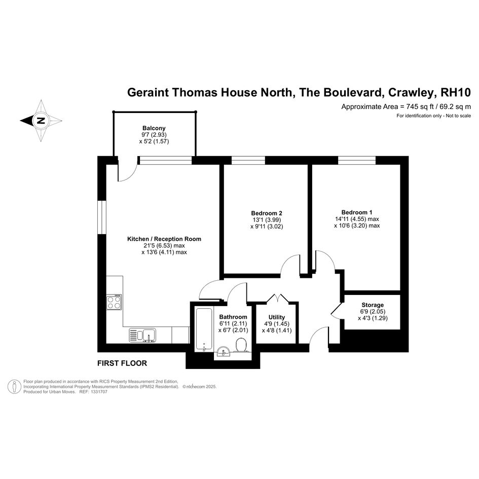 This apartment is on the first floor of a recently-constructed development close to the extensive range of shops and amenities of Crawley town centre. The property has a twenty-one-foot, dual-aspect reception room with open-plan kitchen area featuring sleek, handle-less units and integrated appliances. A door leads out onto a balcony on the east side of the building. There is a generously-sized main bedroom plus a second comfortable double bedroom, a simple yet stylish bathroom and an entrance hallway with large storage and utility cupboards. Well insulated walls, high performance glazing and a communal heating/hot water system have resulted in a very good energy-efficiency rating. The apartment comes with use of a parking space, plus access to the communal cycle store, and is only a short walk from Crawley Railway Station which offers services to a number of destinations including the south coast and various stations in central London.
