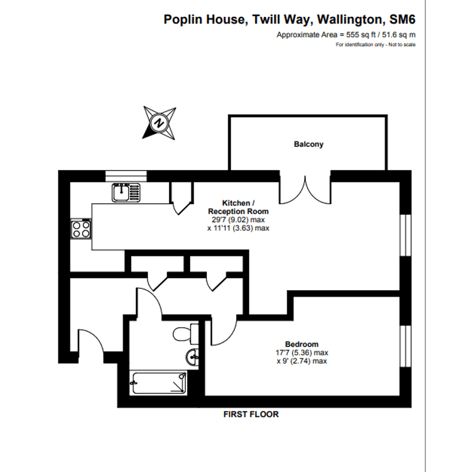 The property features an entrance hall, living room, kitchen, one bedroom, and a bathroom.