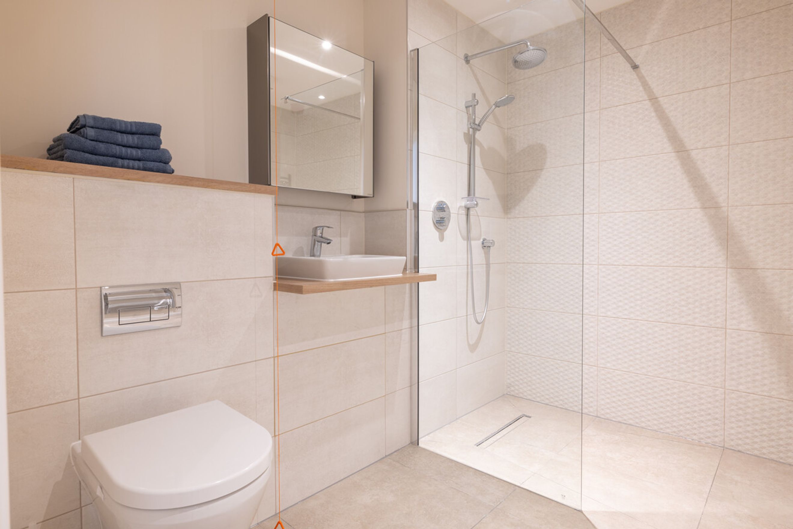 Tiled and fitted with suite comprising bath with shower over. WC with low level flush; wash hand basin. Extractor fan. Towel heater. Smoke detector and sprinkler system. Spotlights and ceiling lights.