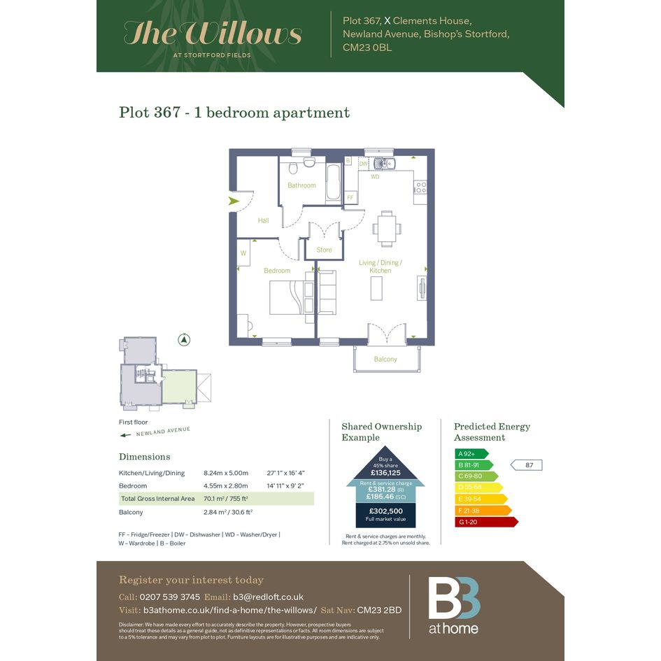 Introducing Plot 367 at The Willows, a beautifully designed one-bedroom apartment available through Shared Ownership in the desirable market town of Bishop’s Stortford. This spacious home is located on the first floor and offers a thoughtfully laid-out interior with a high-specification Symphony kitchen featuring a silestone quartz worktop and integrated appliances, including an oven, hob, extractor, fridge freezer, washing machine, and dishwasher.