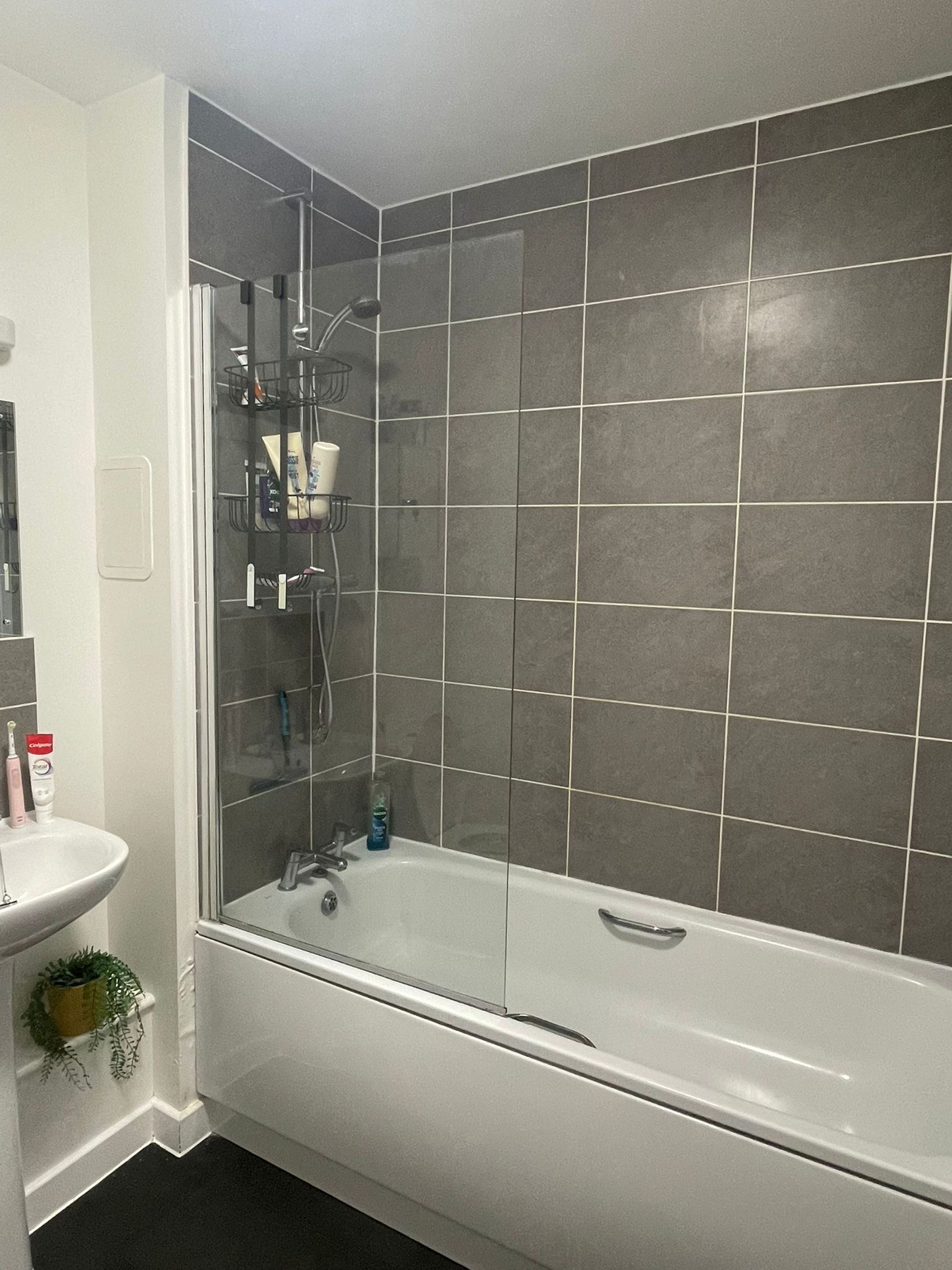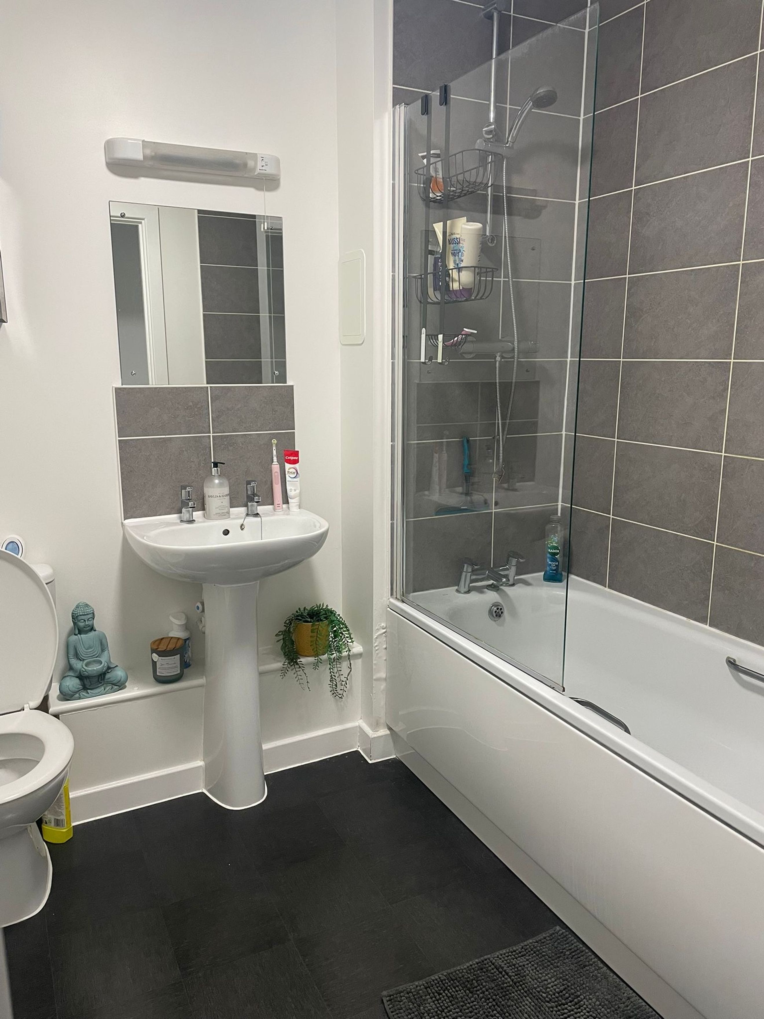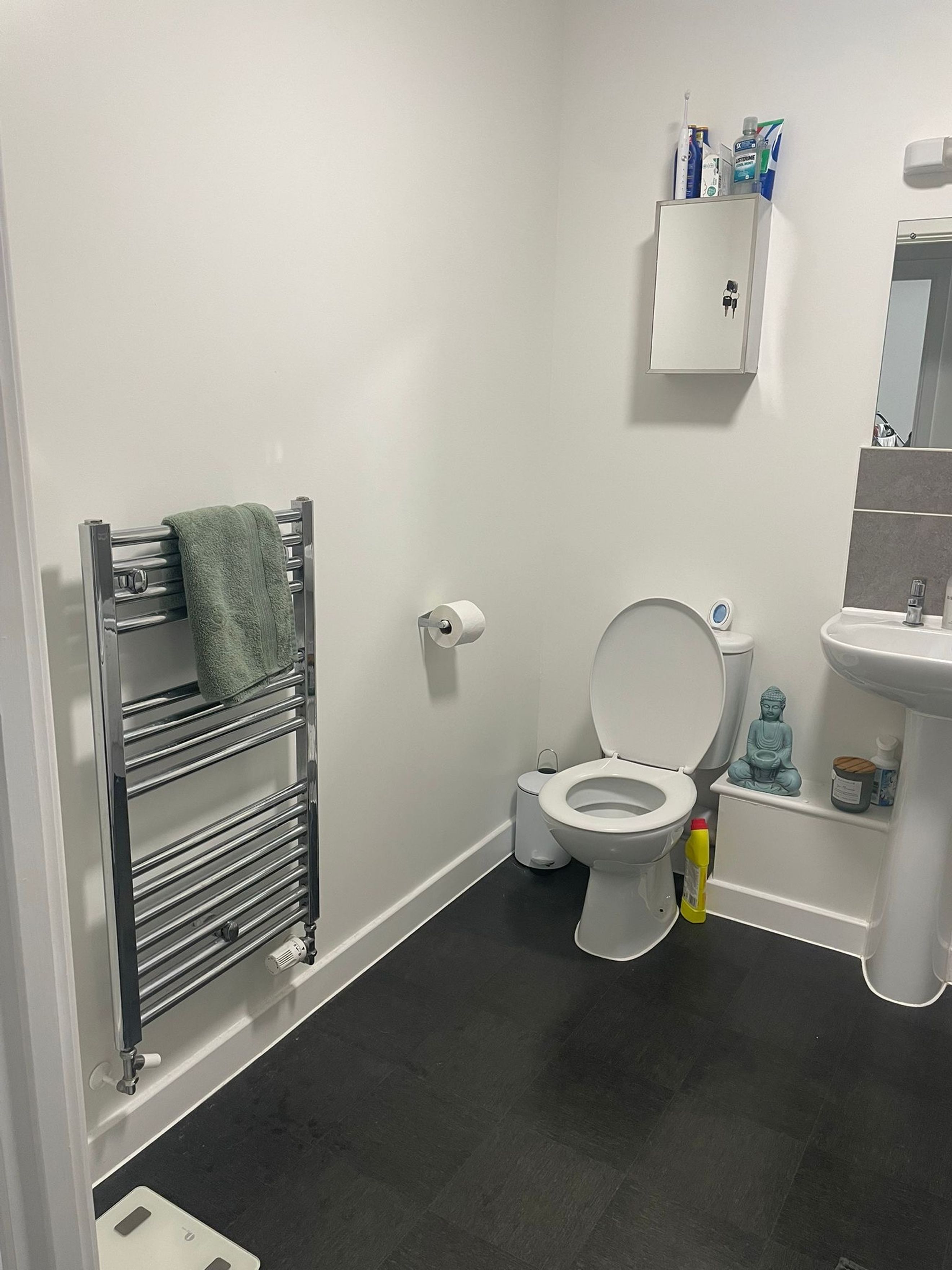 Bathroom - Over bath thermostatic shower, wash hand basin and toilet. Heated towel rail. Vinyl flooring.