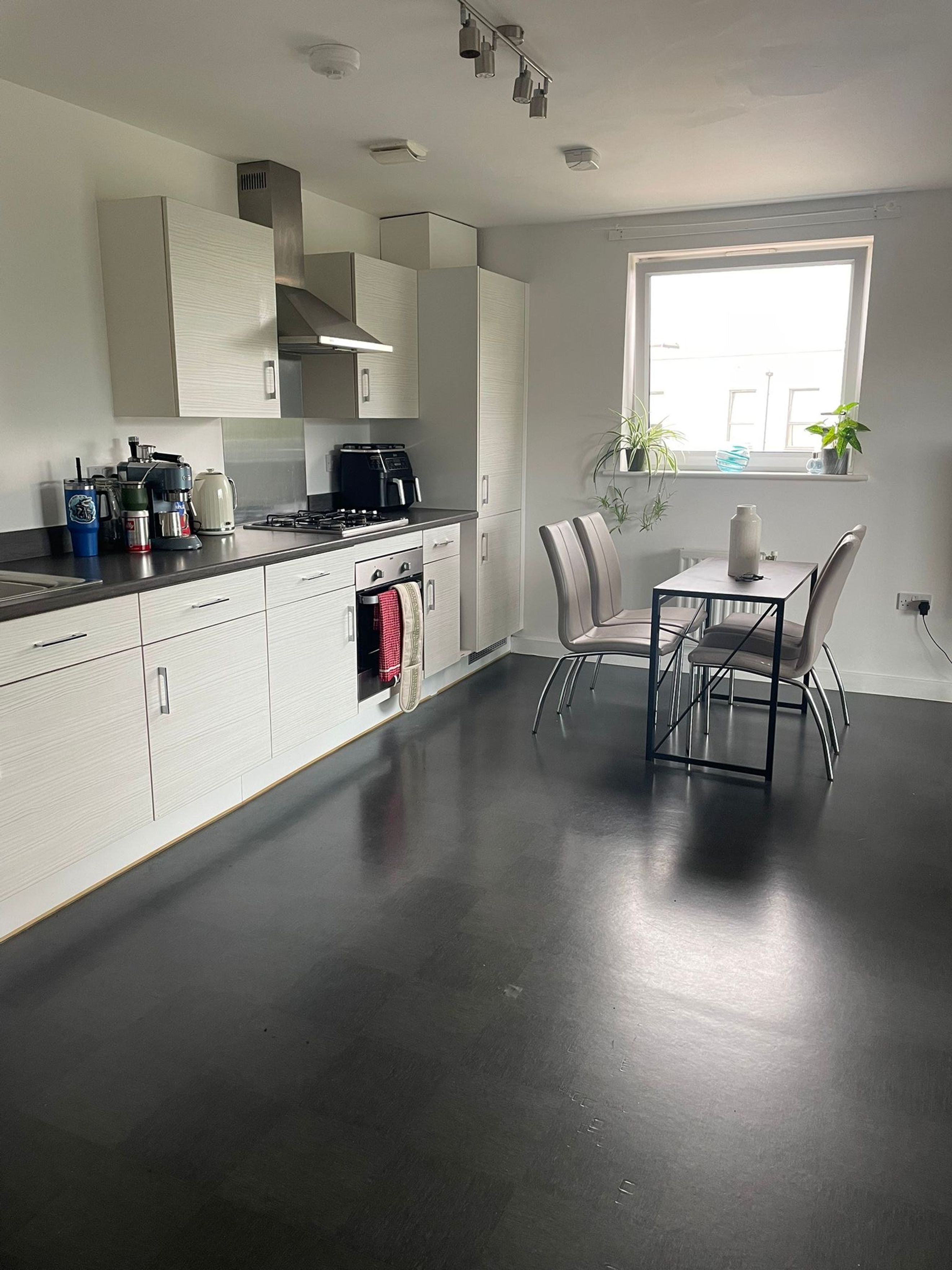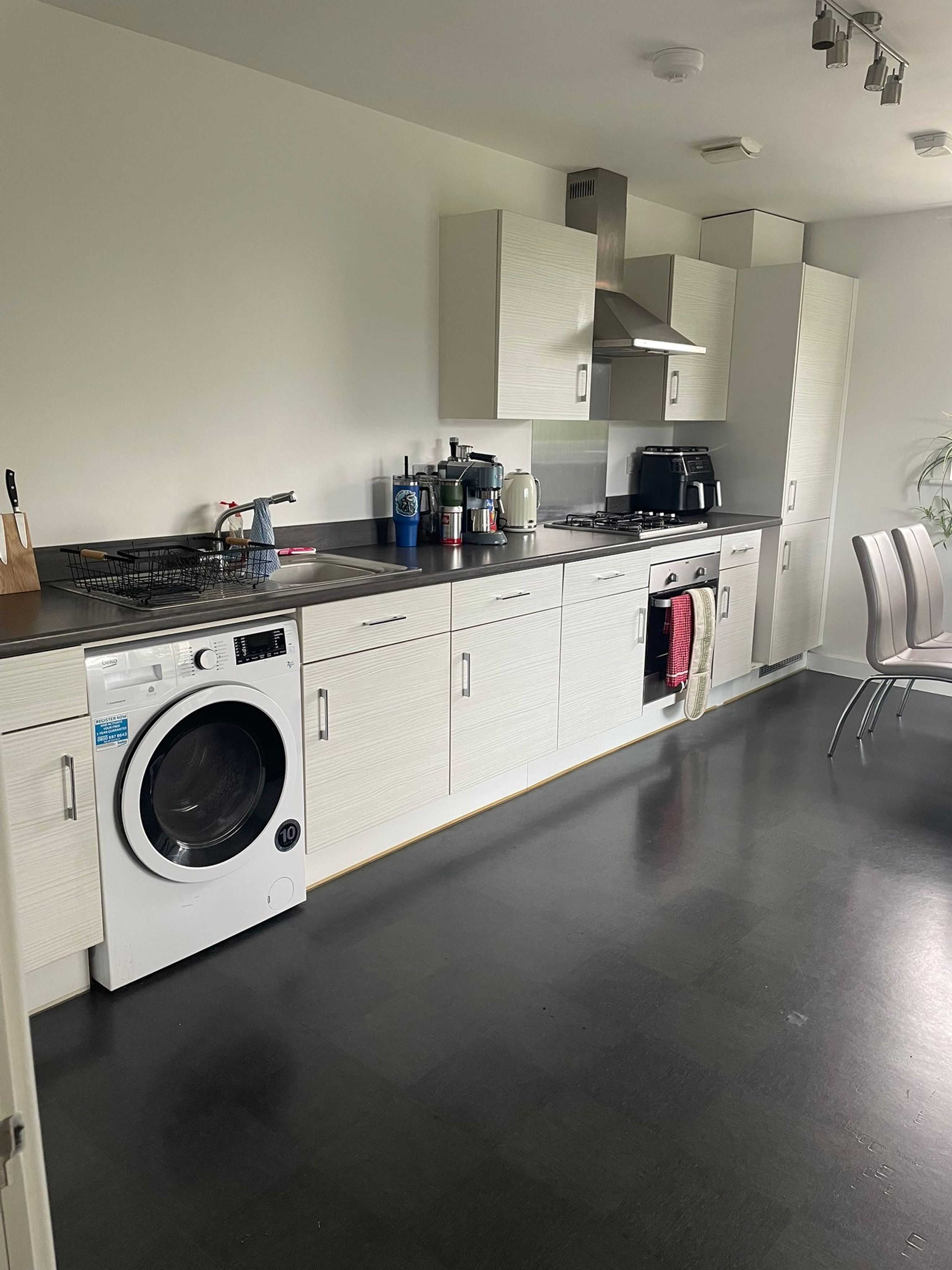 Kitchen – Fitted with a range of modern base and wall units. Black worktop and upstand. Integrated fridge/freezer, integrated electric oven and gas hob with stainless steel extractor hood. Stainless steel kitchen sink with mixer taps. Vinyl flooring.