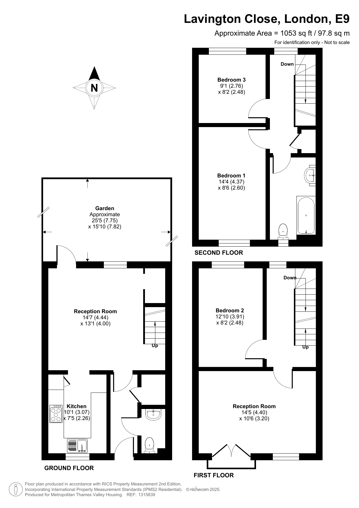 The property features a reception room, separate kitchen, toilet and a back garden on the ground floor, another reception room and one bedroom on the first floor, two bedrooms and a family bathroom on the third floor.