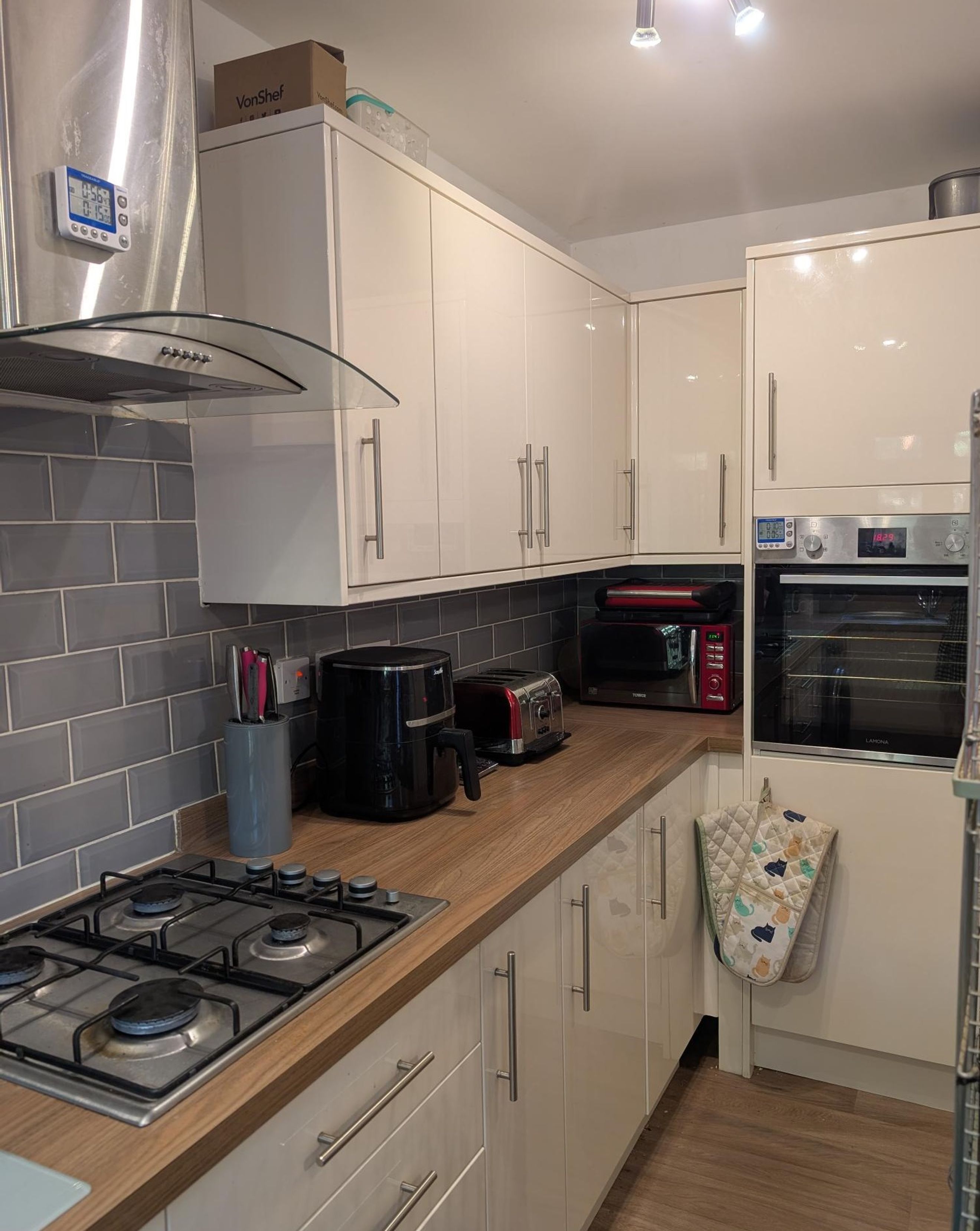 On the ground floor there's living room, leading a large kitchen/diner with integrated fridge freezer. A stainless steel oven and hood with gas hob, with doors opening on to the rear garden. Downstairs WC.