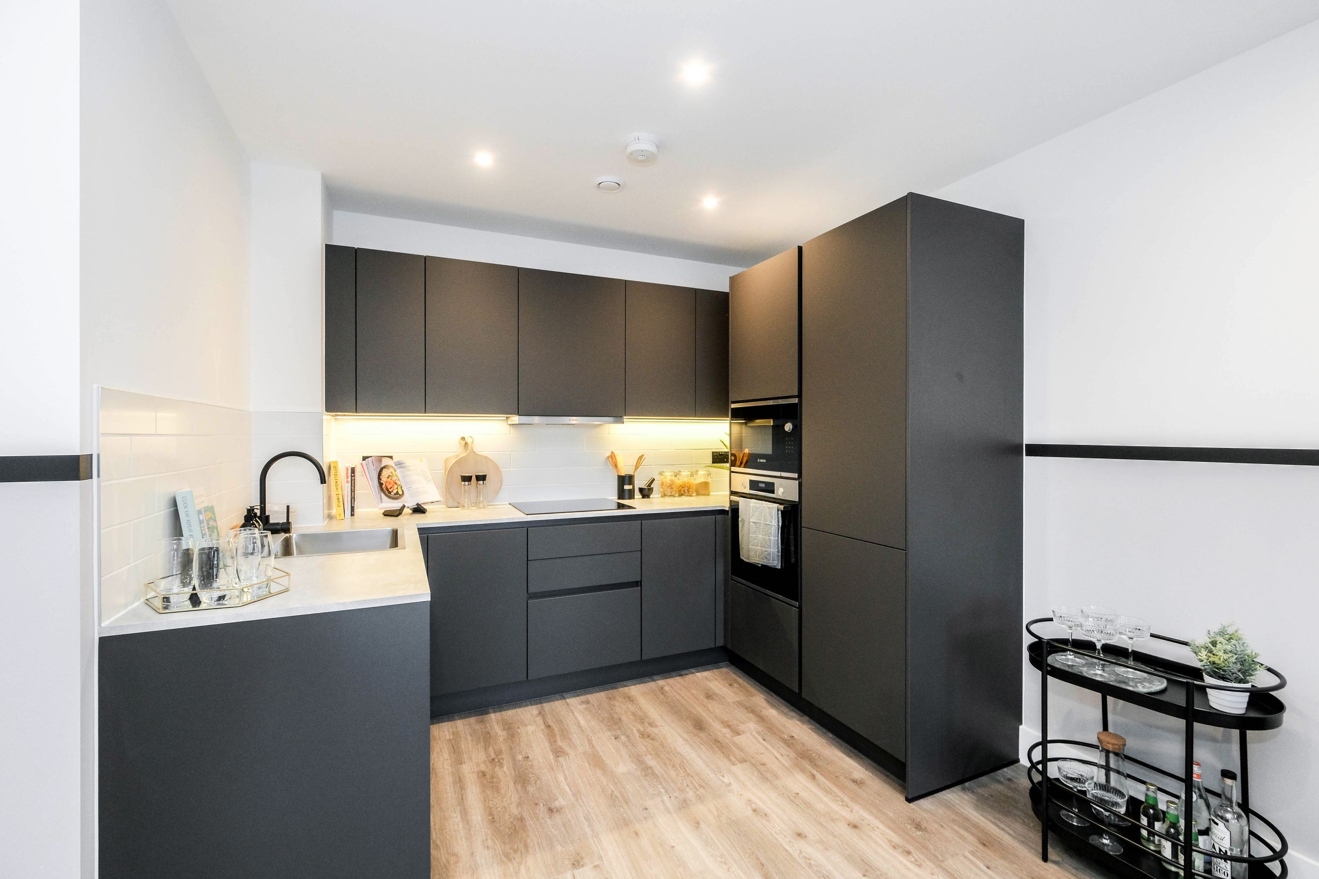 A stylish one bedroom apartment located in the heart of Croydon town centre close to excellent rail links. These high specification apartments include stylish fitted kitchens in a sleek grey, with integrated appliances, bathrooms with fitted furniture and modish matt black taps. Each apartment contains ample storage, Amtico flooring throughout, with carpets to the bedrooms.