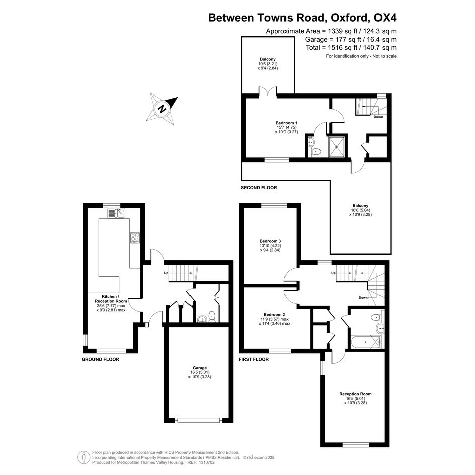 The property is set across two floors. The ground floor has a separate kitchen and reception area, a toilet, and a garage. On the first floor, there is a reception room, two bedrooms, and one bathroom. On the second floor, there is another bedroom, another bathroom, and two private balconies.