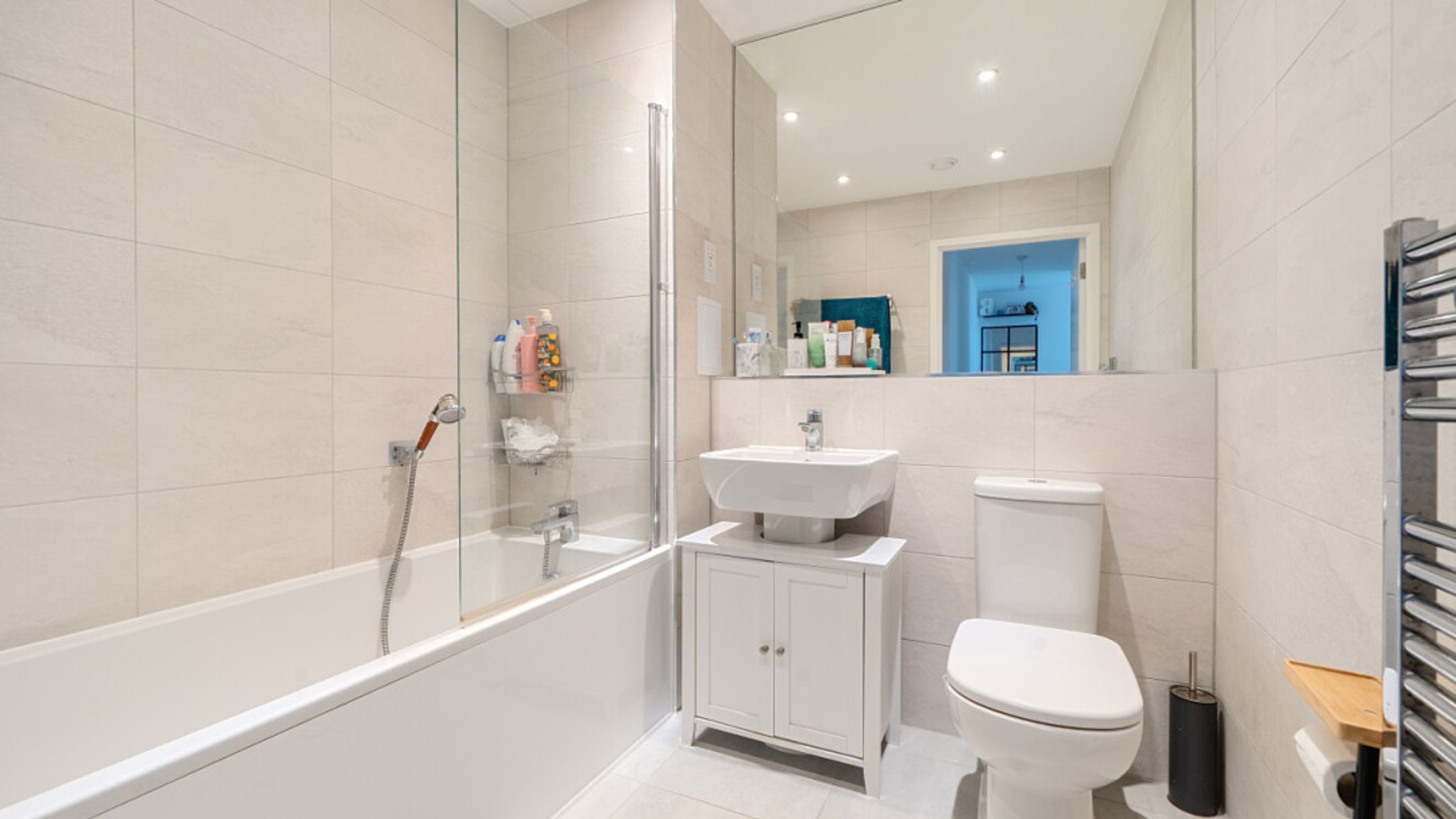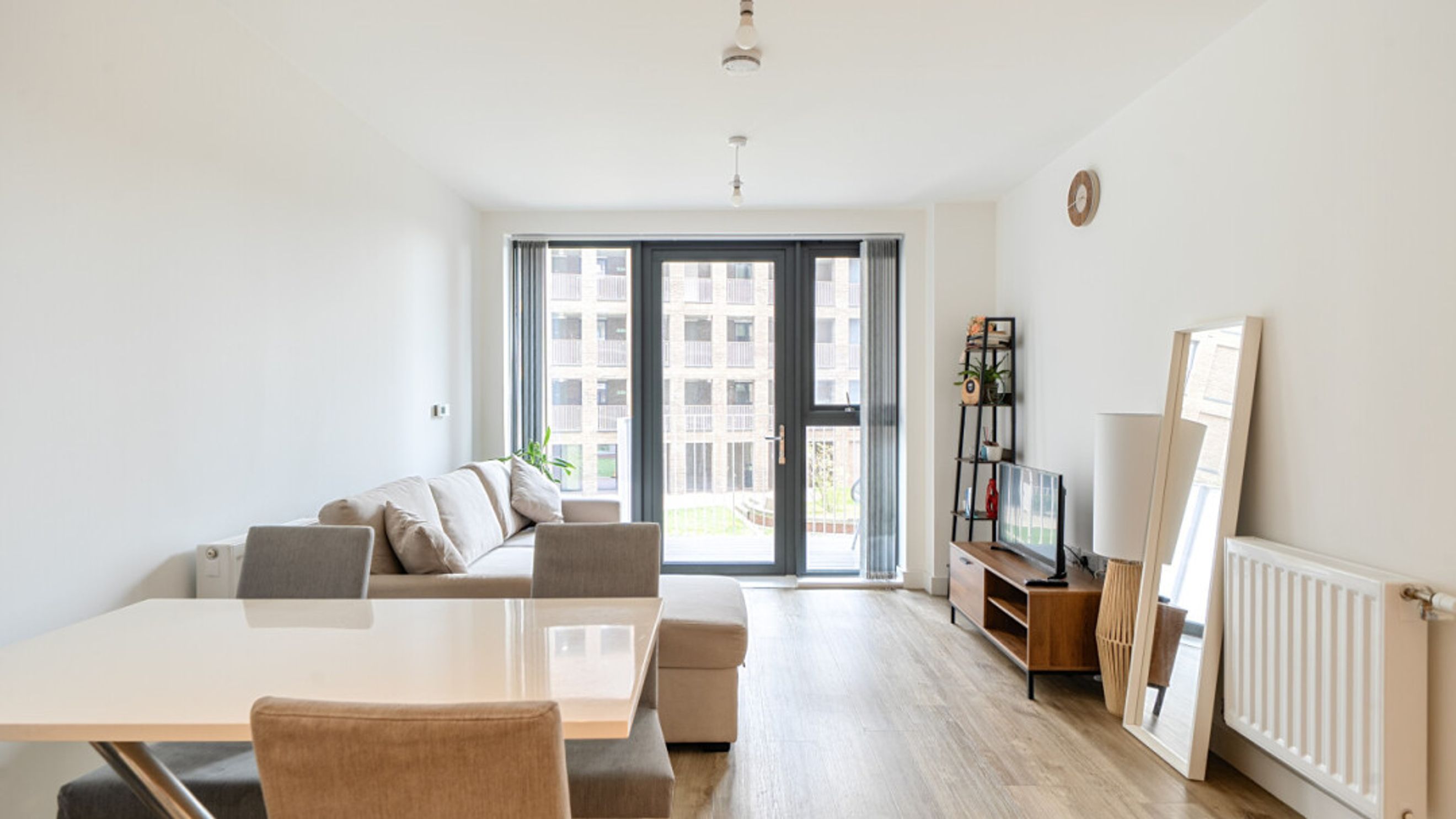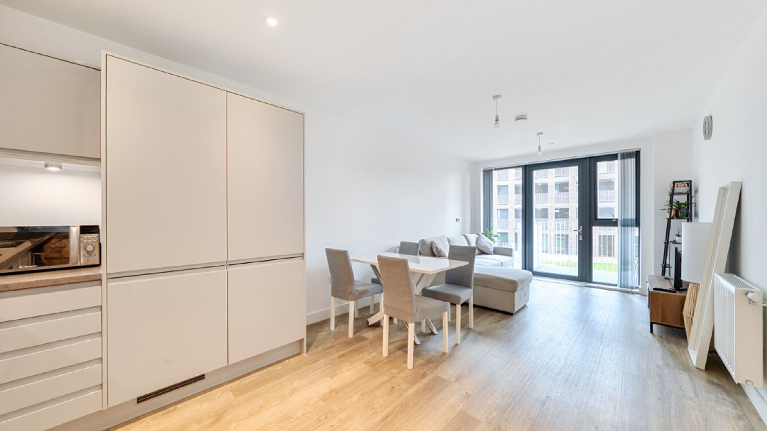 Enter this modern stylish dual aspect apartment via a spacious hallway with large storage cupboard. The large open living area incorporates a kitchen with generous storage and fully integrated appliances. The reception room opens onto a private south west facing balcony overlooking the communal gardens. There are two double bedrooms, the master with a ensuite shower room. A contemporary family bathroom serves the second bedroom.