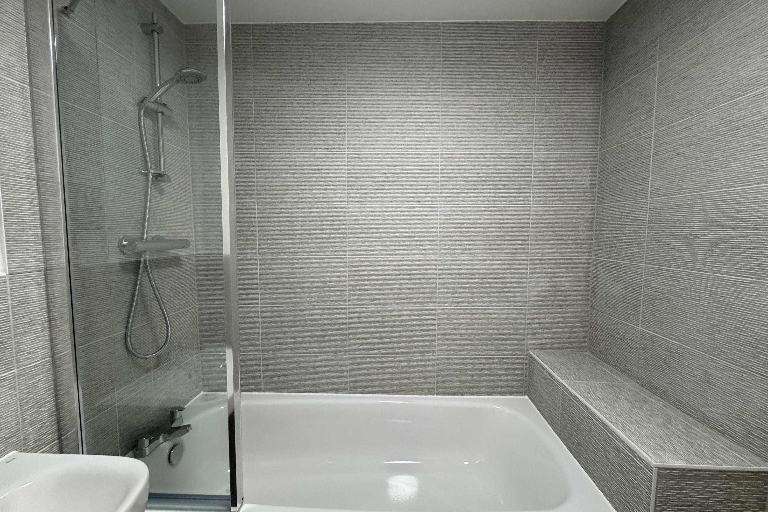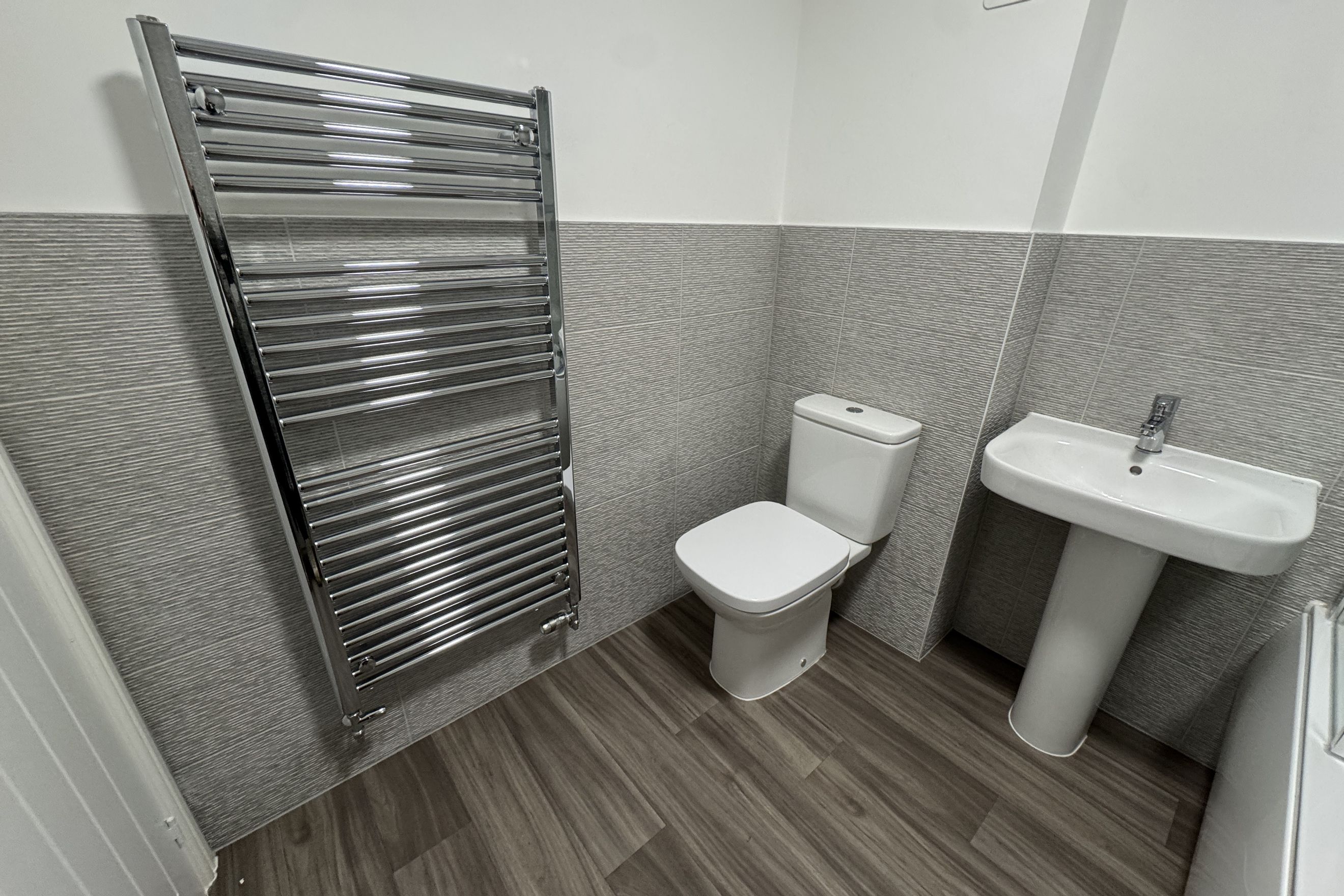 - Bathrooms: White bathroom suite with full-height tiling around the bath, a thermostatic shower over the bath, and a heated towel rail in both the main bathroom and downstairs WC.