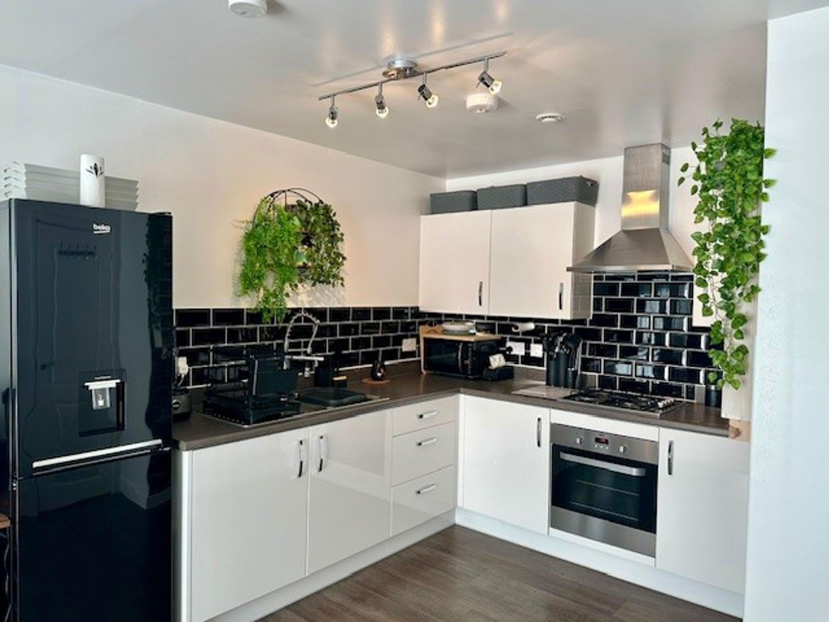 The living area comprises of an open plan lounge, dining and kitchen area. In the lounge are two double glazed windows, fitted blinds, fanlight with dimmer switch, tv point, radiator and door to cupboard, housing the Ideal boiler. The kitchen offers a range of modern eye and base level white gloss cupboards, with under unit lighting. There is a built in Zanussi oven, four ring gas hood with extractor hood over and space for an upright fridge/freezer. The kitchen also has laminate flooring, tiled splashbacks and smoke detector.