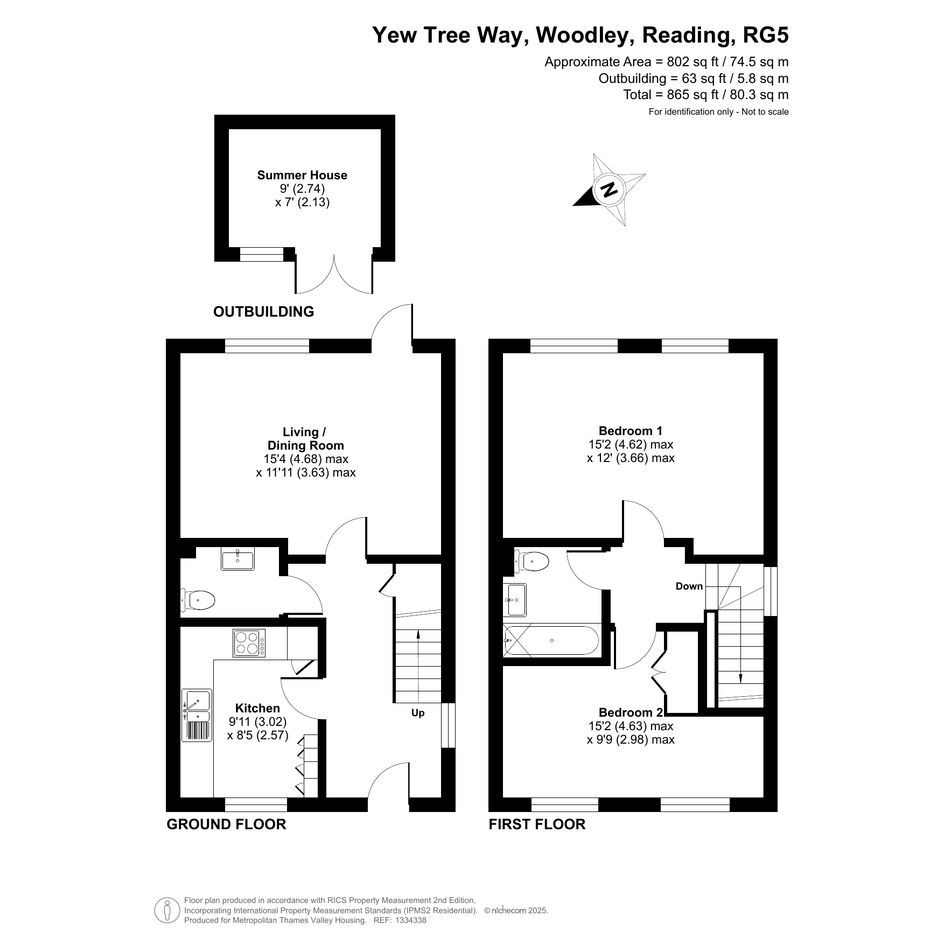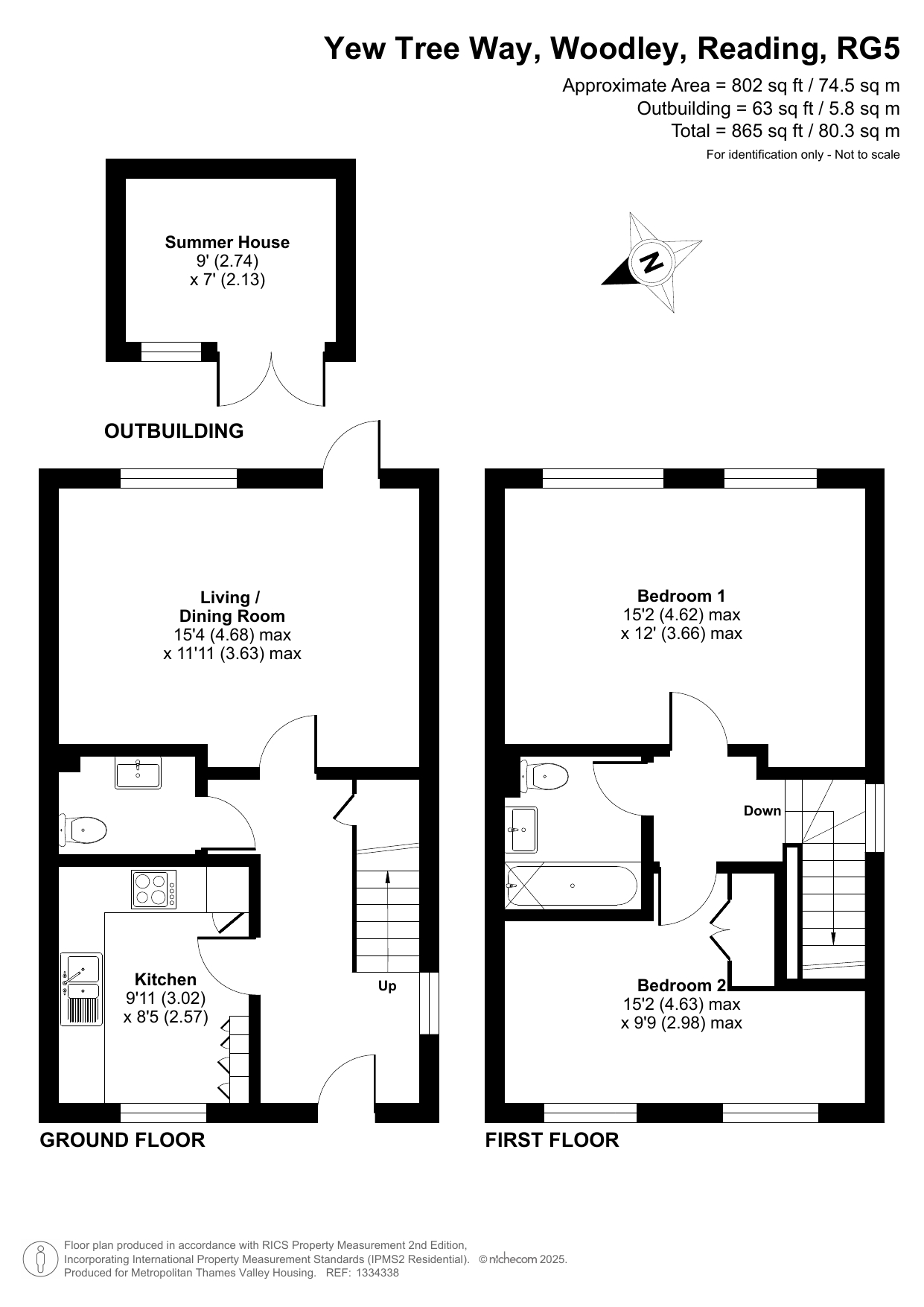 The property is spread across two floors, with the living room, a separate kitchen, and a toilet on the ground floor. The first floor features two bedrooms and a family bathroom.