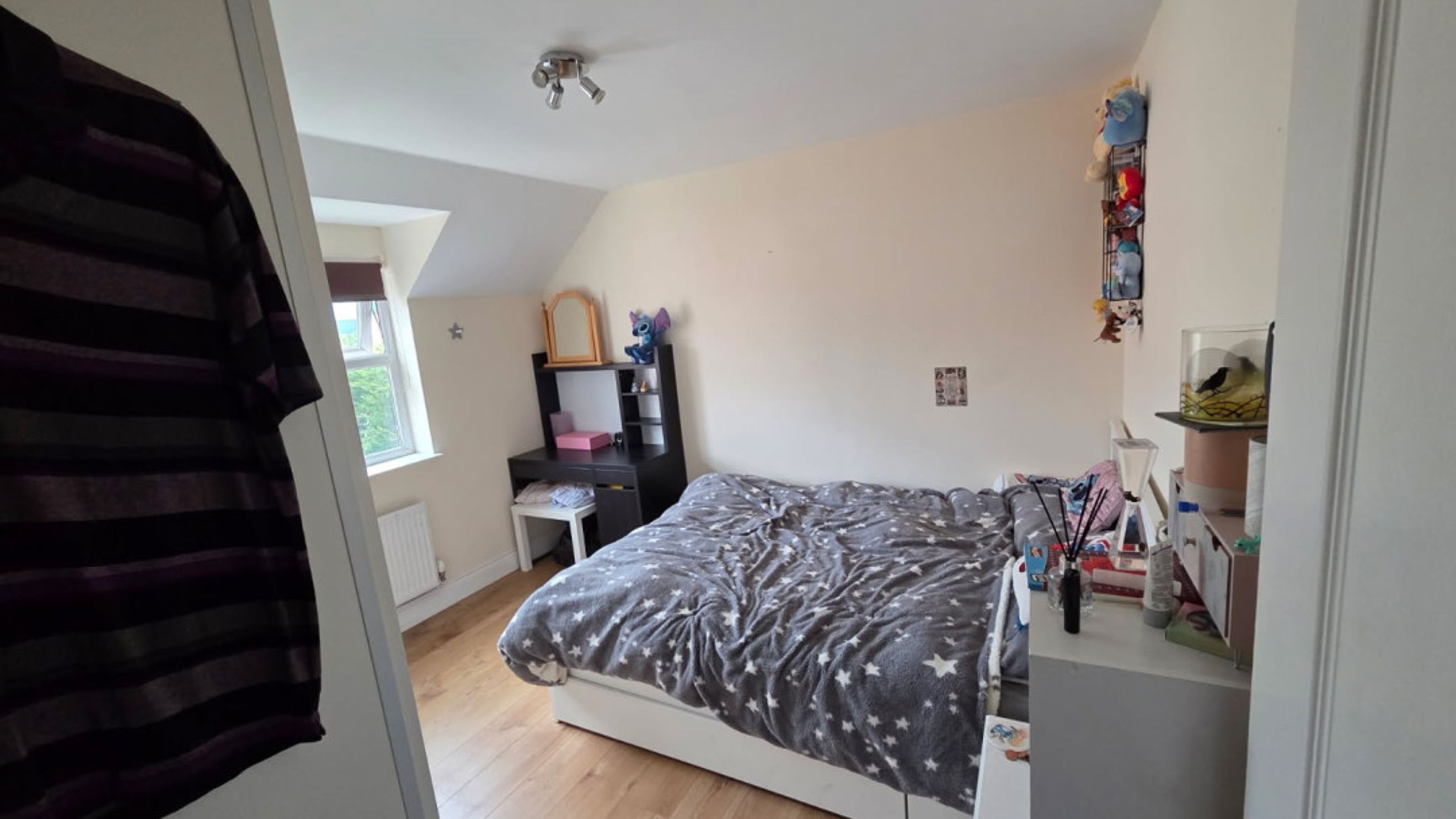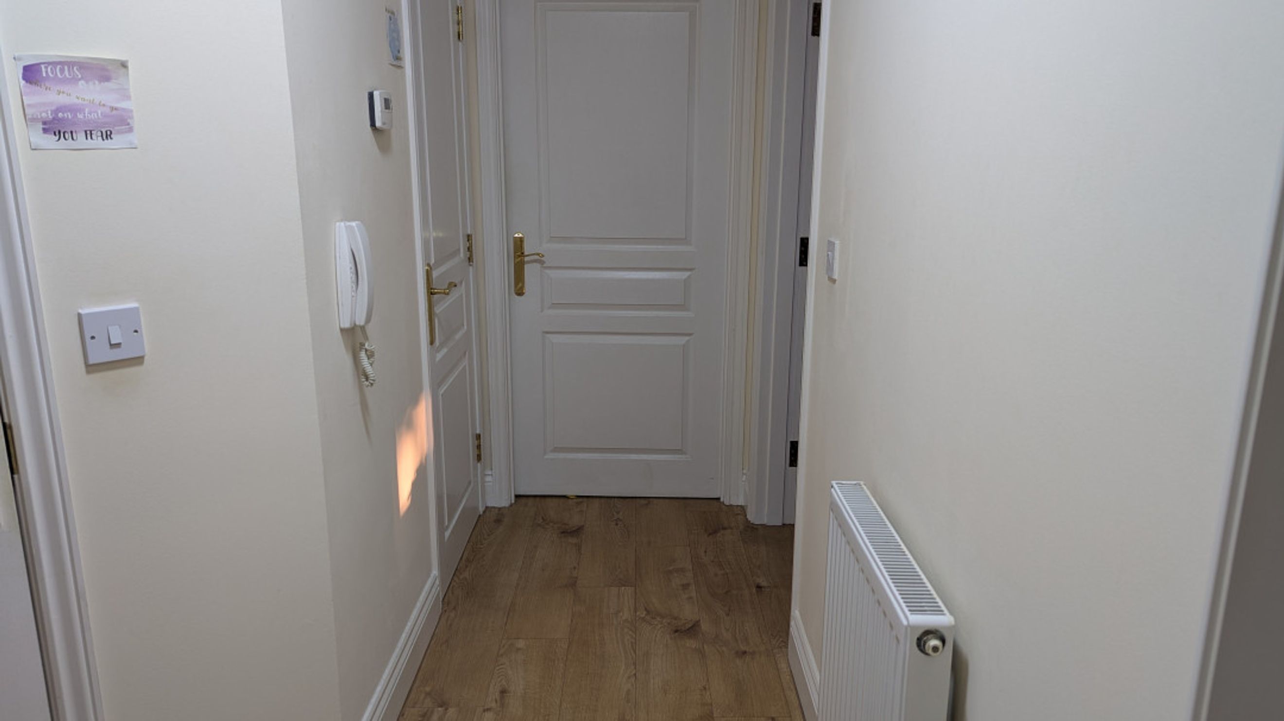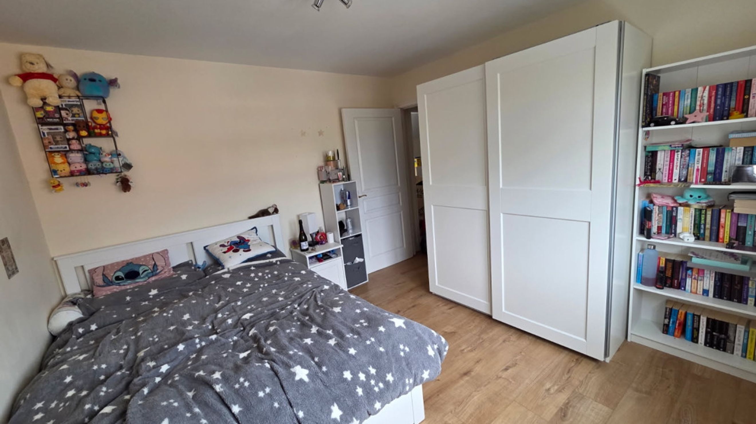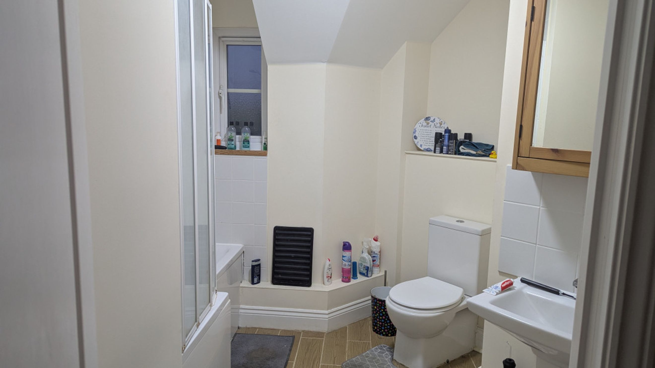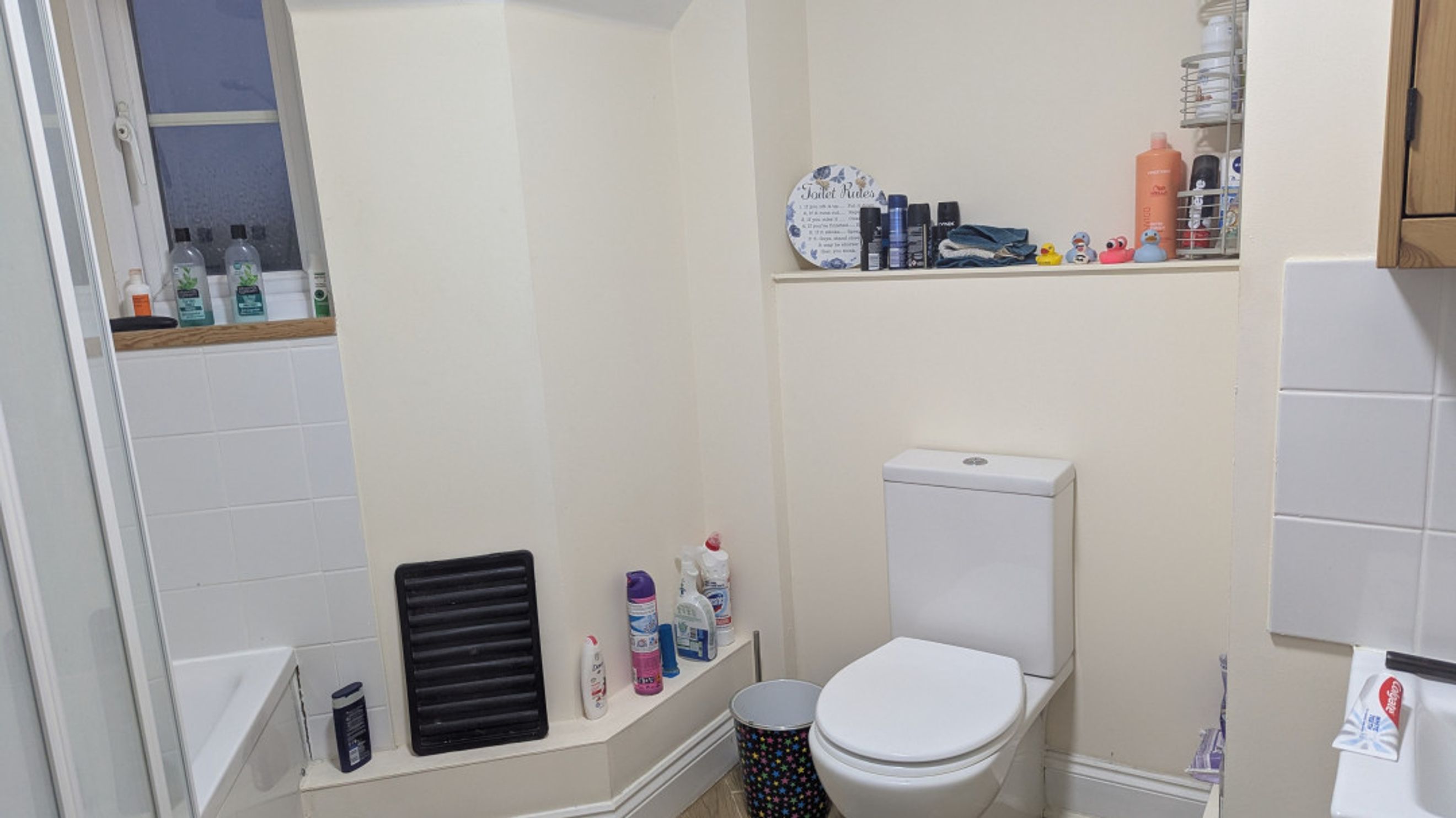 Both bedrooms are generously sized and benefit from sleek laminate flooring, offering comfort and versatility. The bathroom is finished with a clean white suite, shower over the bath, and partially tiled walls in crisp white for a fresh, modern feel.
