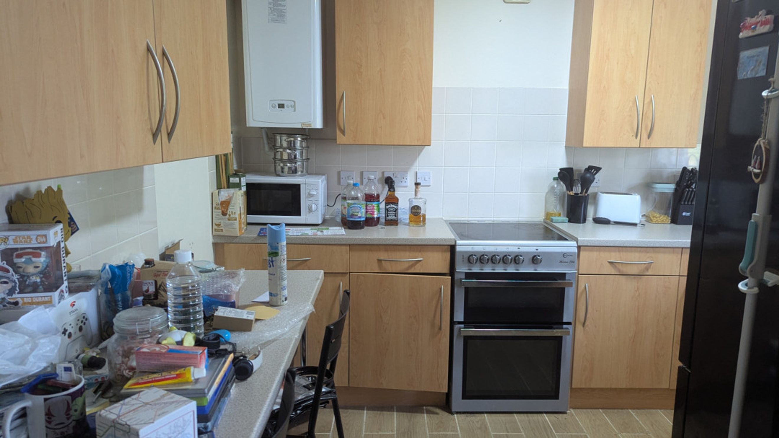 It includes a telephone point, TV aerial point, and SKY/cable connection, making it ideal for relaxing or entertaining. The adjoining kitchen is thoughtfully designed with laminate flooring, an electric hob, gas oven, and ample space for a fridge/freezer and washer/dryer.
