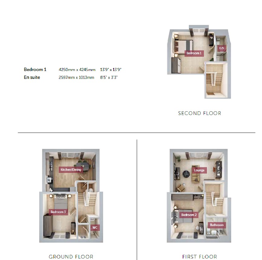 The Romney offers modern, versatile living across three thoughtfully designed floors, complemented by a south-east facing garden. The ground floor features an open-plan kitchen/dining area with French doors opening to the rear garden, a front-aspect double bedroom that’s ideal for use as a home office, and a convenient downstairs WC. On the first floor, you’ll find a spacious living room with a Juliet balcony, a second double bedroom, and a contemporary family bathroom. The private top floor is dedicated entirely to bedroom one, which includes a sleek en-suite. This home benefits from a single garage and two parking spaces.