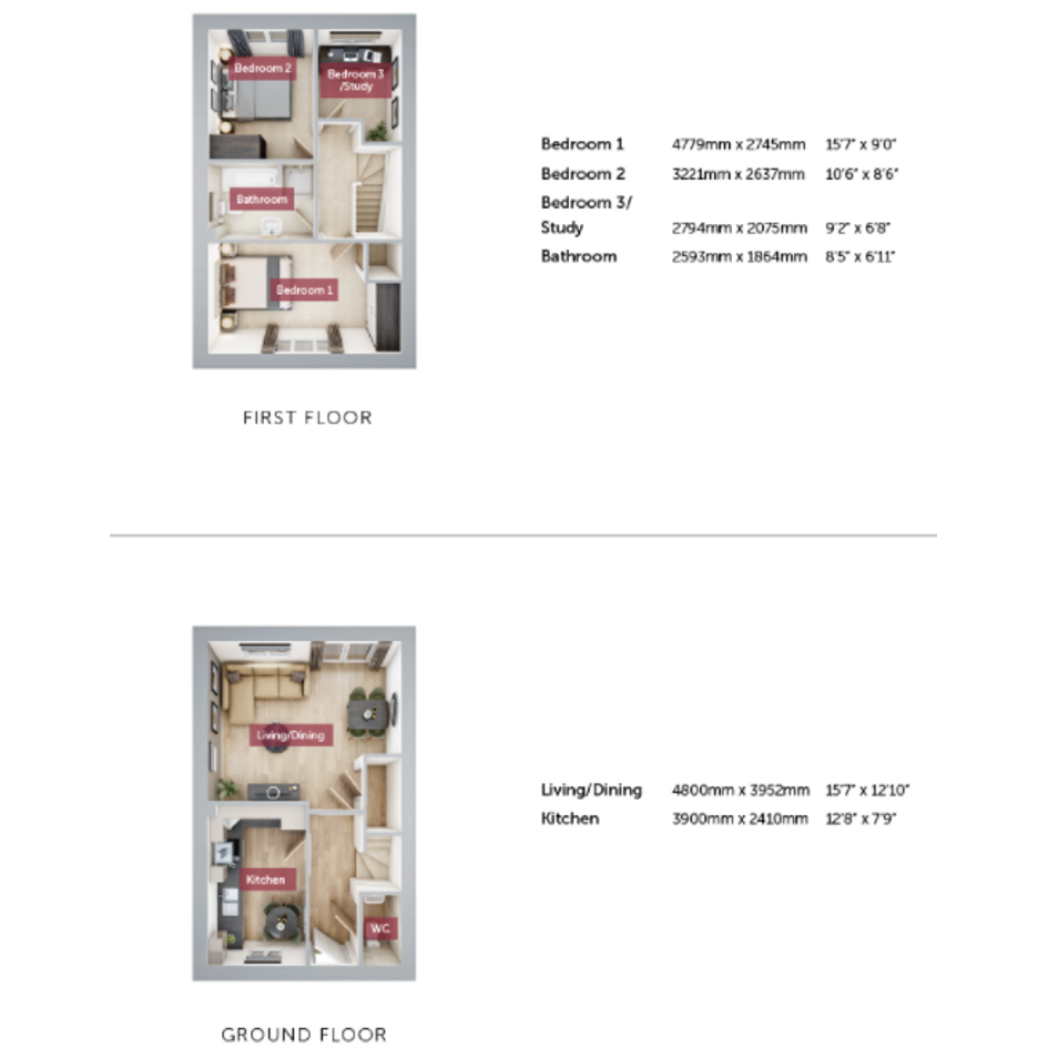 The Brampton is a beautifully designed home, featuring a light-filled living/dining room at the rear, with French doors opening to a south-east facing garden, creating a perfect space for entertaining and family gatherings. At the front, a modern kitchen offers a practical and stylish cooking area, while a downstairs WC and a convenient storage cupboard complete the ground floor. Upstairs, bedroom one stretches across the front and includes a second storage cupboard, while bedroom two provides a spacious double, and bedroom three serves as a flexible single, ideal for a study or playroom. This home also benefits from a single garage and two parking spaces.