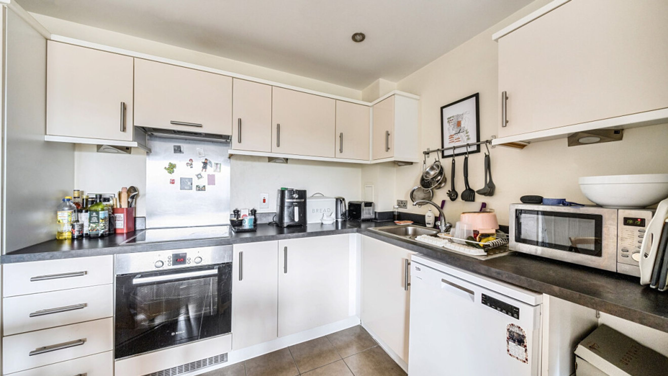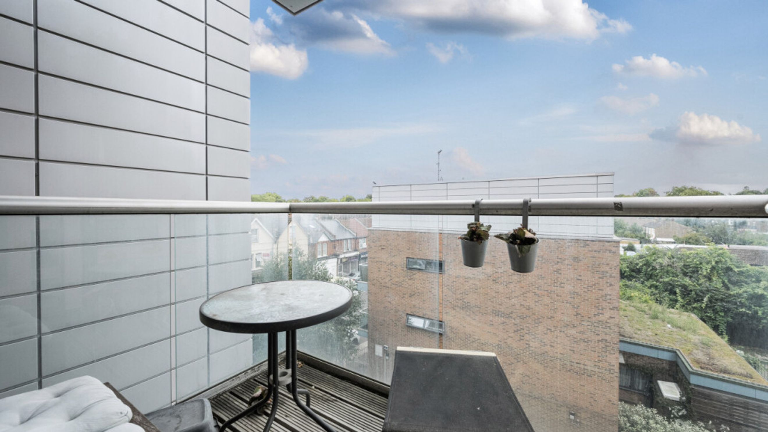 Enter this third floor apartment via a hallway with two storage cupboards. The east facing open plan living area opens onto a private balcony with rooftop views. The modern kitchen incorporates integrated appliances. A bedroom and part tiled bathroom complete the accommodation.