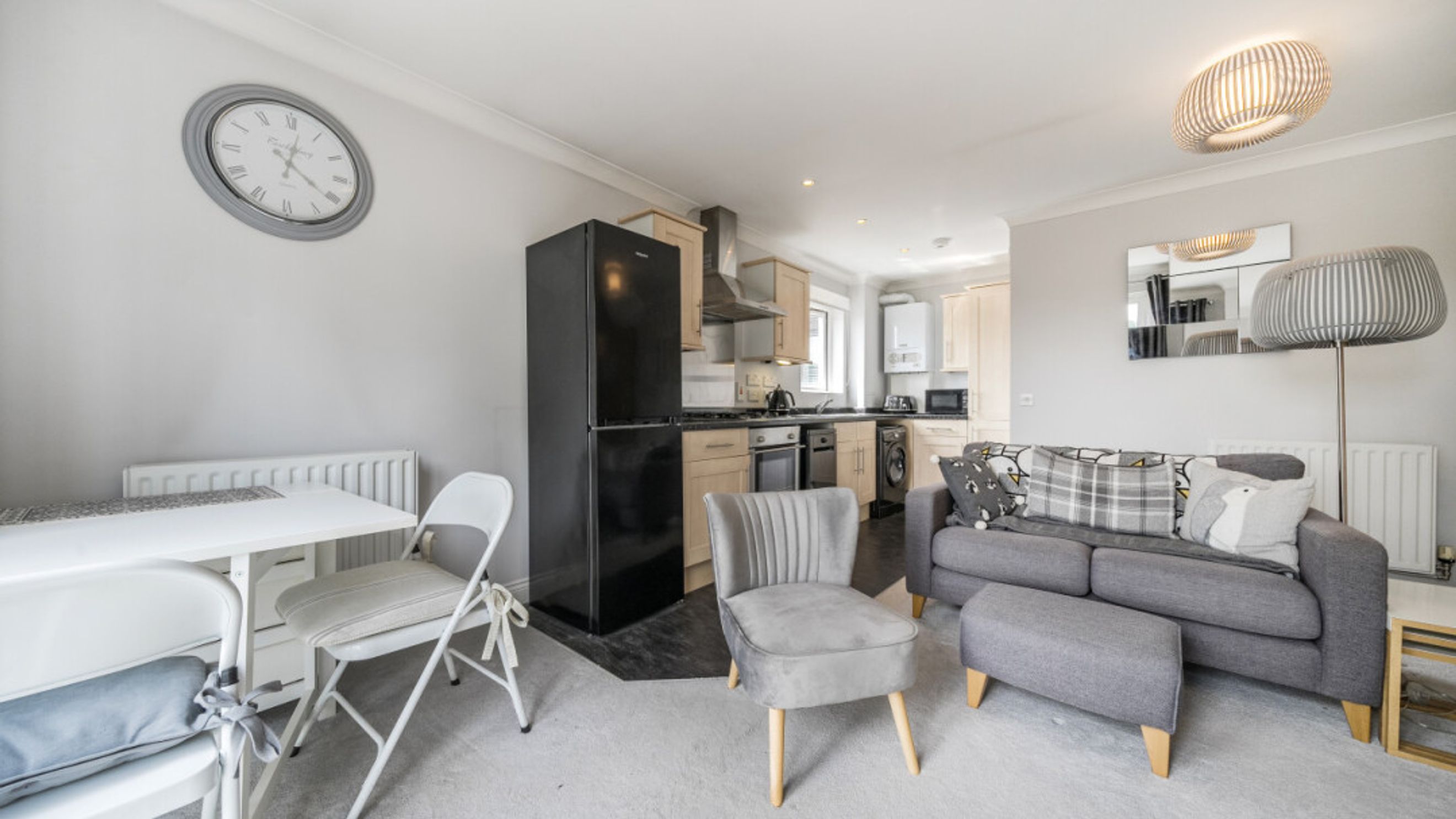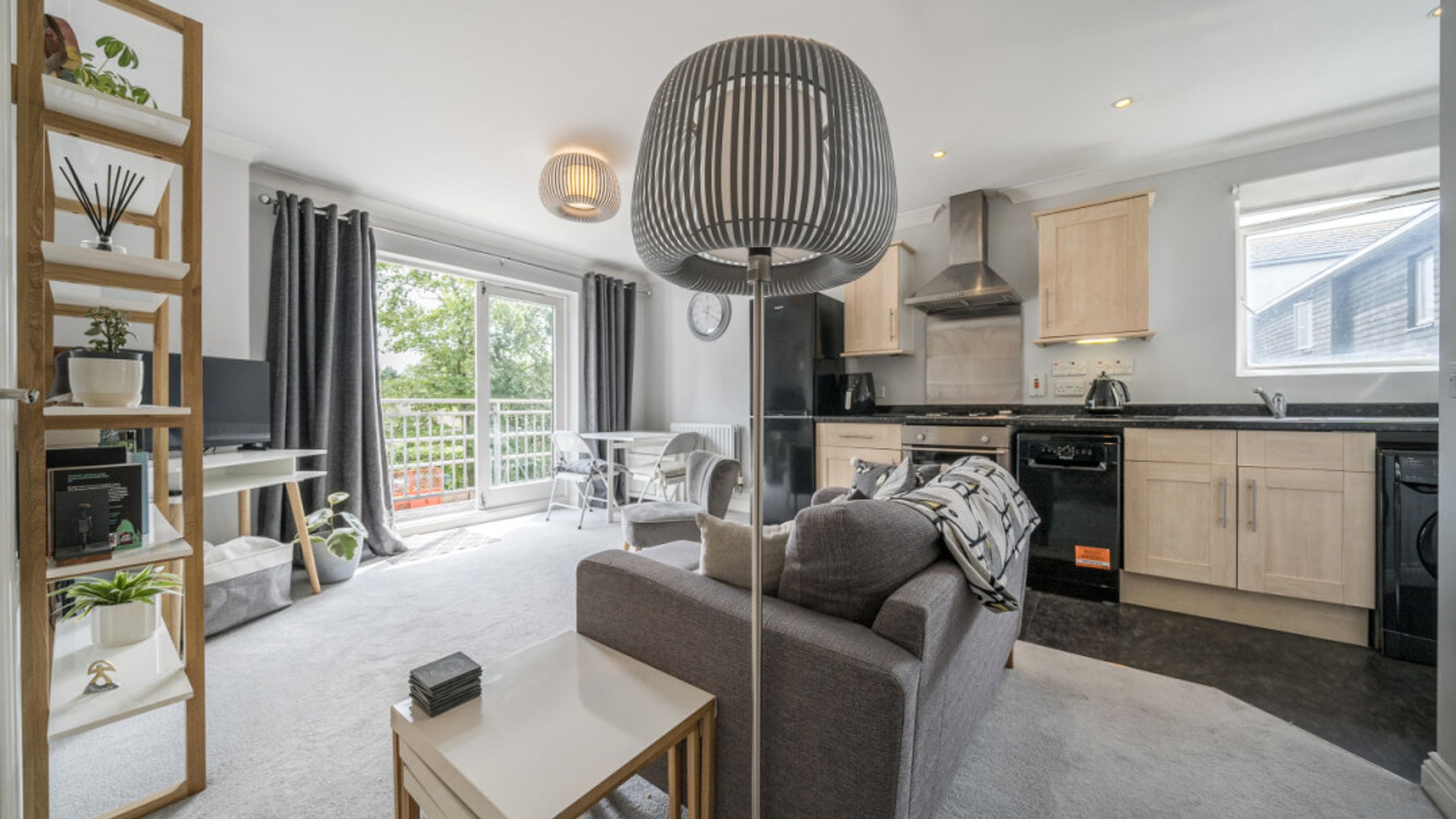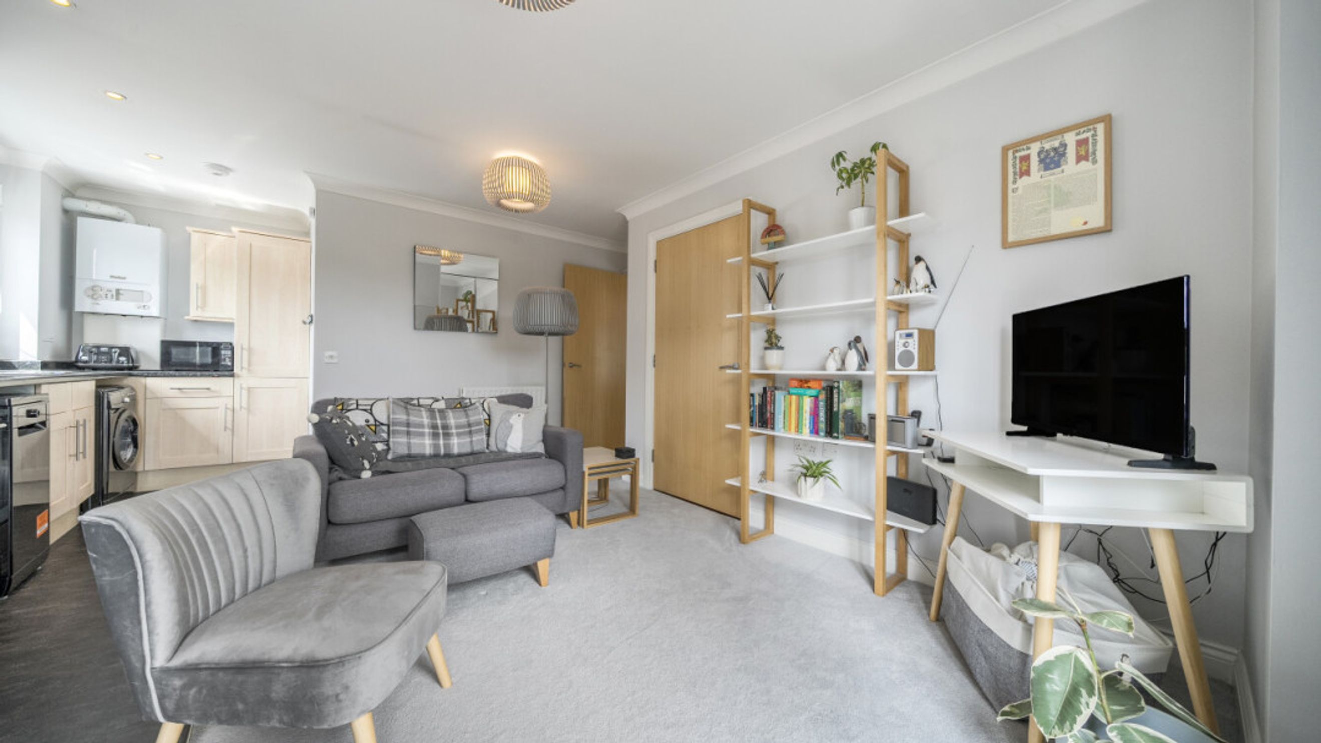 Enter this larger than average well presented apartment via a spacious entrance hall with storage. A generous dual aspect open plan living area, with additional storage cupboard, opens onto a south facing balcony. The kitchen is fitted with a range of Beech units with black worktops and inludes an integrated oven, hob and extractor and spaces for your appliances. A south facing well proportioned bedroom with in-built storage and a contemporary bathroom complete the accommodation.