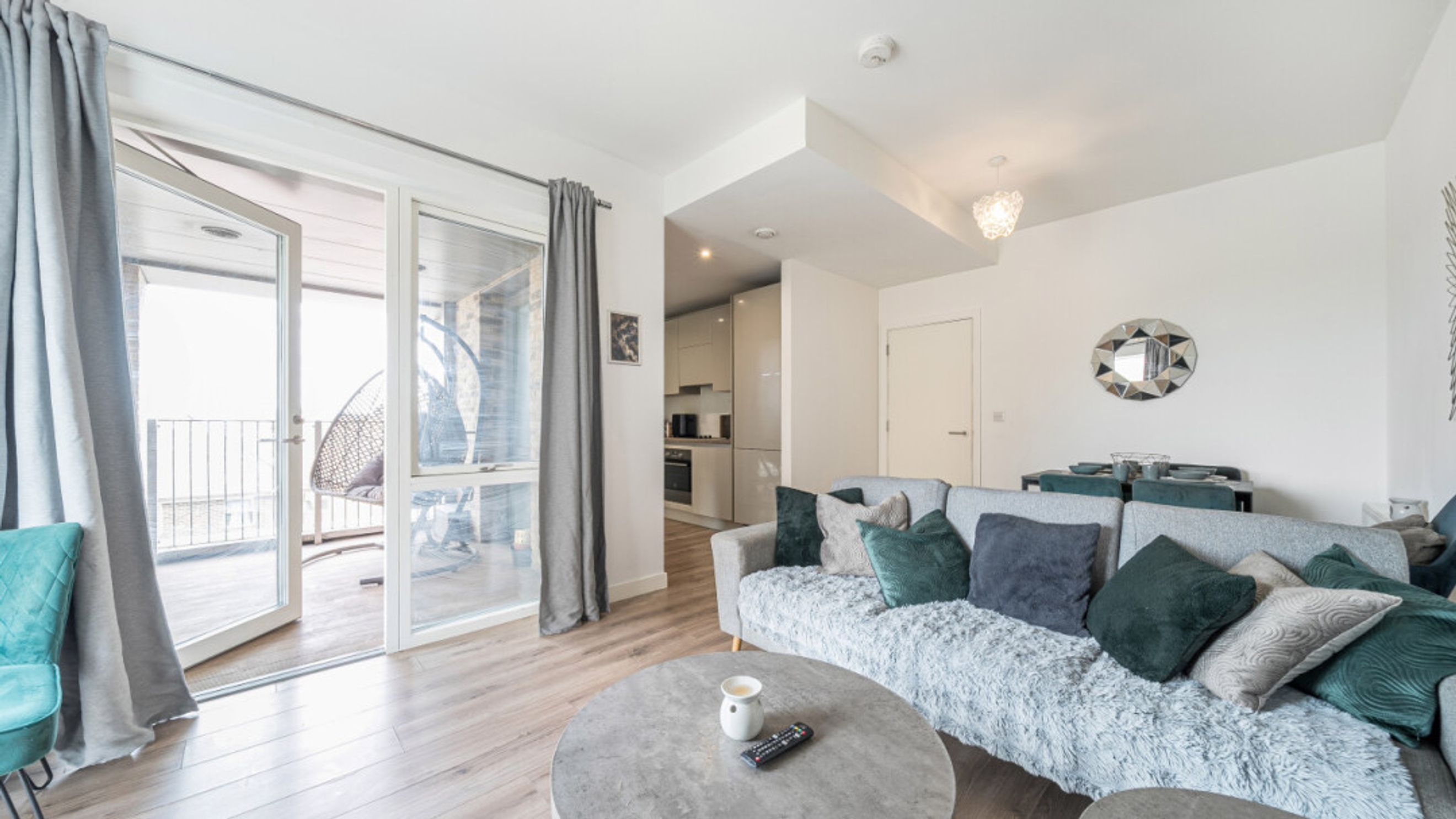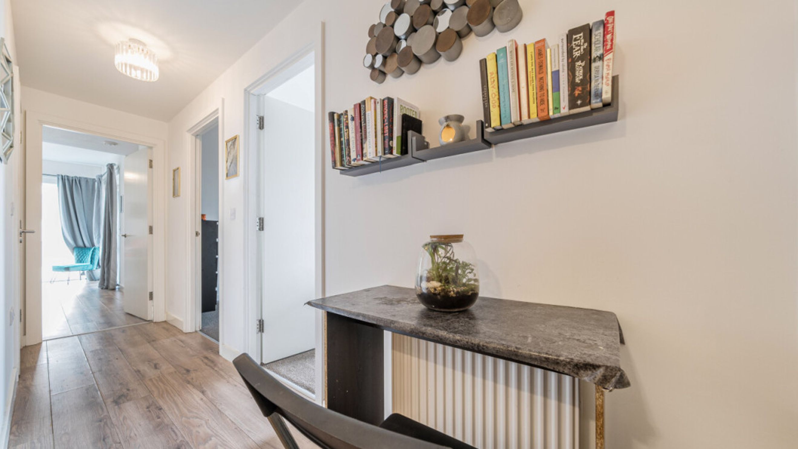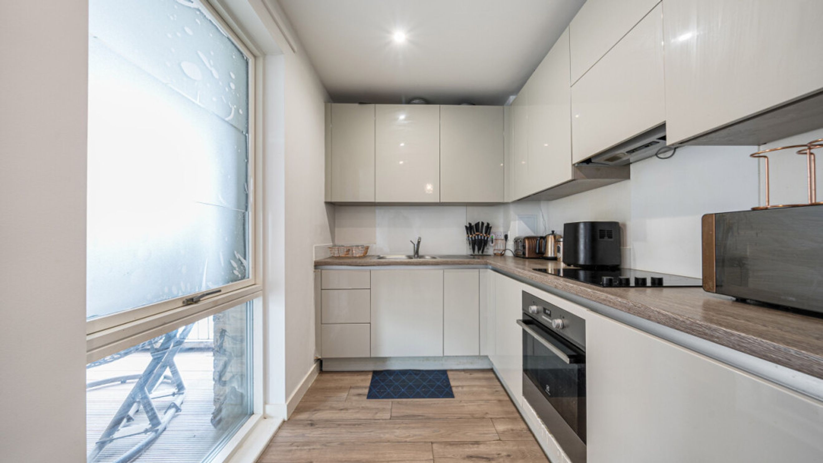 The hallway of this bright and spacious dual aspect two-bedroom apartment includes three large strorage cupboards. A stylish open plan living area, flooded with natural light from wide floor-length windows and door opens onto a generous private east facing balcony. The kitchen, fitted with modern high gloss units finished with a wood effect worktop, benefits from integrated appliances including a fridge freezer, oven, hob and extractor fan. There are two well proportioned bedrooms and a contemporary bathroom complete with a white three-piece suite with a shower over bath and a tile surround.