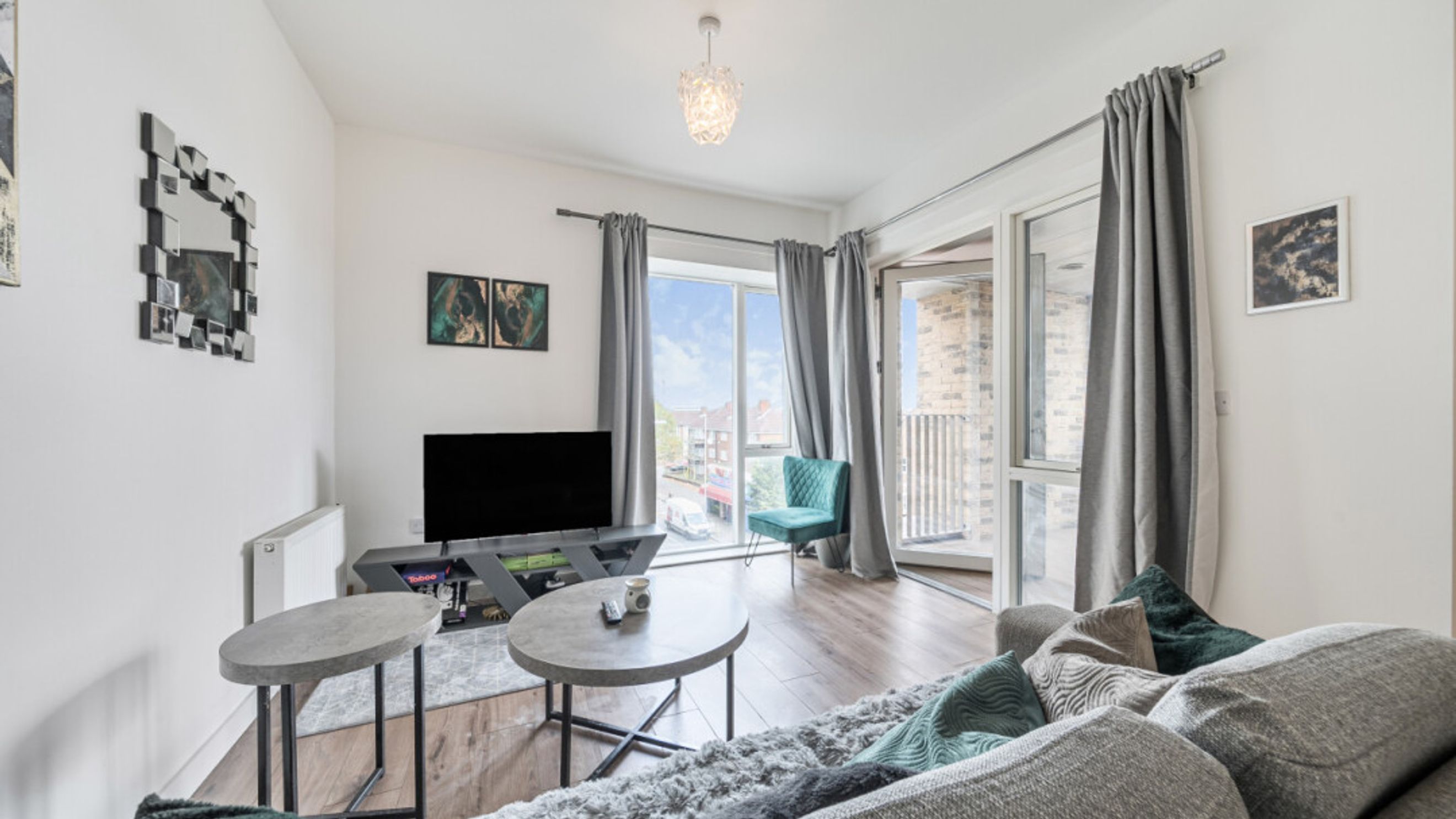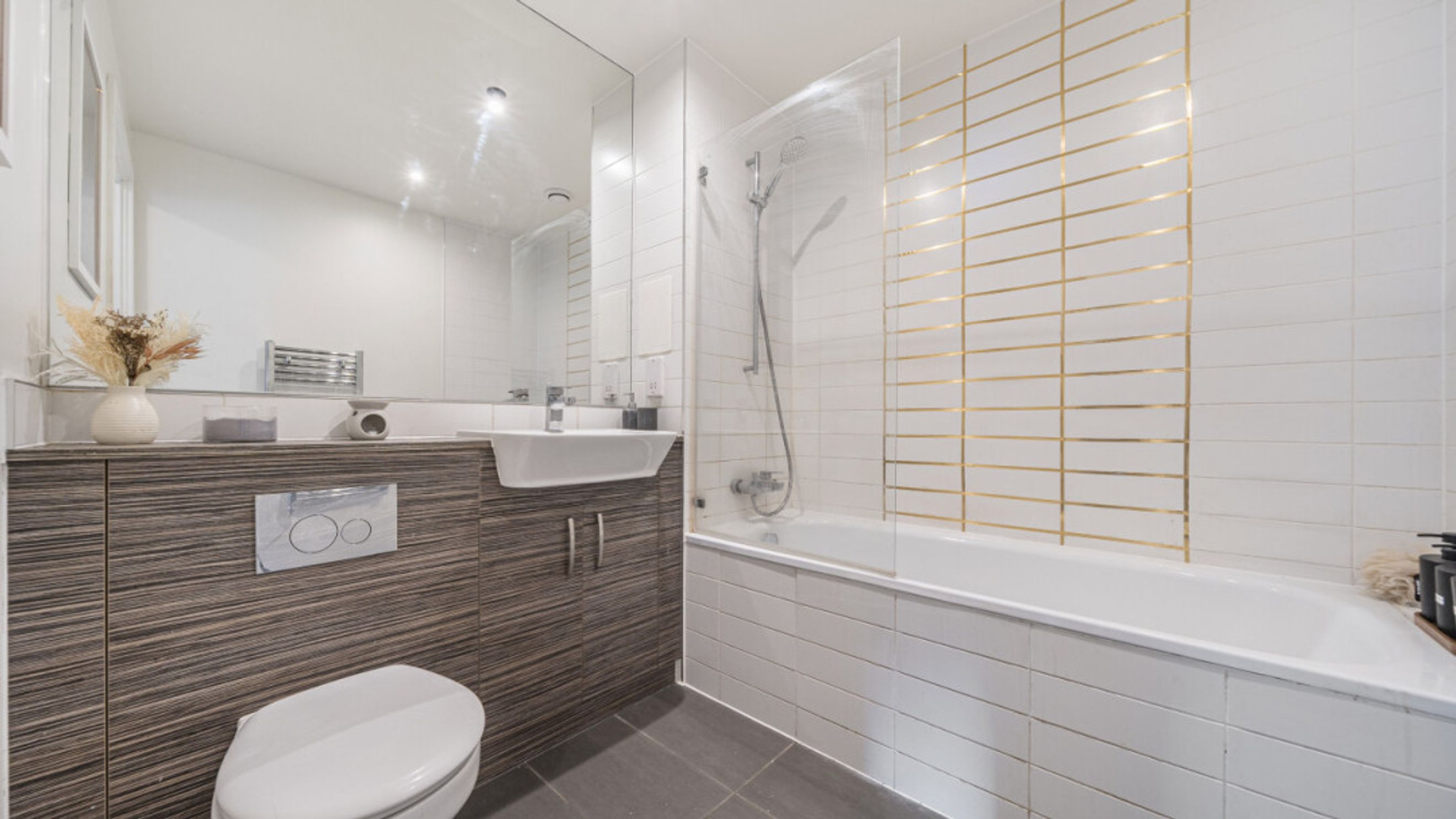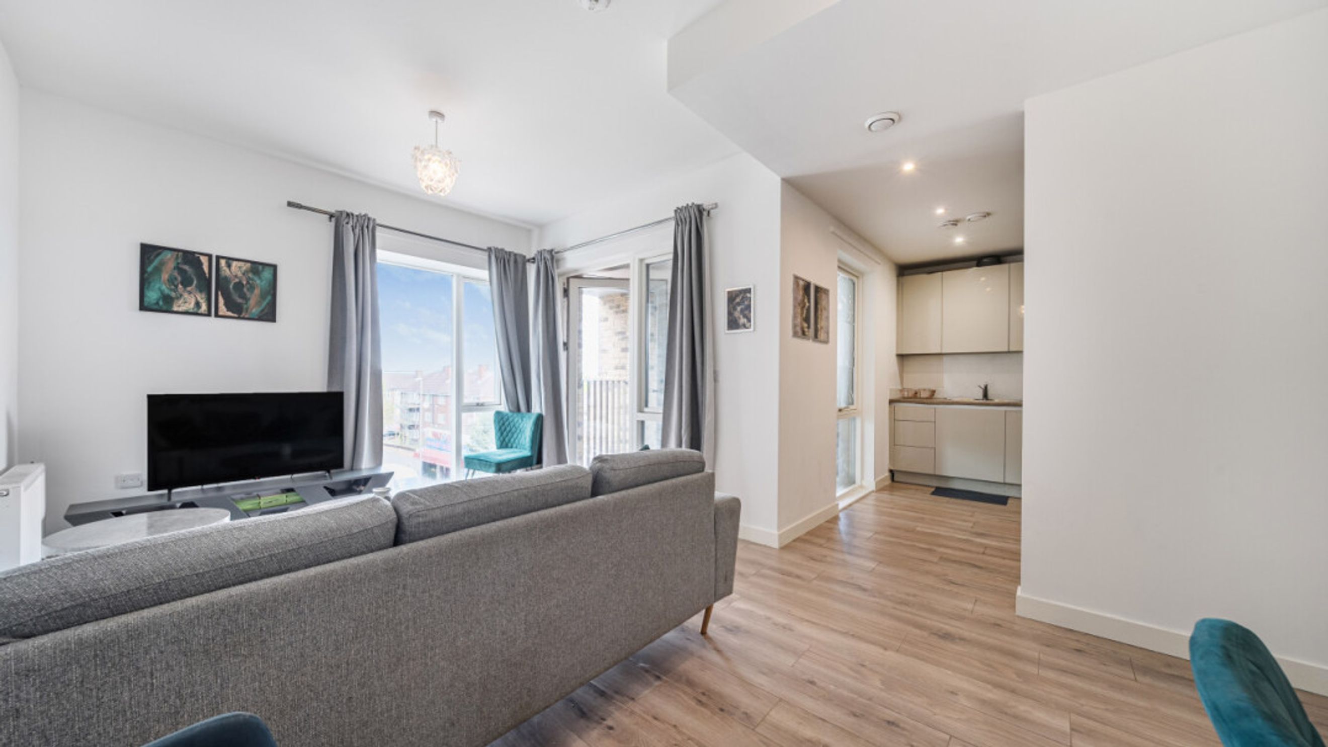The hallway of this bright and spacious dual aspect two-bedroom apartment includes three large strorage cupboards. A stylish open plan living area, flooded with natural light from wide floor-length windows and door opens onto a generous private east facing balcony. The kitchen, fitted with modern high gloss units finished with a wood effect worktop, benefits from integrated appliances including a fridge freezer, oven, hob and extractor fan. There are two well proportioned bedrooms and a contemporary bathroom complete with a white three-piece suite with a shower over bath and a tile surround.