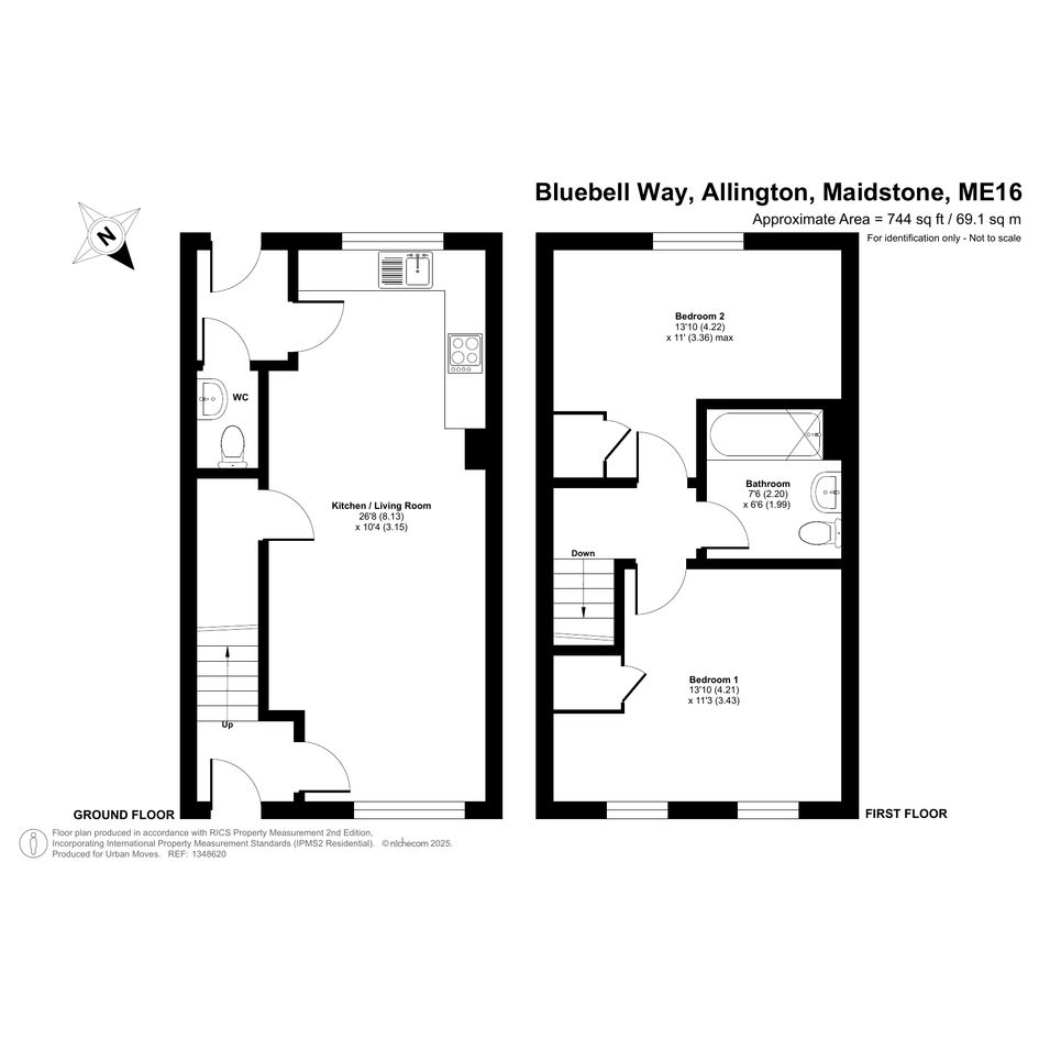 This modern, smartly-presented property forms one end of a short, four-house terrace and the favourable position allows the south-west-facing garden to be larger than those of the neighbouring properties. The internal layout is open-plan with a full-length kitchen/reception room which includes an under-stairs storage cupboard. A small rear hall provides access to a ground-floor cloakroom/WC as well as to the garden. On the first floor are two generously-sized bedrooms and a simple yet stylish bathroom. Well insulated walls, roof and floor, high performance glazing and gas central heating all contribute towards a very good energy-efficiency rating. The house comes with two parking spaces and is also just a short walk from Mid Kent Shopping Centre, which includes a Waitrose supermarket along with a selection of other stores. Allington Primary School is only minutes from Bluebell Way and Ofsted-rated 'Outstanding'.