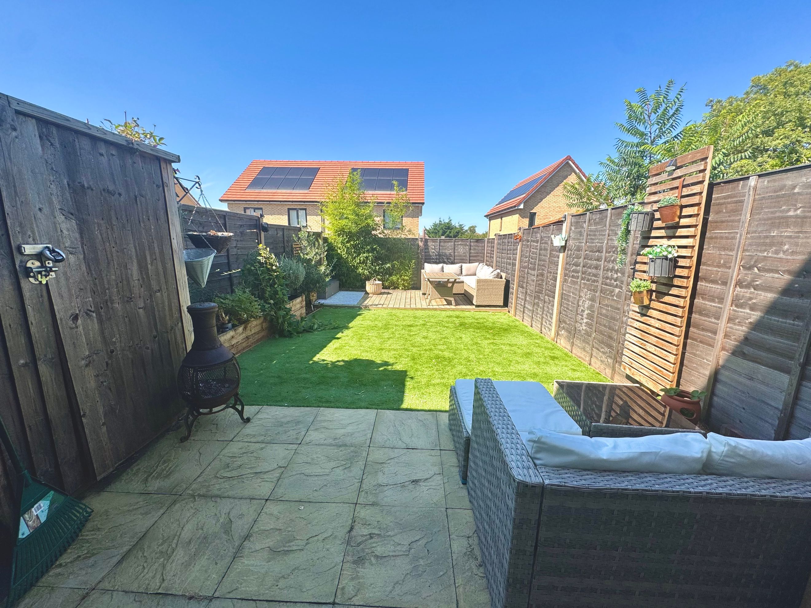 Extended patio, premium artificial grass, built-in planter, and large wooden decking