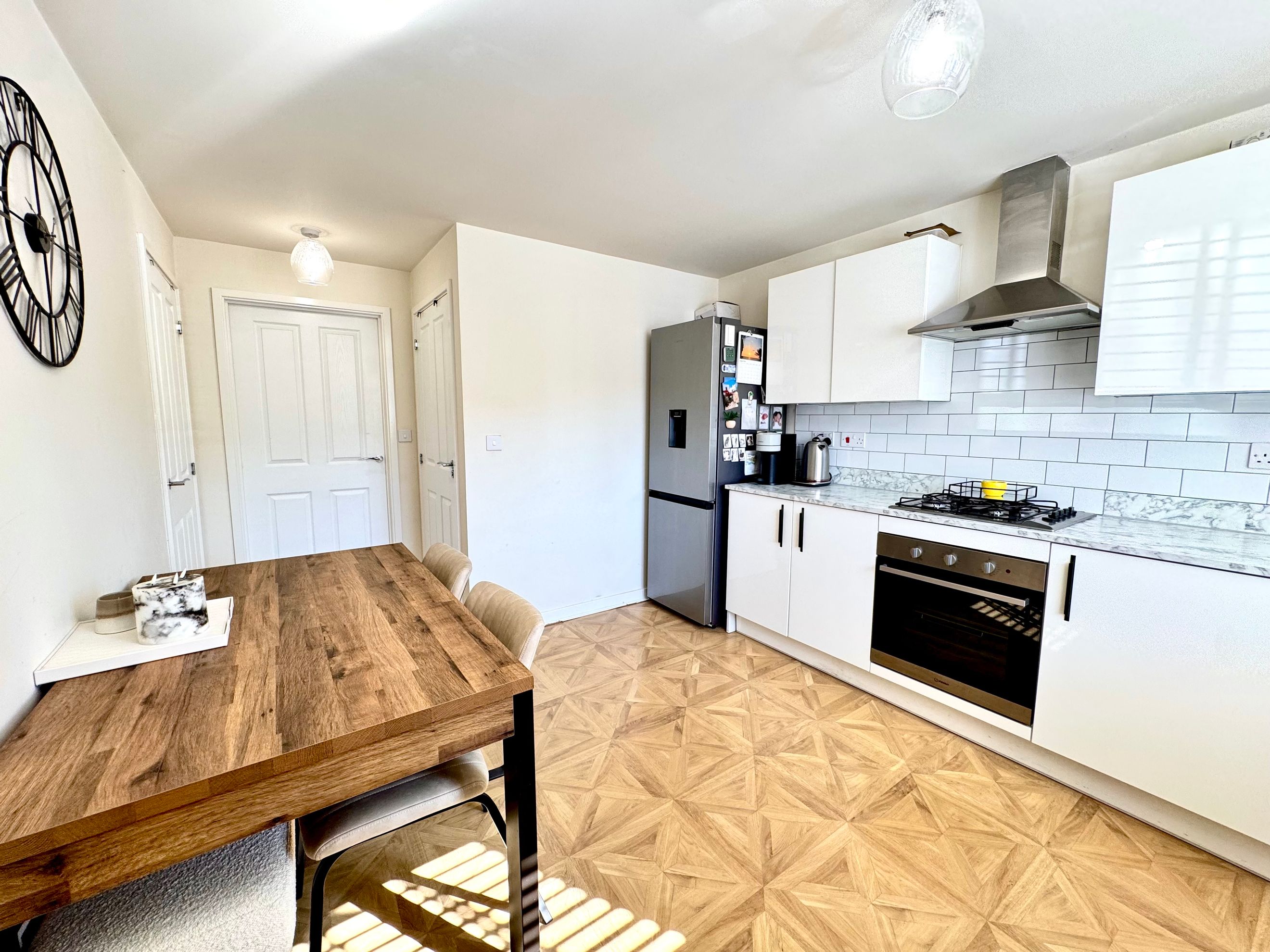 Inside, you'll find a spacious kitchen/diner with a full-wall tiled splashback, upgraded cupboard handles, and a large under-stairs storage cupboard with power—ideal for a tumble dryer or pantry space. The separate living room overlooks the newly landscaped garden and features professionally tinted patio doors for privacy and an additional Ethernet port.