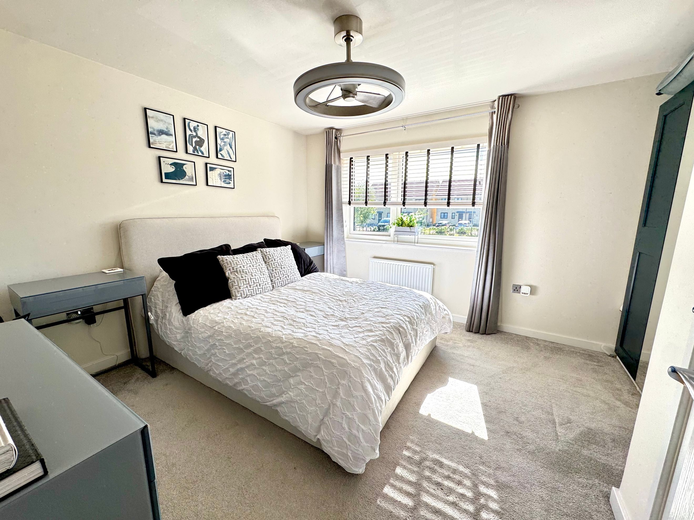 Upstairs, both double bedrooms are generously sized with large windows. Bedroom 1 includes a deep alcove perfect for a built-in wardrobe and a large cupboard above the stairs. Bedroom 2 has been recently redecorated with neutral panelling and includes an Ethernet port for a dedicated work area.