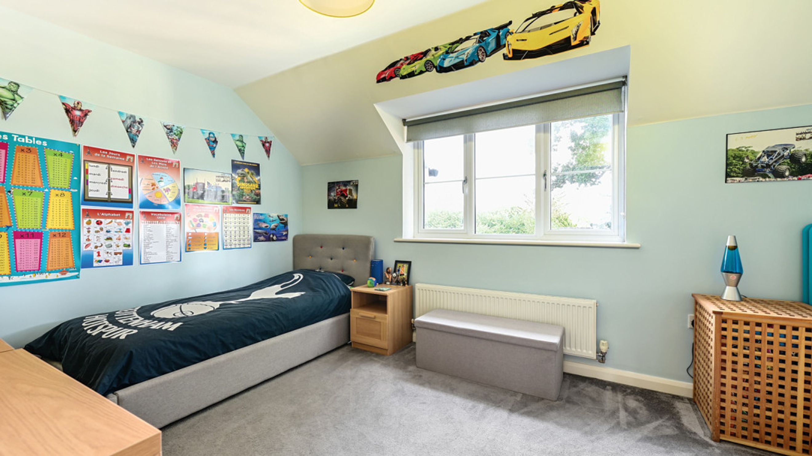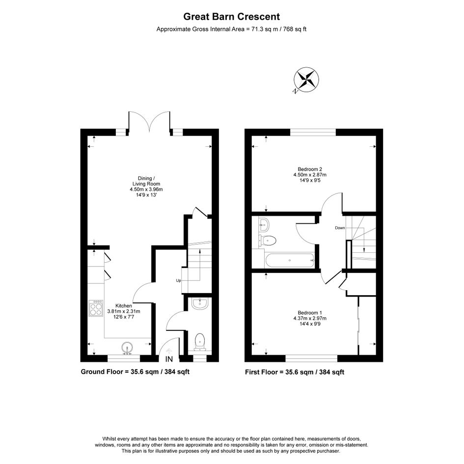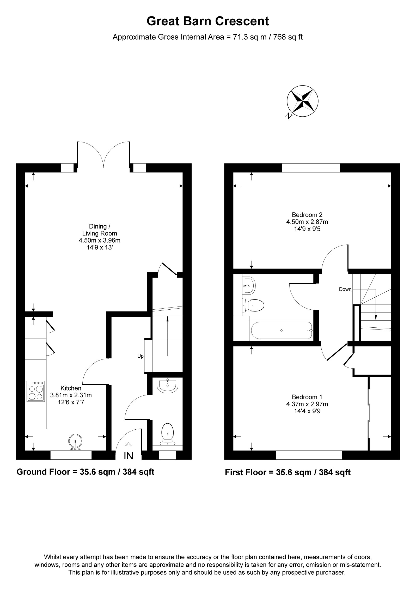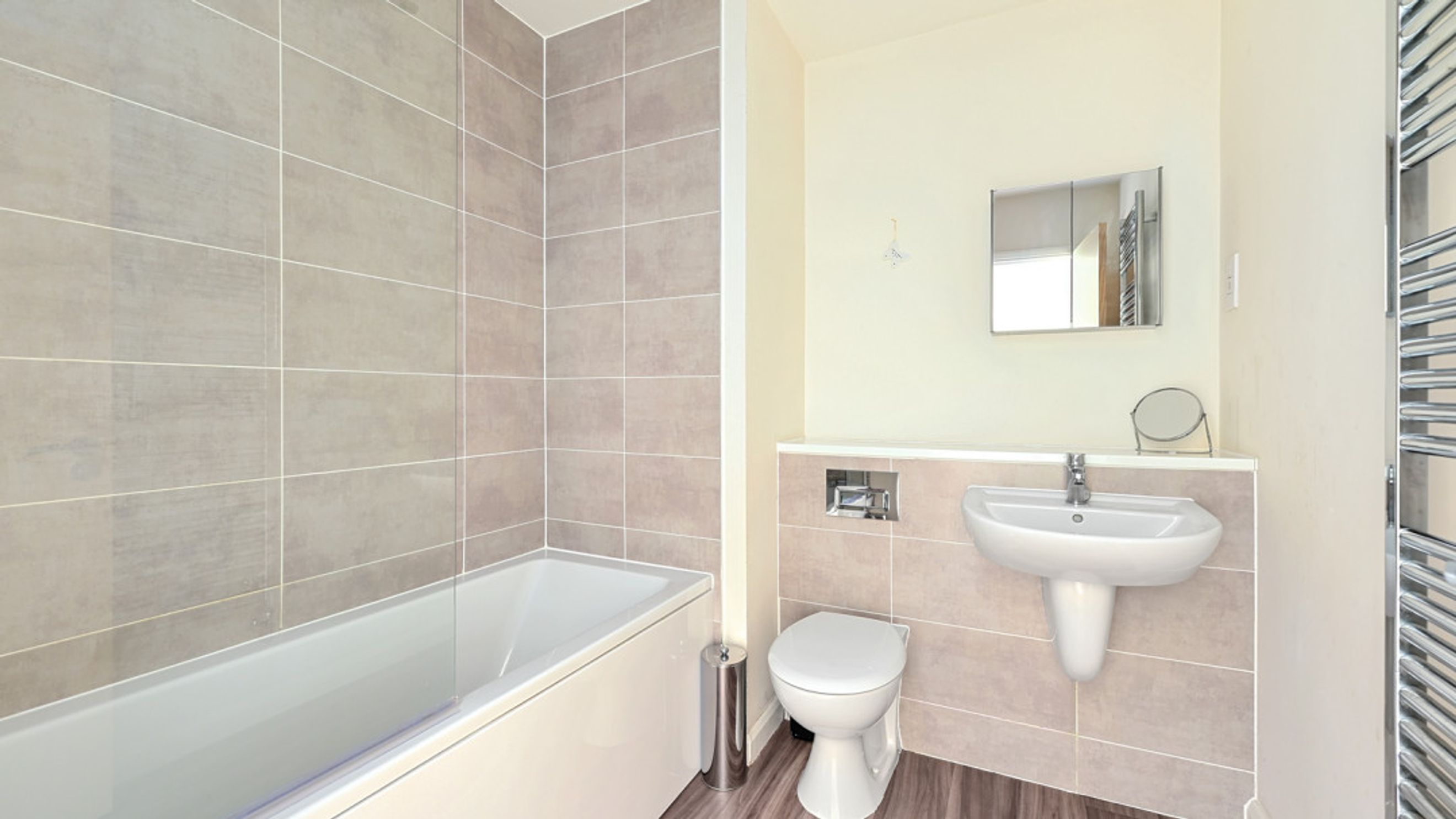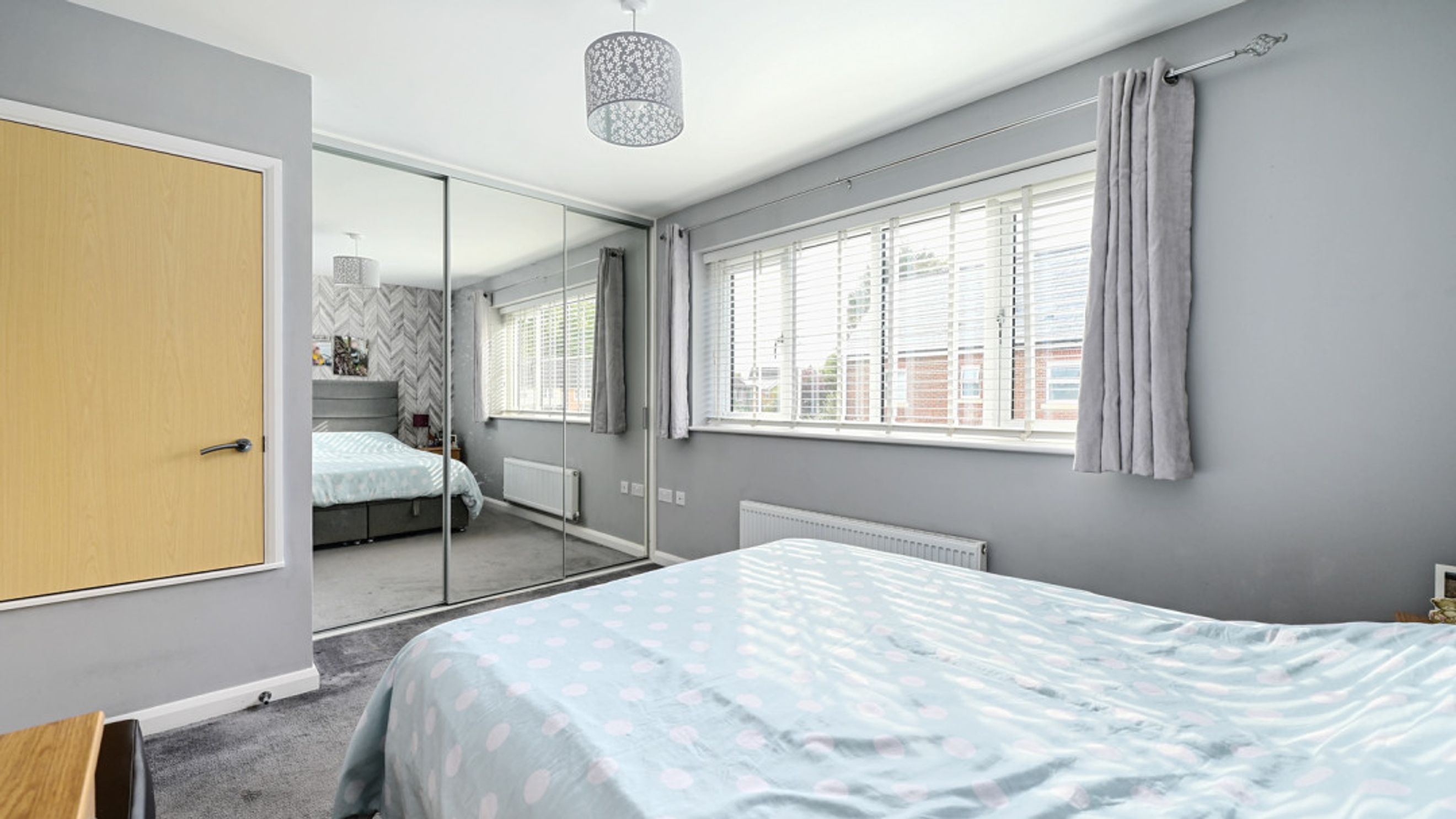 Upstairs, you'll find two generously sized, carpeted bedrooms. The main bedroom benefits from a fitted wardrobe and an airing cupboard, offering ample storage. The family bathroom features a clean white suite, laminate flooring, a shower over the bath, and partial tiling for a contemporary finish.