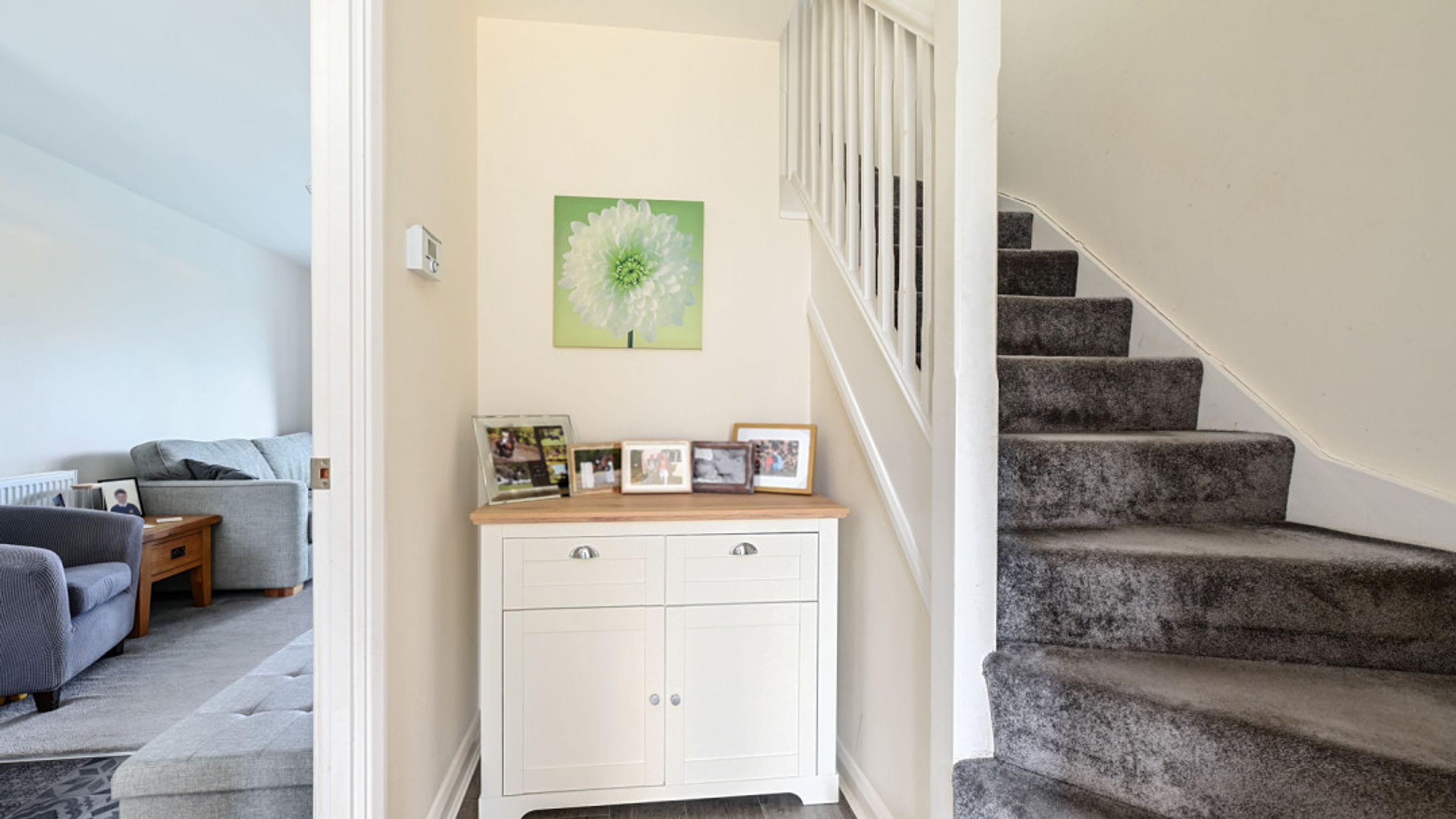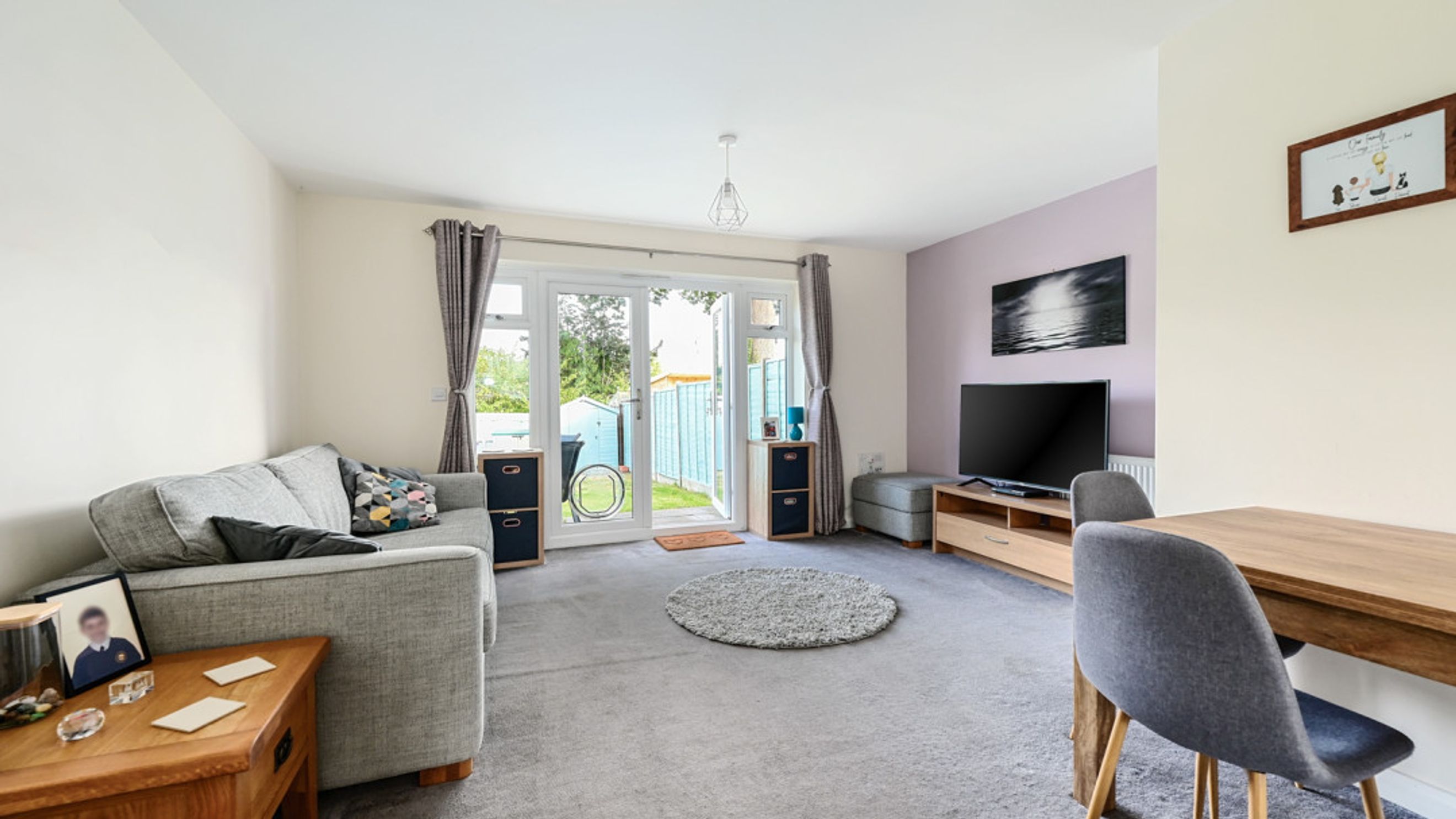 Upon entering, you're greeted by a welcoming entrance hall with sleek laminate flooring, leading to a convenient downstairs cloakroom. The heart of the home is the spacious open-plan living and dining area, featuring soft carpeting, a telephone point, TV aerial, SKY cable connection, and elegant double doors opening onto the rear garden. An understairs storage cupboard adds practicality to the space.