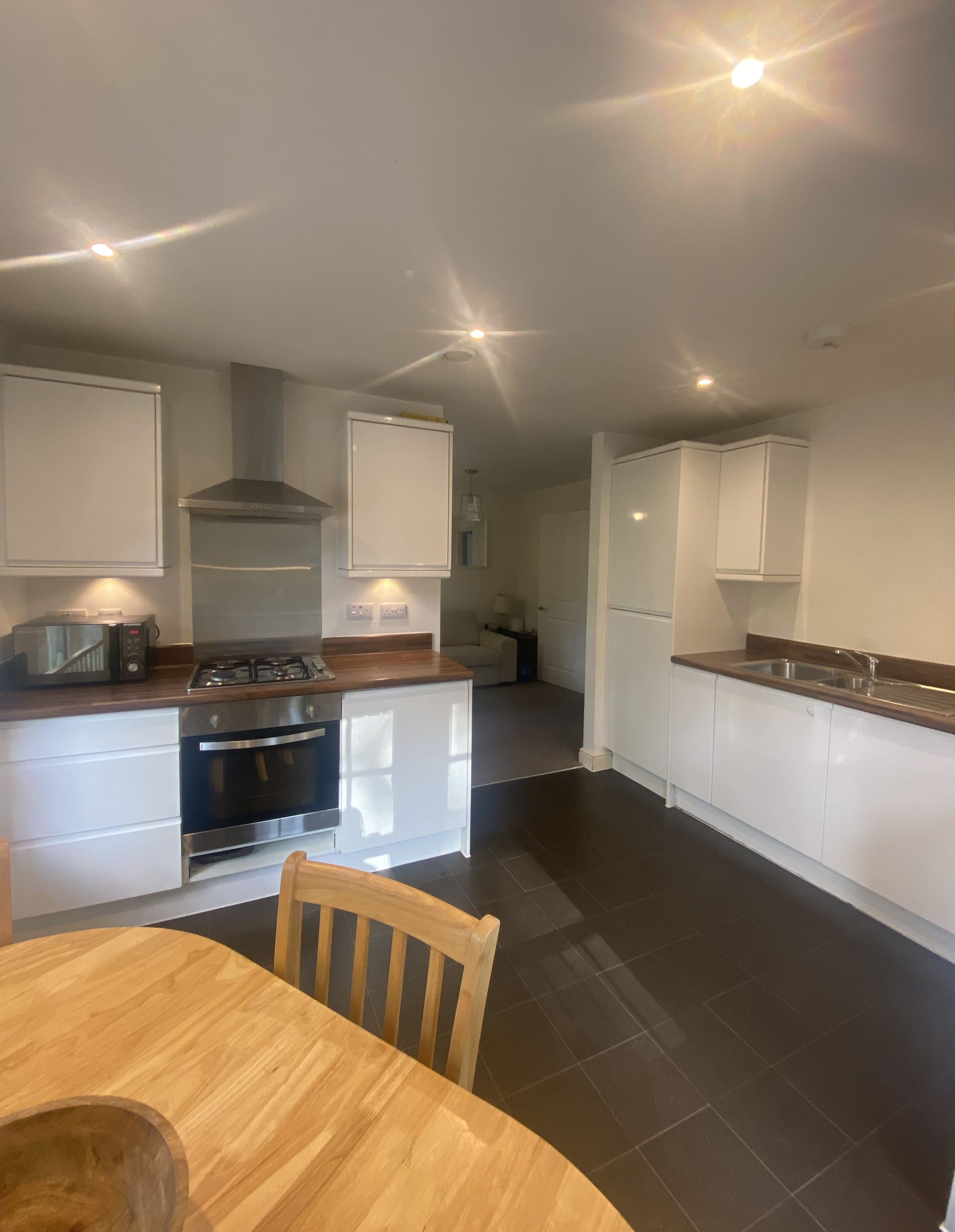 Modern kitchen with dining area and a range of base and wall units, laminate worktops, and integrated appliances