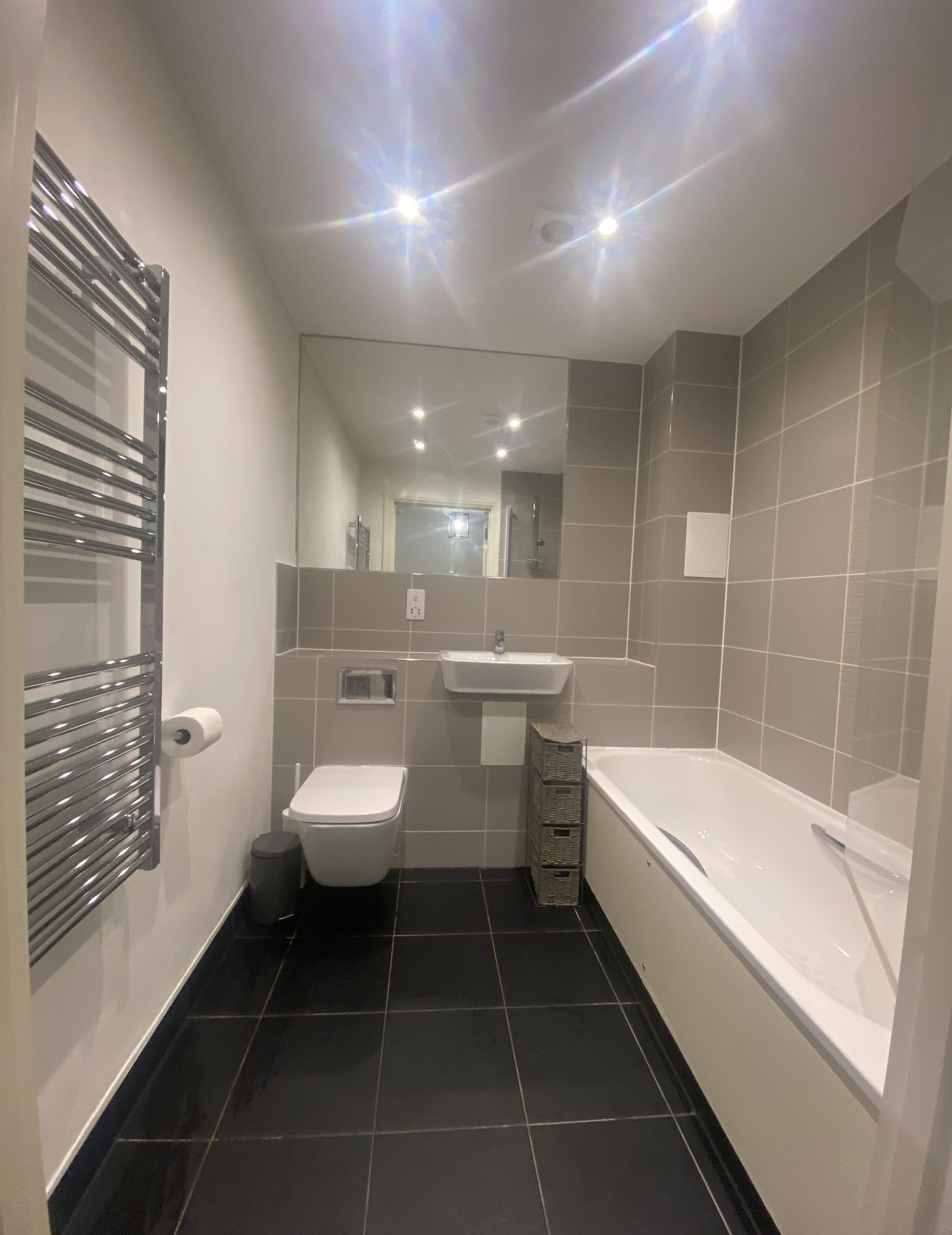 Stylish family bathroom with a modern white suite, part-tiled walls, and a bath with shower and screen