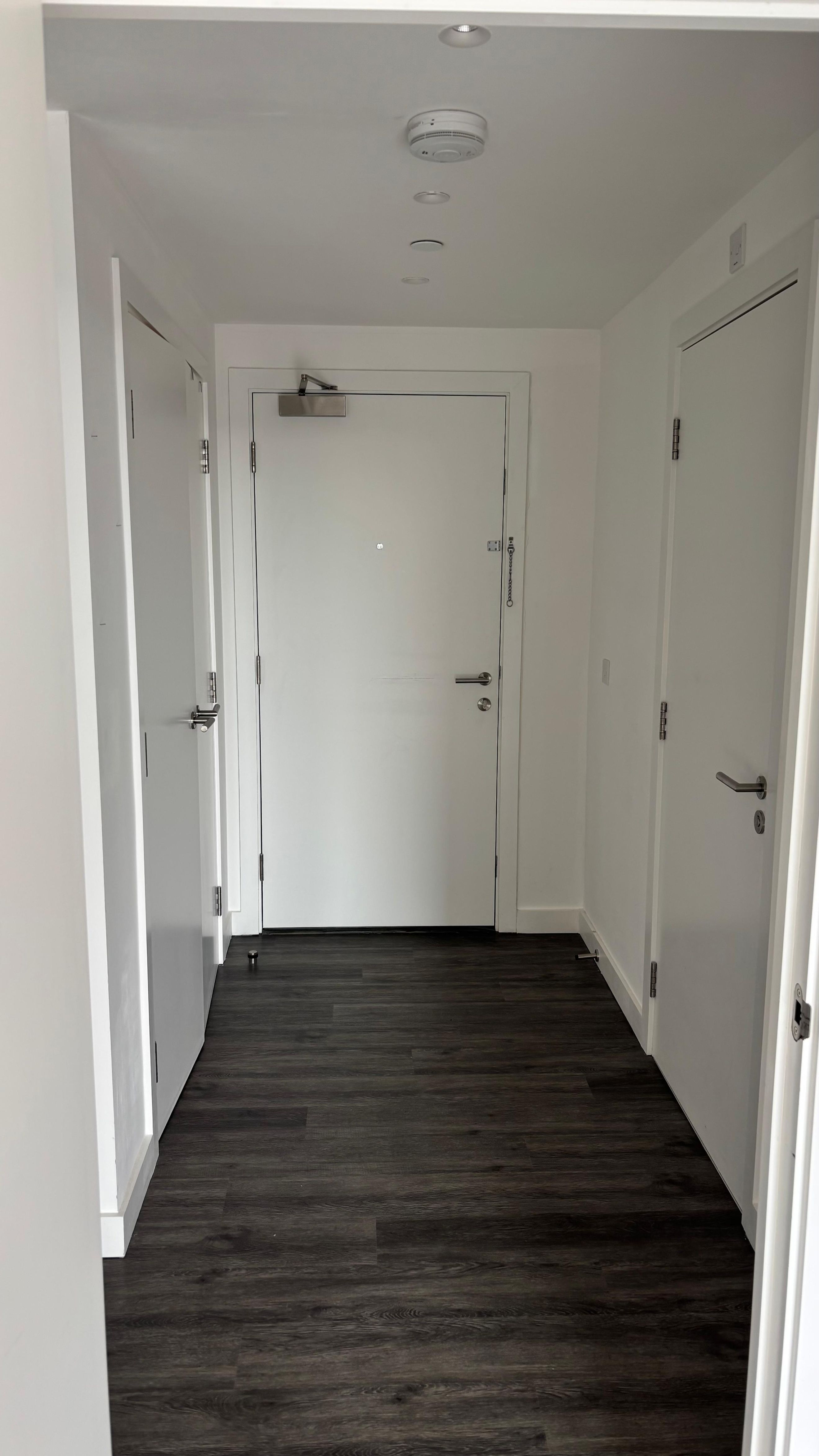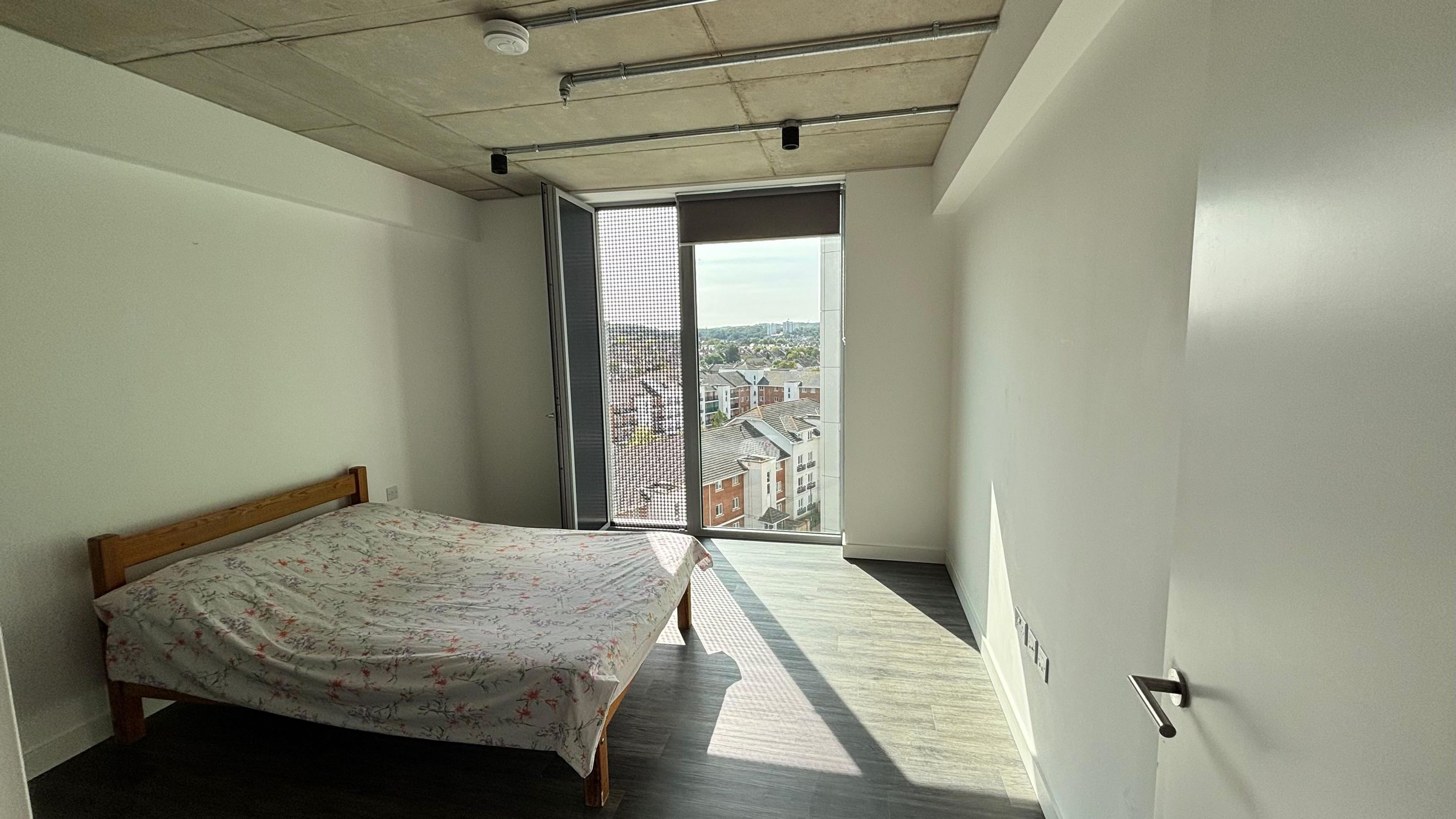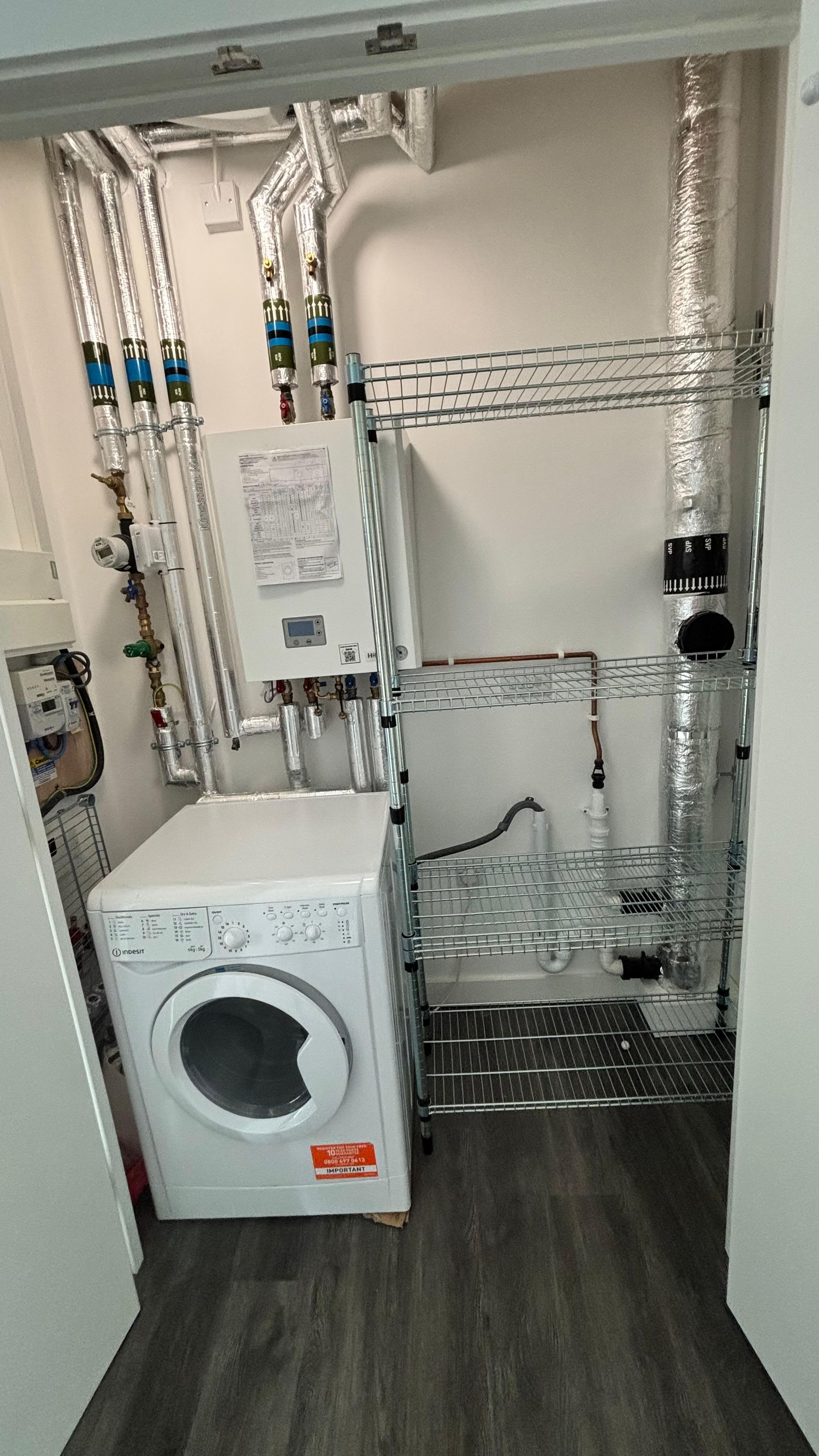 The one double-bedroom apartment is a very well-maintained 6th floor property. The apartment features a large open-plan lounge area connected to a clean, modern kitchen. The flat has been finished to a high standard throughout with underfloor heating, smart-energy features (as well as using renewable energy) and high-quality units, fitting and flooring (clearly matched with a designer’s eye). The flat features a hallway behind the front door and a separate bathroom and separate bedroom with entrances off this hallway. The bedroom and lounge are both lit during the day by daylight streaming through the large windows with sunset views. There is also a quiet balcony off the lounge which is large enough for a table and chairs (and also features a large storage unit). There is plenty of storage throughout the flat with fixed cupboards/wardrobes in the kitchen and bedroom. There is also a laundry room off this hallway that currently features a washing-machine and space for storage. The flat is accessed via one of the two lifts that service Eliza Knight House.