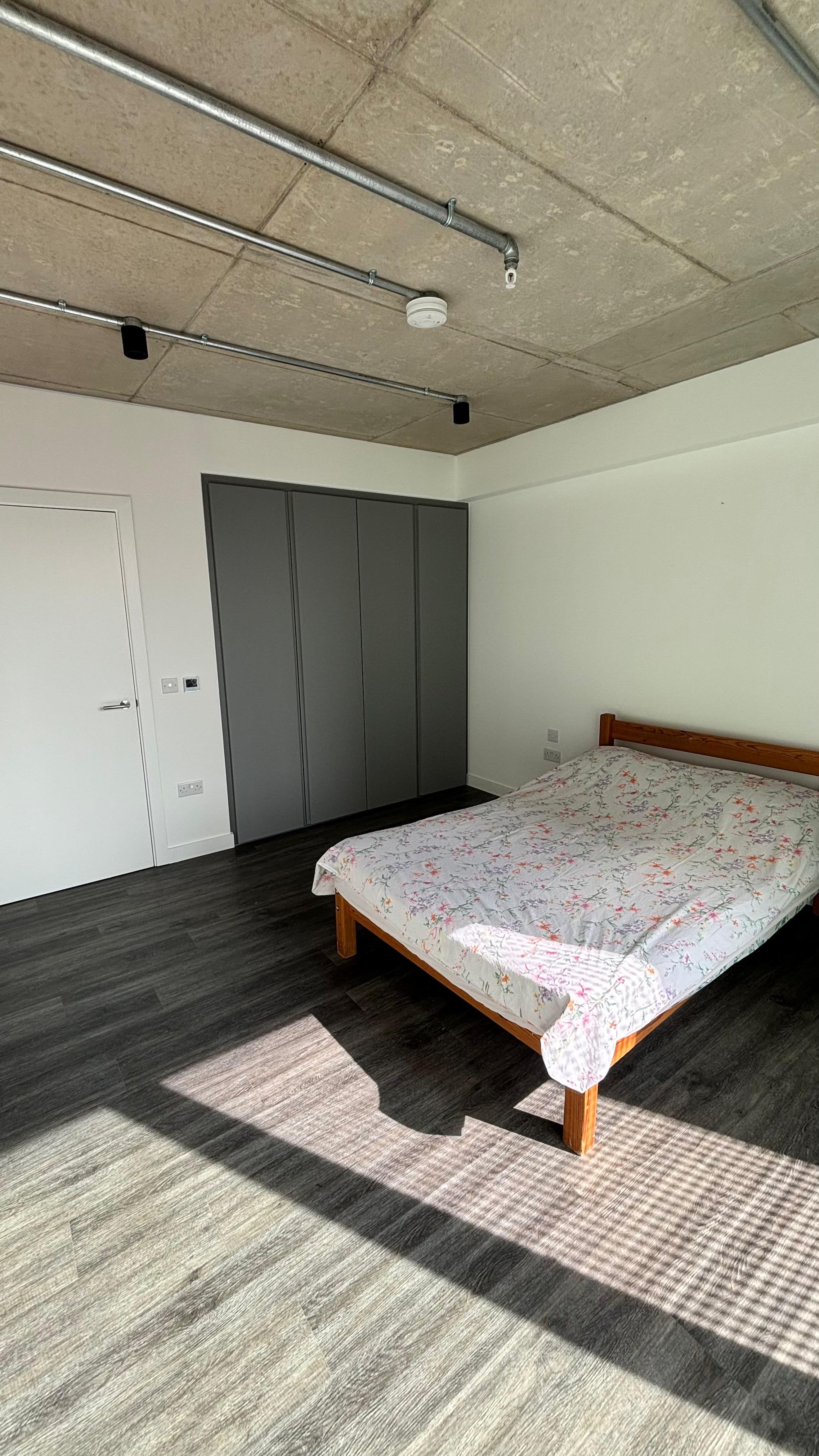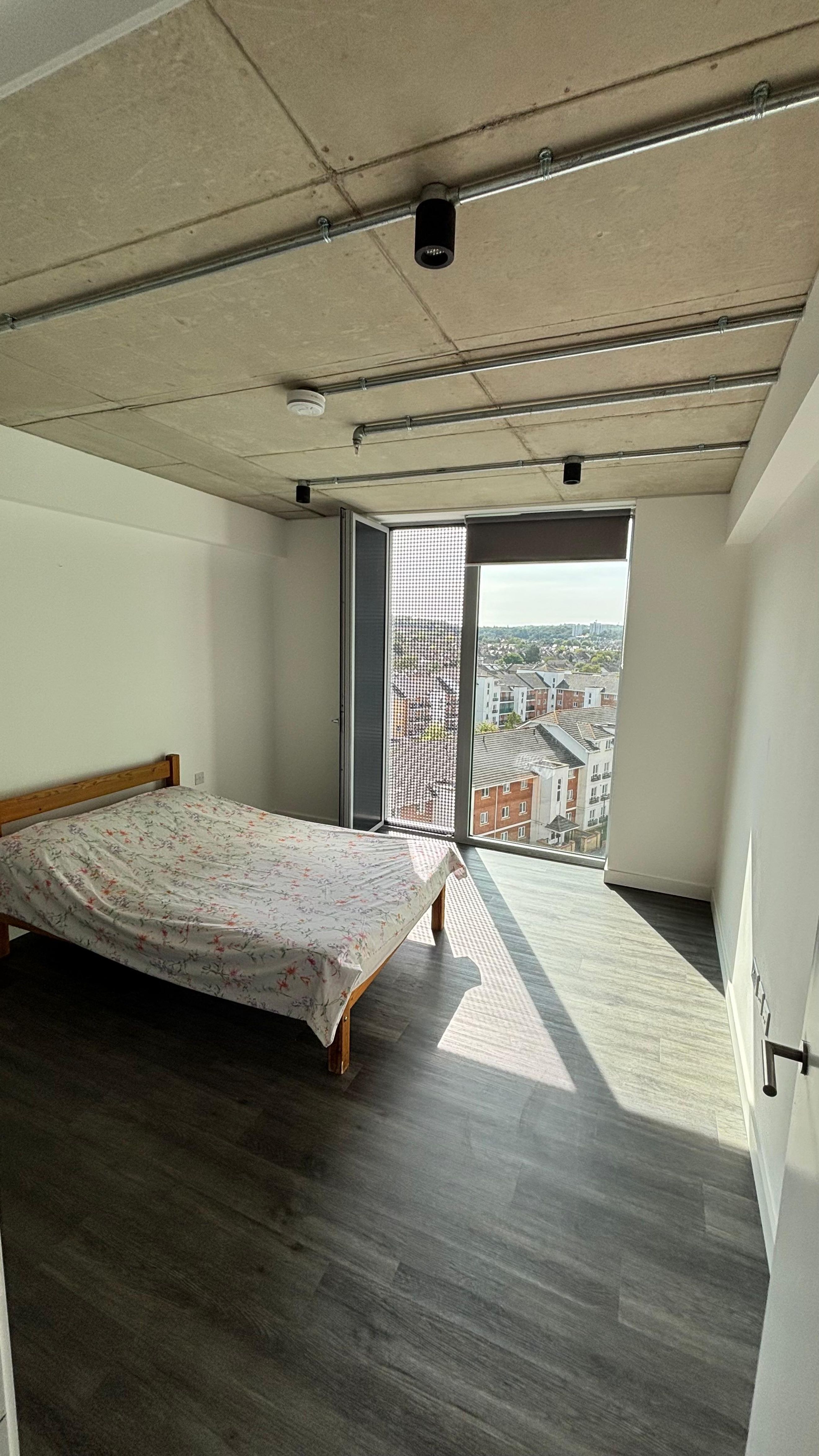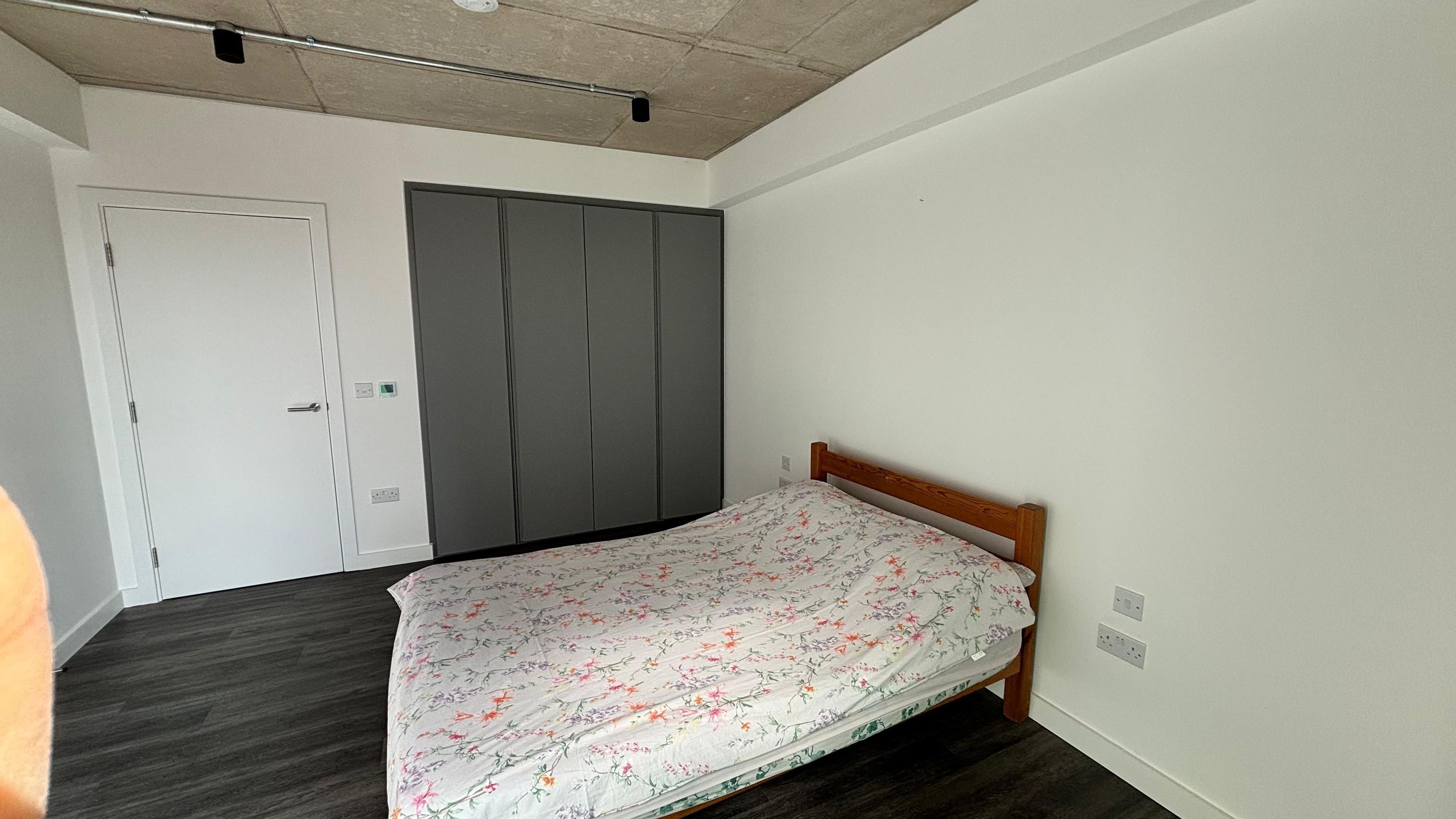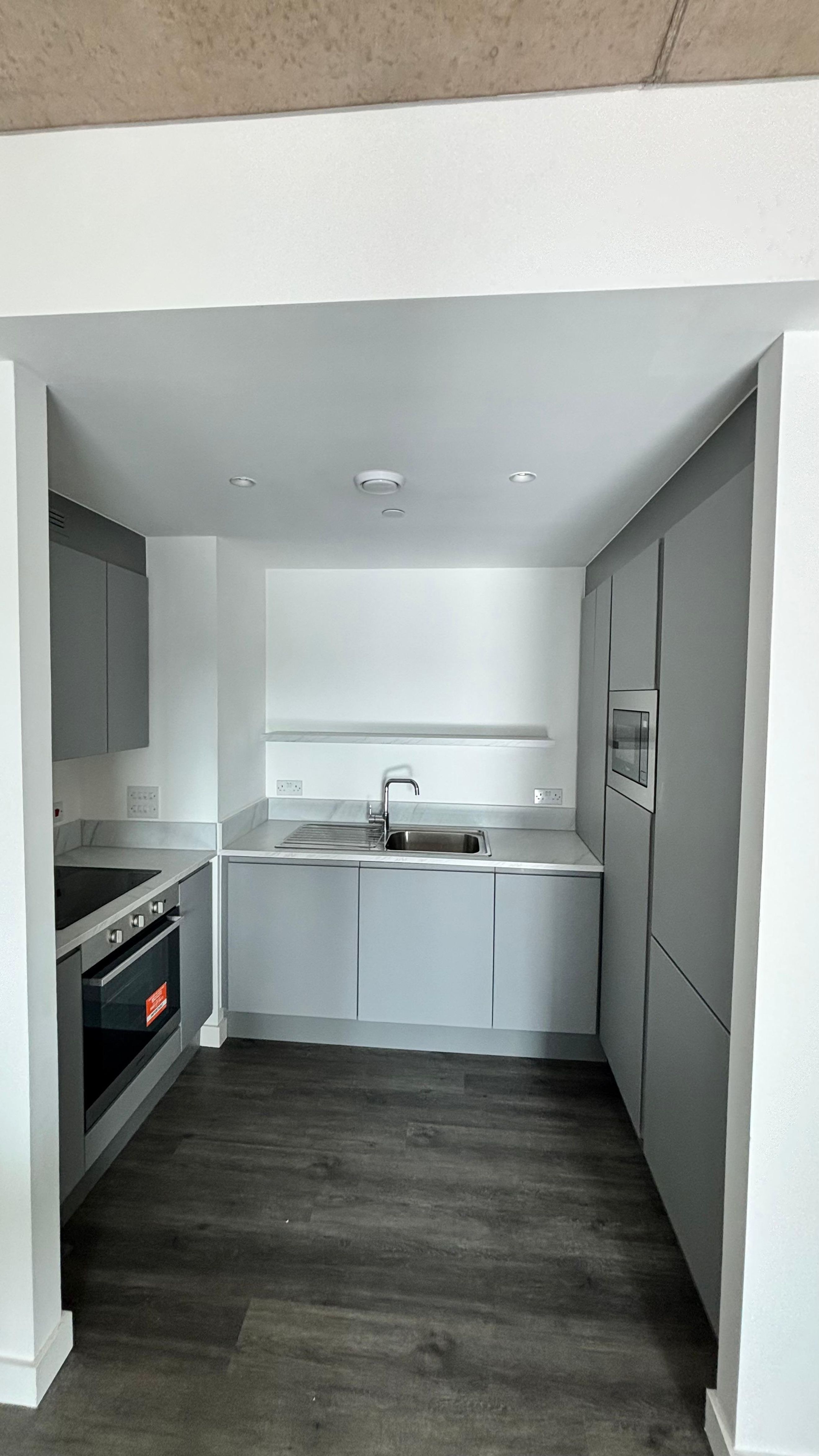 The one double-bedroom apartment is a very well-maintained 6th floor property. The apartment features a large open-plan lounge area connected to a clean, modern kitchen. The flat has been finished to a high standard throughout with underfloor heating, smart-energy features (as well as using renewable energy) and high-quality units, fitting and flooring (clearly matched with a designer’s eye). The flat features a hallway behind the front door and a separate bathroom and separate bedroom with entrances off this hallway. The bedroom and lounge are both lit during the day by daylight streaming through the large windows with sunset views. There is also a quiet balcony off the lounge which is large enough for a table and chairs (and also features a large storage unit). There is plenty of storage throughout the flat with fixed cupboards/wardrobes in the kitchen and bedroom. There is also a laundry room off this hallway that currently features a washing-machine and space for storage. The flat is accessed via one of the two lifts that service Eliza Knight House.