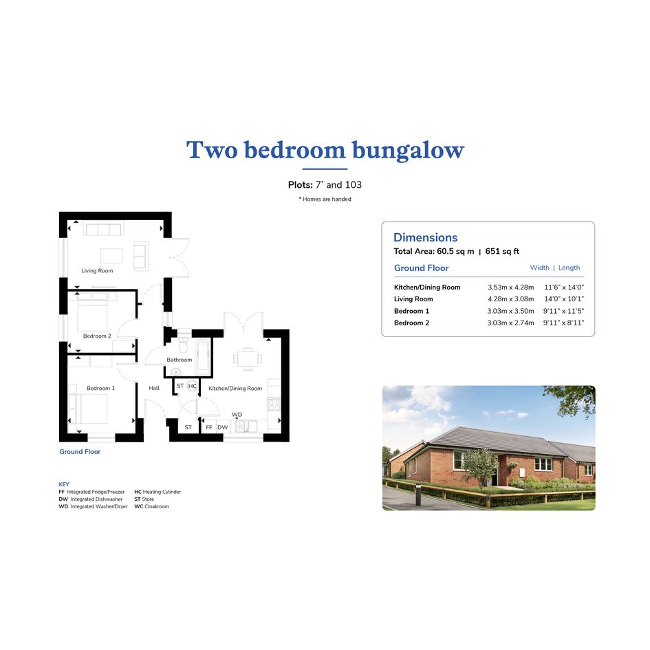 Plot 7 is a 657 square foot, two bedroom detached bungalow with a modern, open plan living area finished to a high standard, with a range of integrated appliances, private garden and 2 parking spaces at Benson Grange, available to purchase through Shared Ownership from a 40% share.