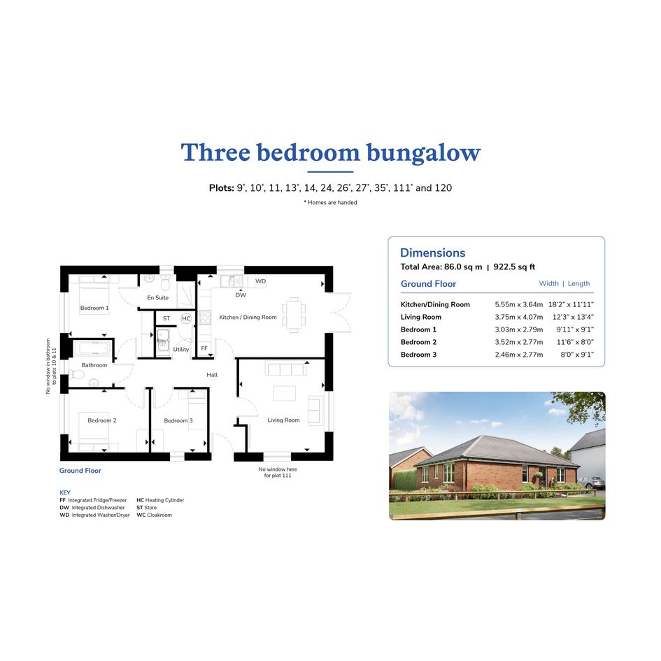 Plot 9 is a 926 square foot, three bedroom detached bungalow with a modern, open plan living area finished to a high standard, with a range of integrated appliances, private garden and 2 parking spaces at Benson Grange, available to purchase through Shared Ownership from a 40% share.