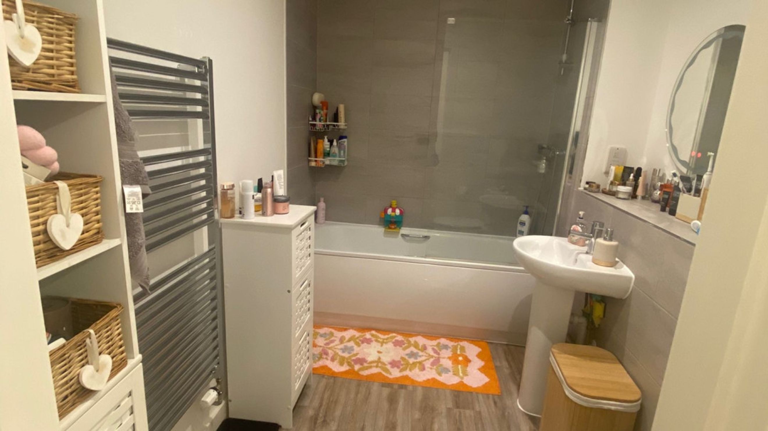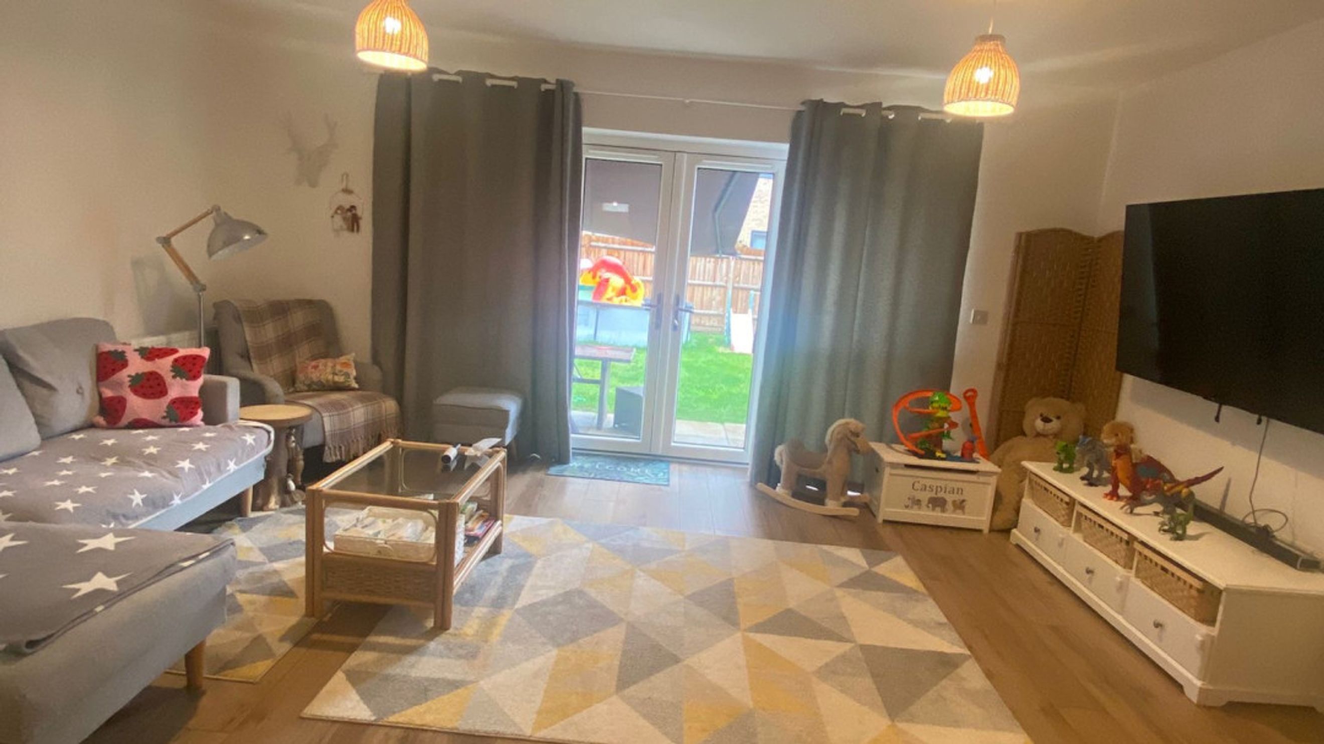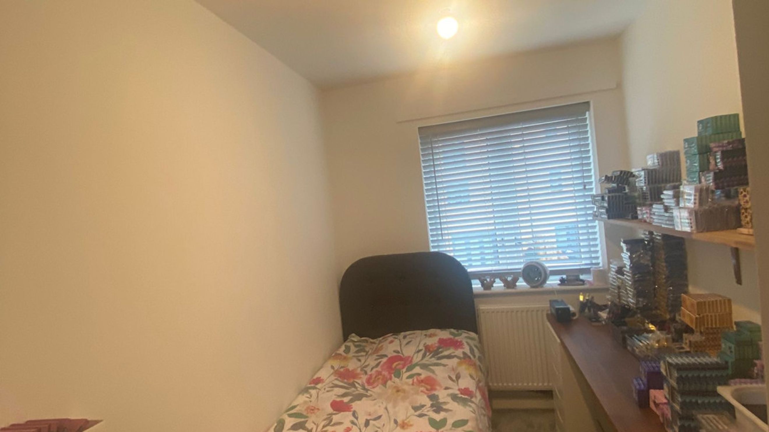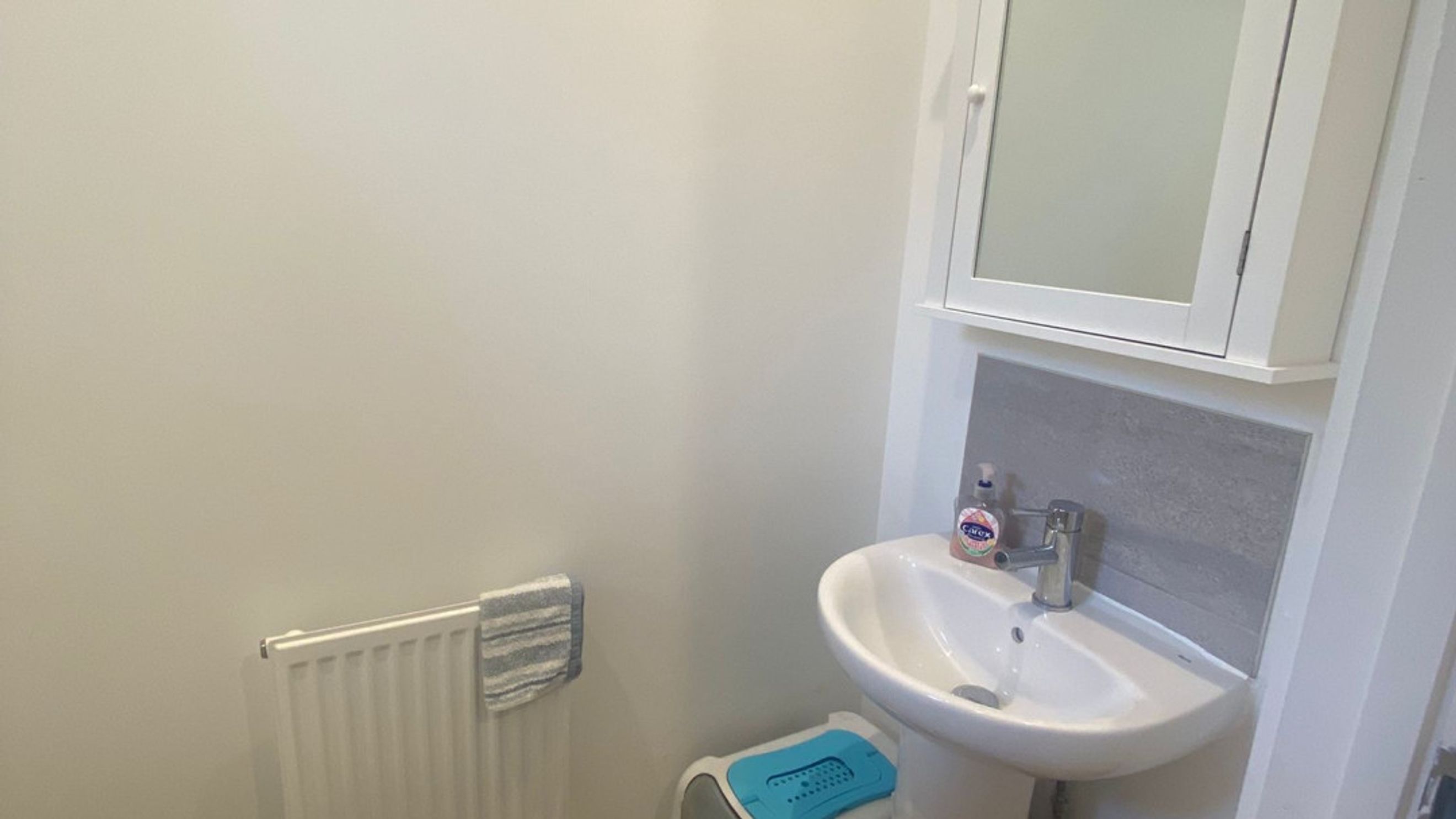 Upstairs, all three bedrooms are generously sized and fully carpeted, providing a cosy retreat. The family bathroom is fitted with a white suite, shower over the bath, grey partial tiling, and vinyl flooring for easy maintenance.