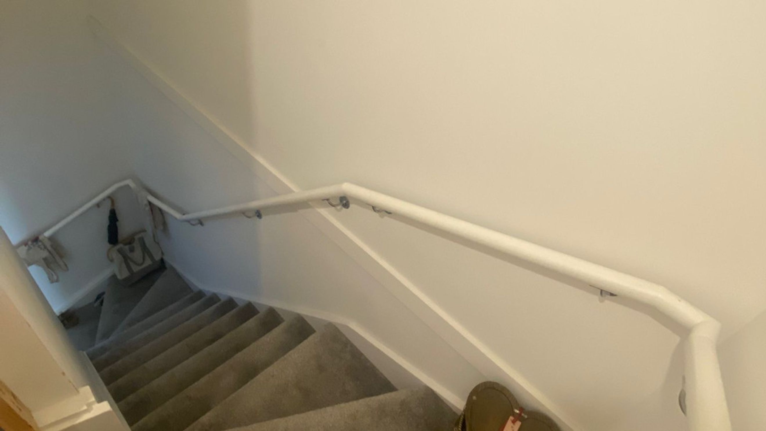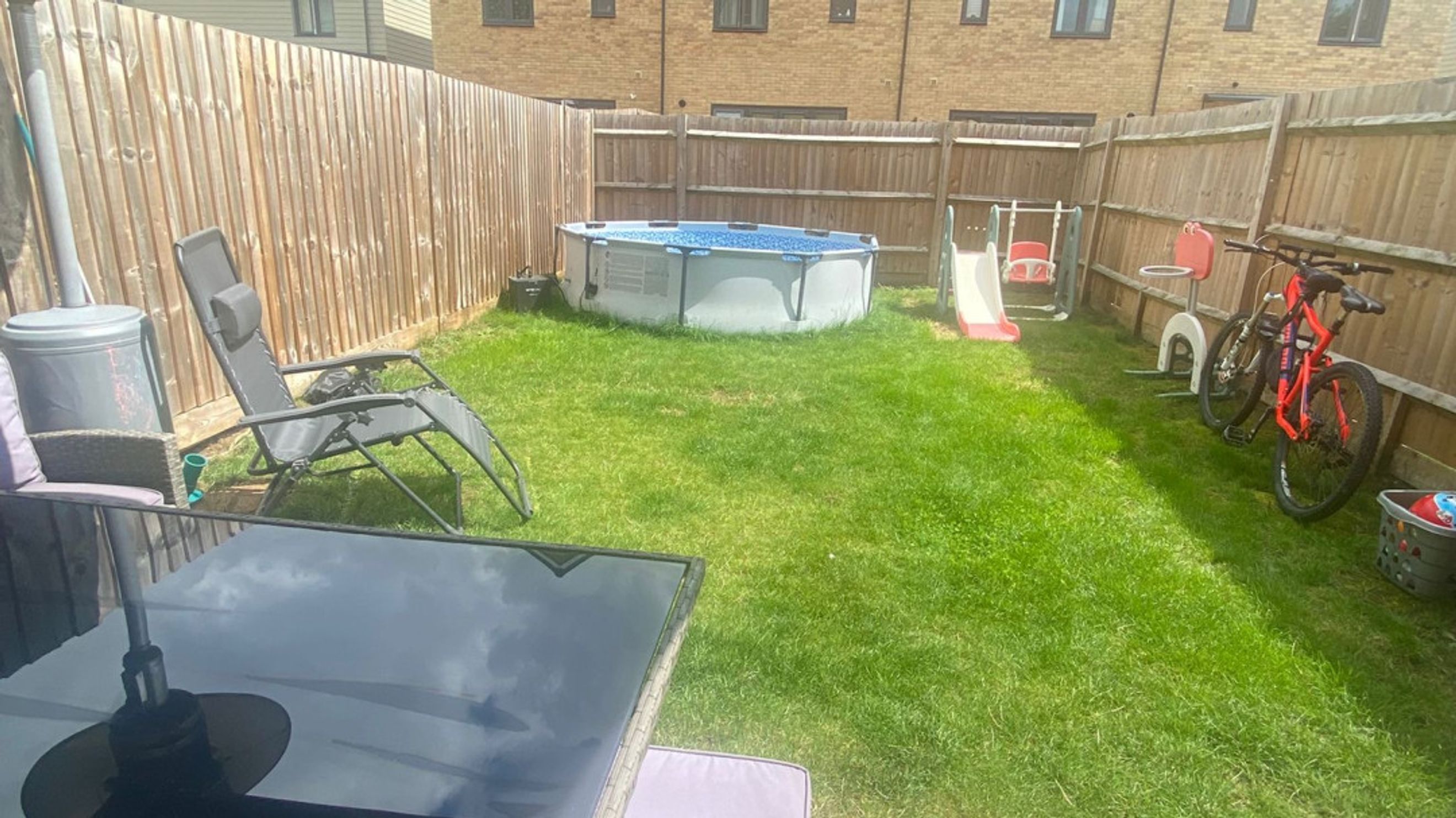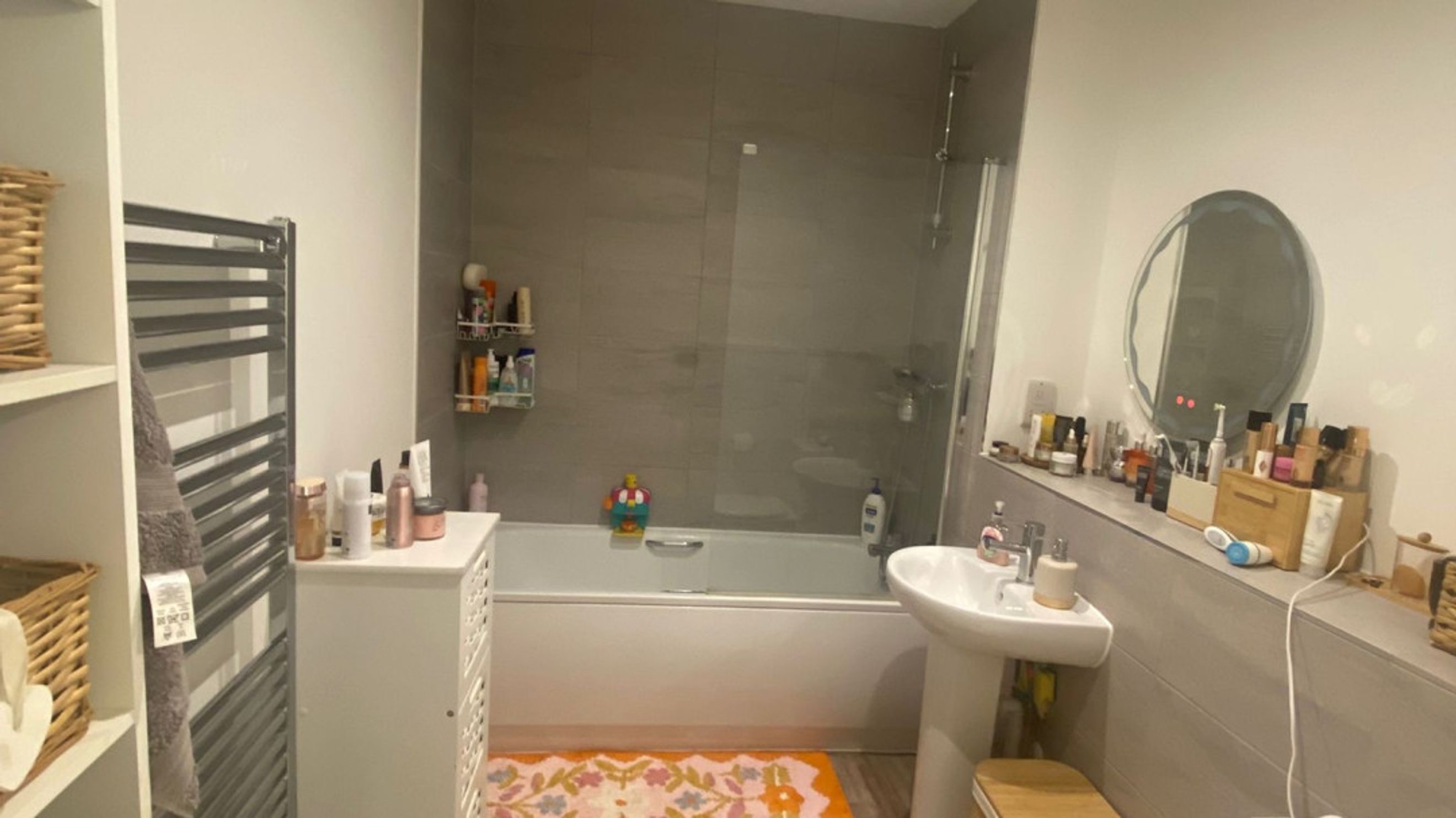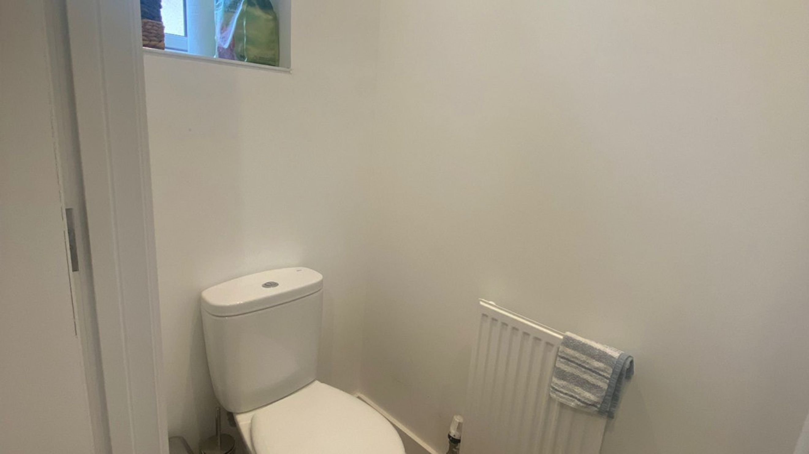 Upstairs, all three bedrooms are generously sized and fully carpeted, providing a cosy retreat. The family bathroom is fitted with a white suite, shower over the bath, grey partial tiling, and vinyl flooring for easy maintenance.