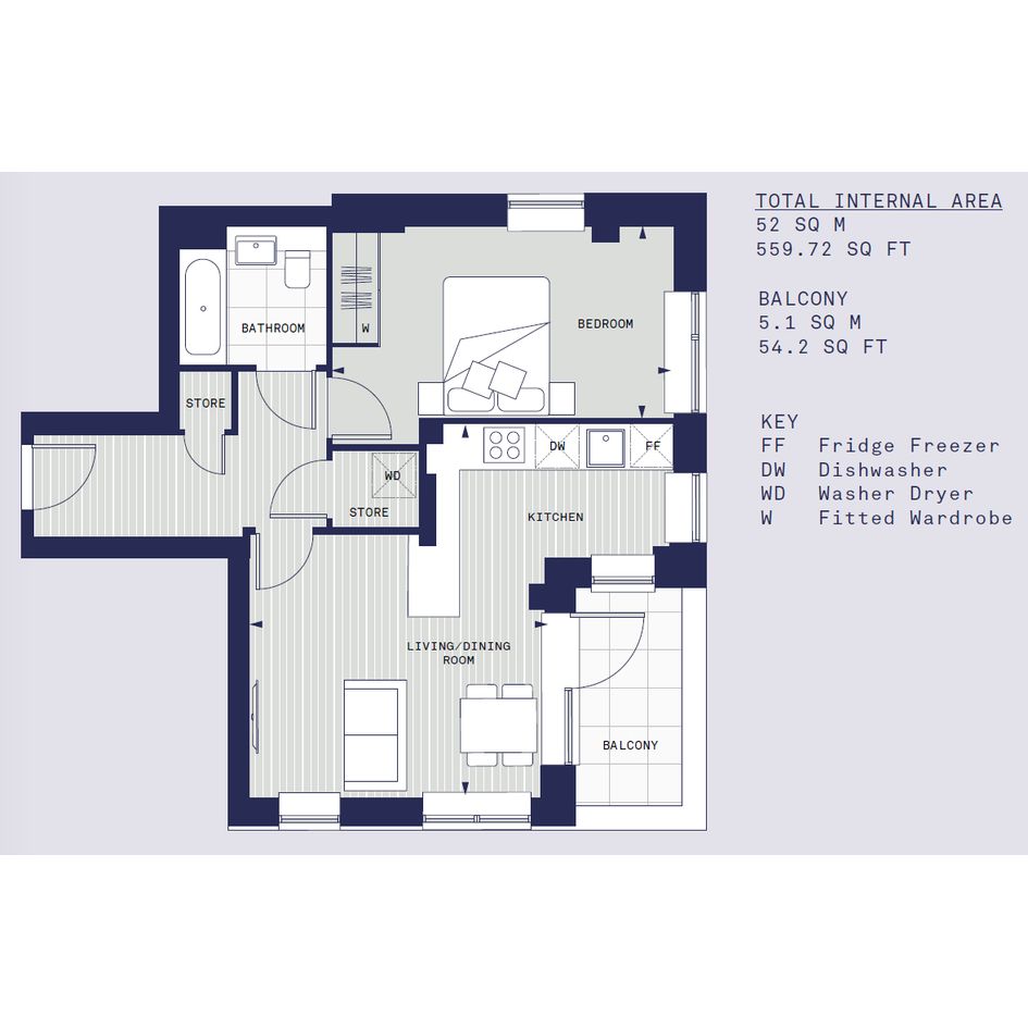 A spacious apartment on the third floor of this recently-constructed block. The property has a dual-aspect (south and east facing) reception room with semi-open-plan kitchen area featuring sleek, handle-less units, integrated appliances and a breakfast bar. A door leads out onto a good-sized balcony. The bedroom also benefits from windows on two sides and includes a fitted wardrobe. There is a simple yet stylish bathroom and a pair of built-in storage/utility cupboards have been provided in the entrance hall. Well insulated walls, high performance glazing and a communal heating/hot water system all contribute towards a very good energy-efficiency rating. The development has a courtyard, a roof terrace and is located just to the west of Burgess Park. Denmark Hill, Oval and Elephant & Castle stations are all within walking distance or a brief bus/bike ride.