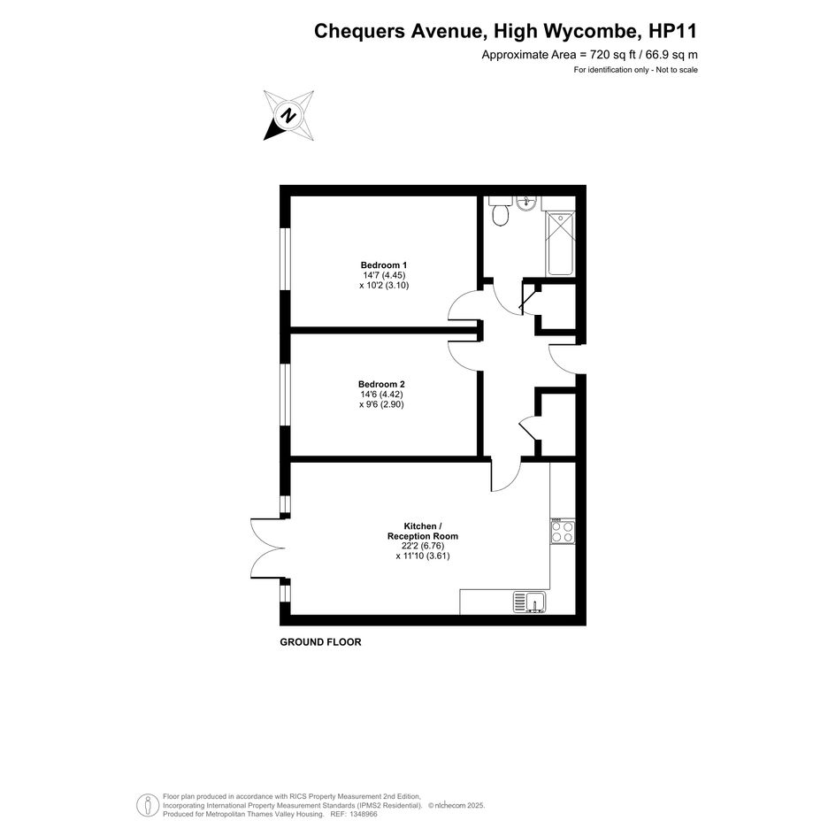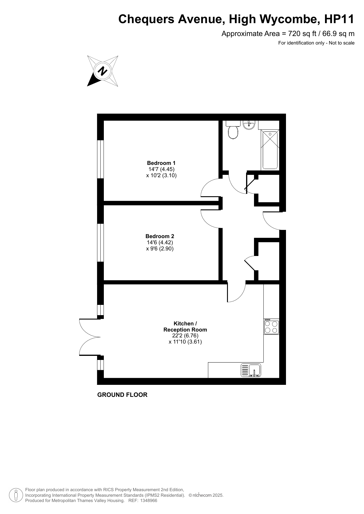The property is on the ground floor and features an entrance hall, kitchen, living room, two bedrooms, and one bathroom.