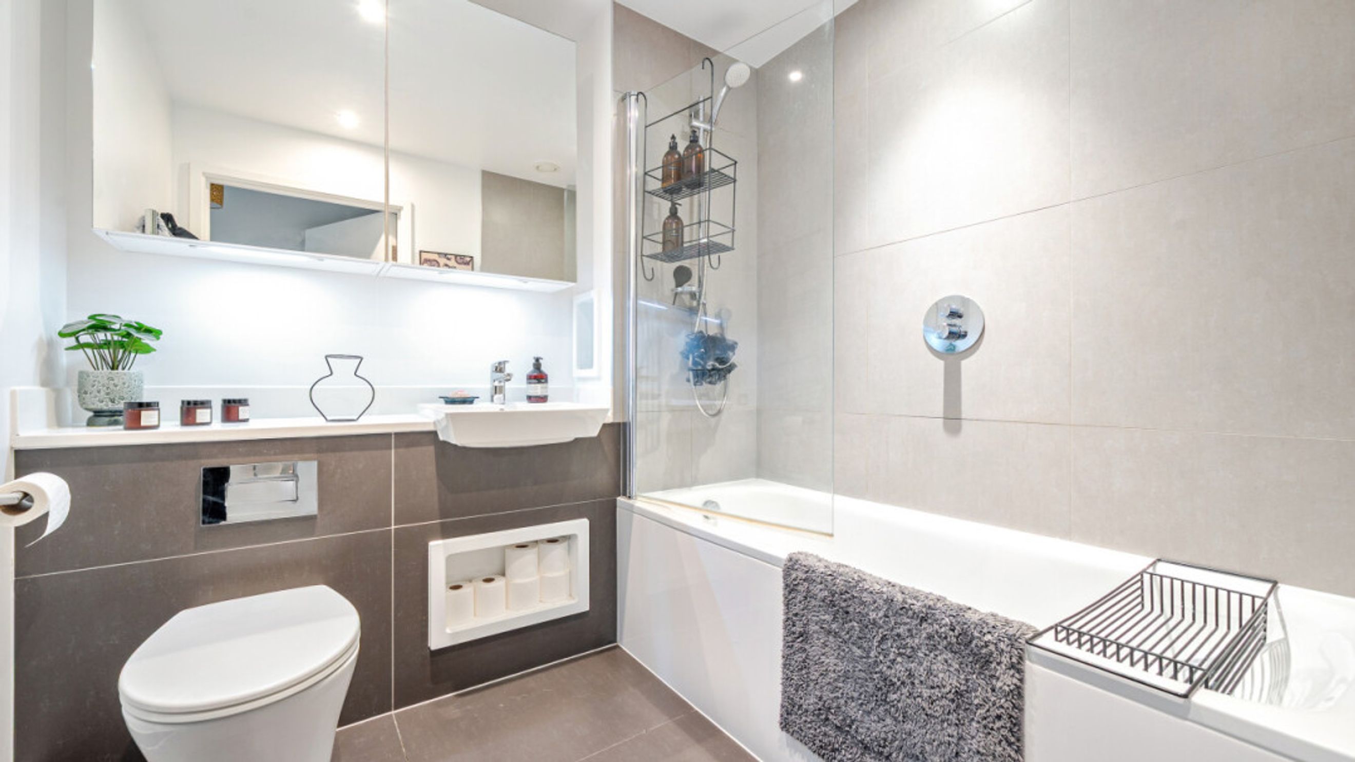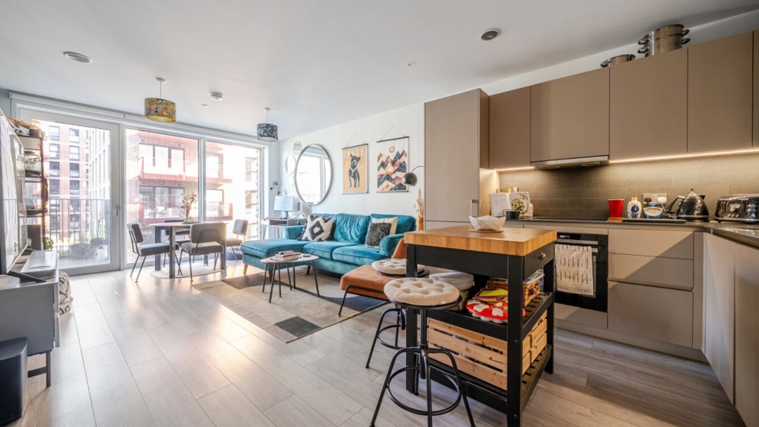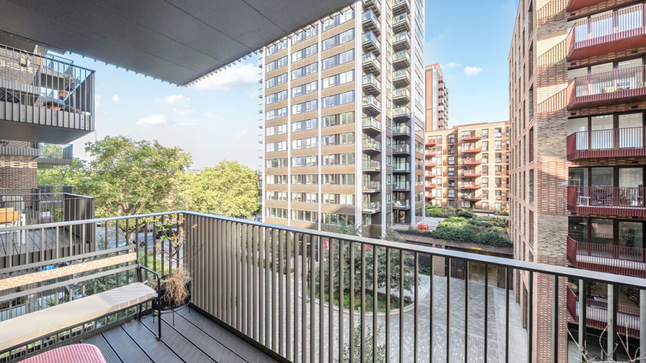 Enter this bright and spacious apartment directly into the stylish open-plan living area, which is flooded with natural light from wide floor-length windows and door to private balcony overlooking the communal courtyard. The kitchen is a modern matt grey with stylish worktops. It also benefits from under cupboard lighting and integrated appliances including a fridge freezer, oven, hob and extractor fan. The bedroom comes with fitted wardrobe and floor to ceiling windows overlooking the balcony. A contemporary bathroom comes complete with a white three-piece suite including a shower over the bath.