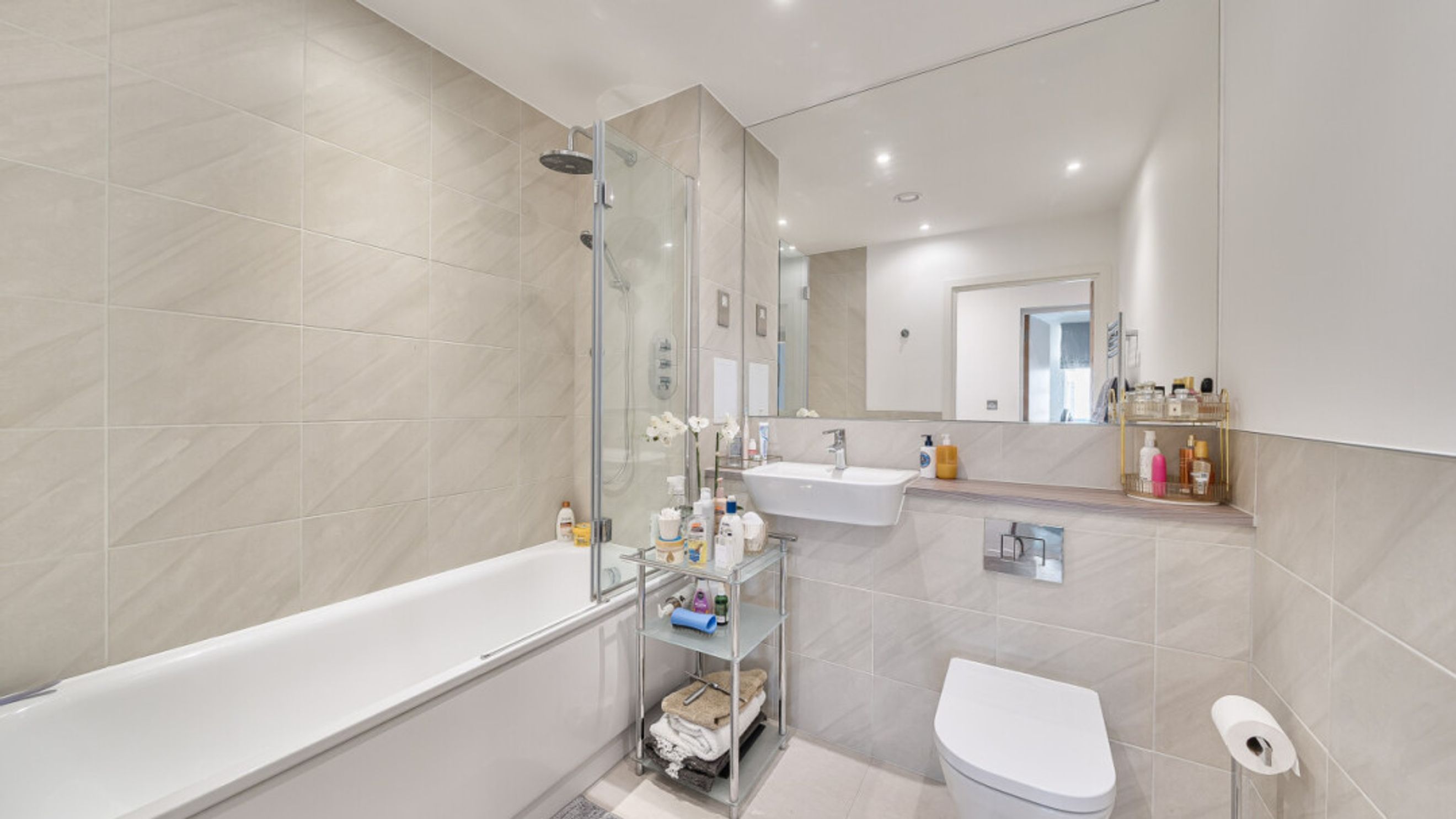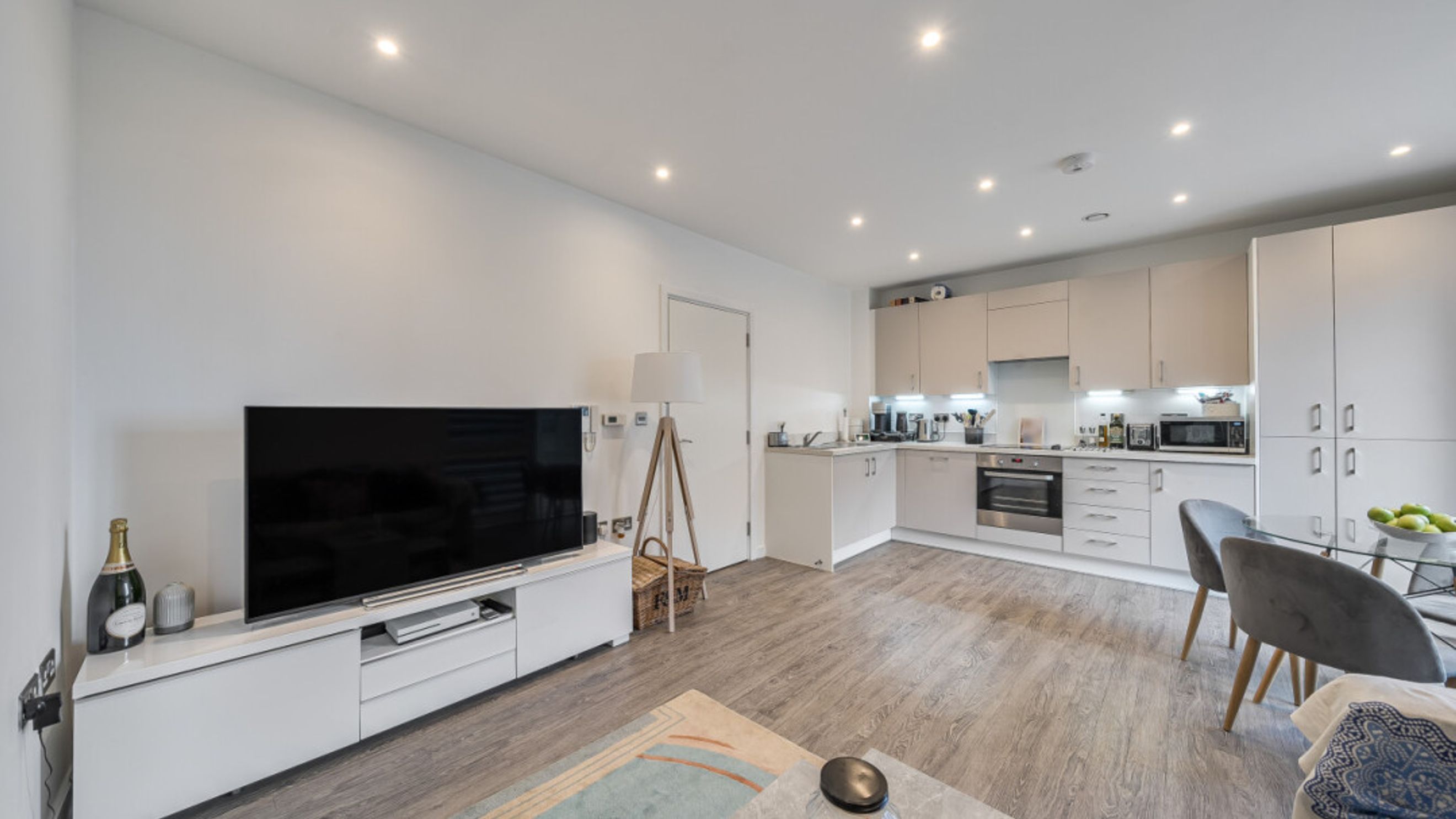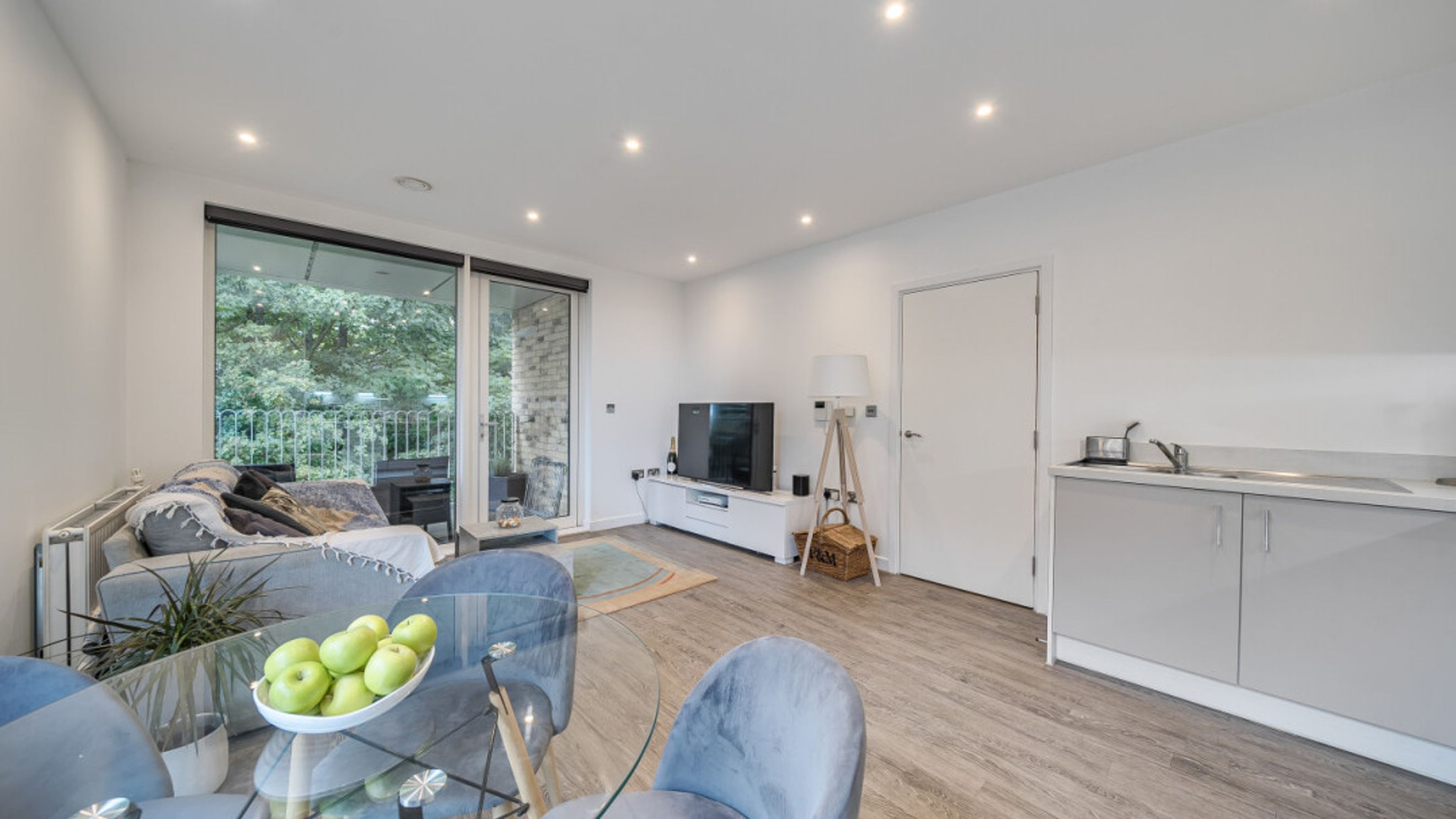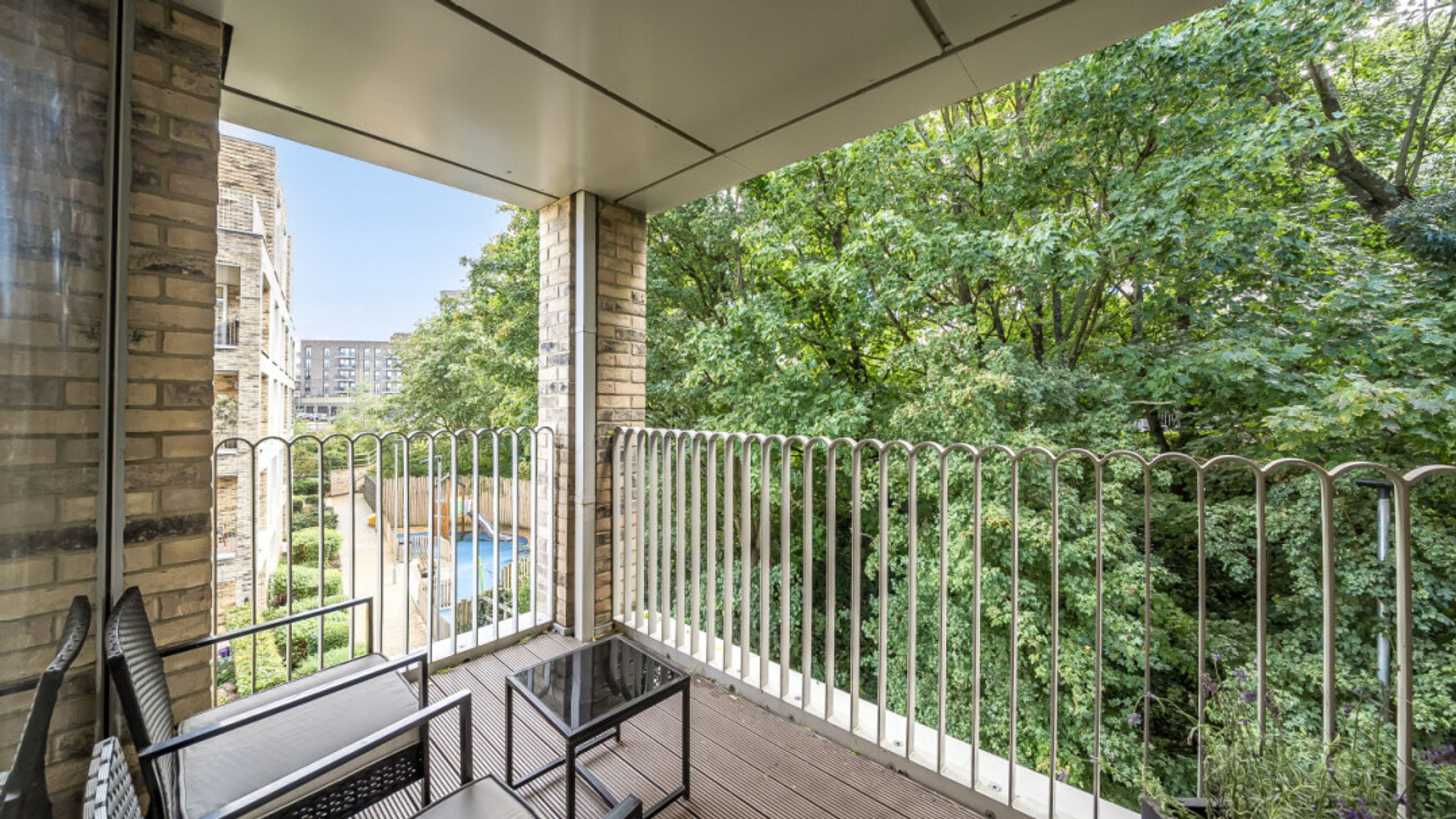 This beautifully presented dual aspect apartment is spacious and full of natural light. The open plan living kitchen area is lit by floor to ceiling east facing windows and opens onto a pretty south facing private balcony with lovely views over landscaped gardens, which also provide privacy. The modern kitchen is fitted with pale units and work surfaces and comes with integrated appliances. There are two generous double bedrooms each with fitted wardrobes and the master also benefits from an en-suite shower room. A contemporary family bathroom completes serves the second bedroom.