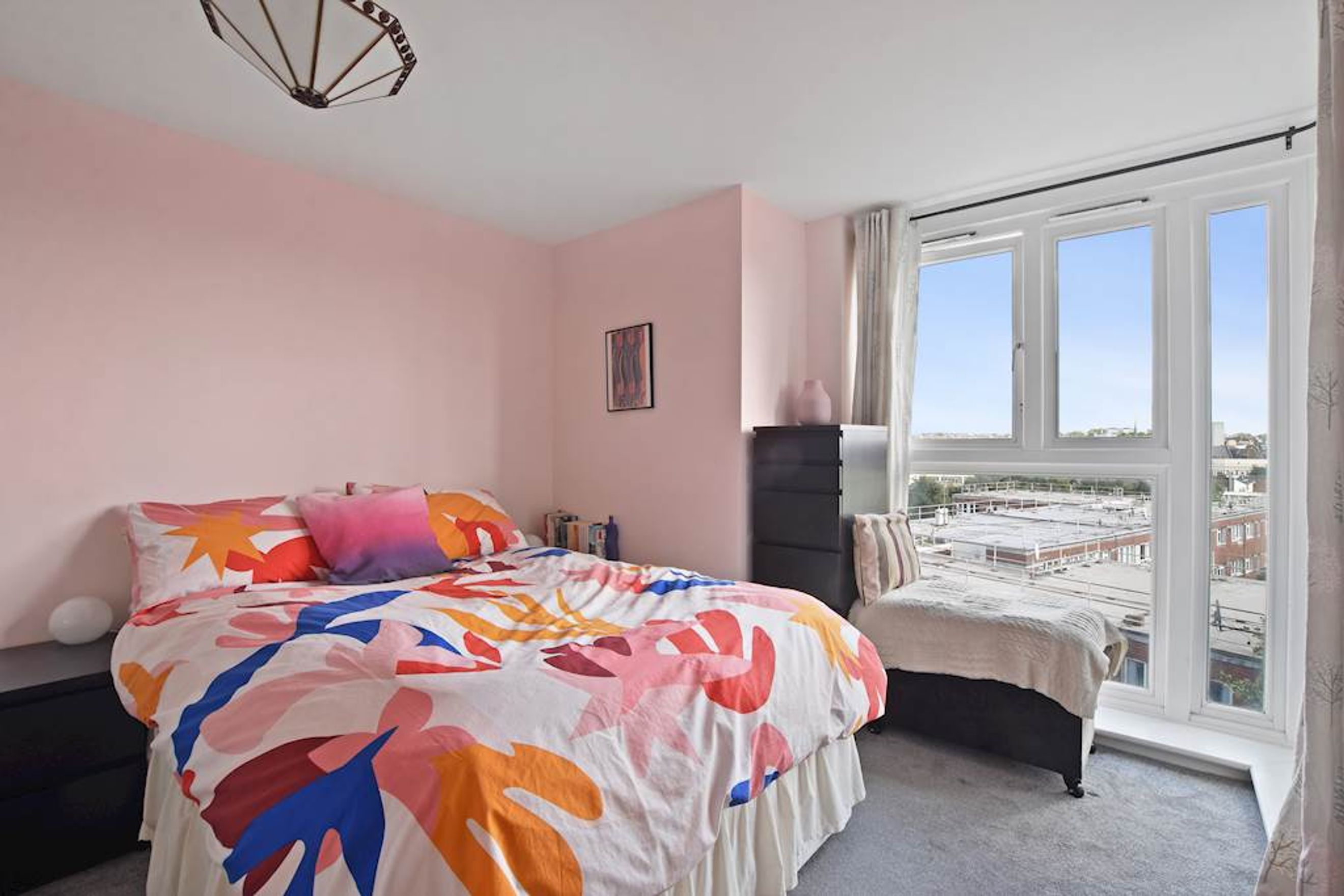 A comfortable double bedroom with ample natural light.