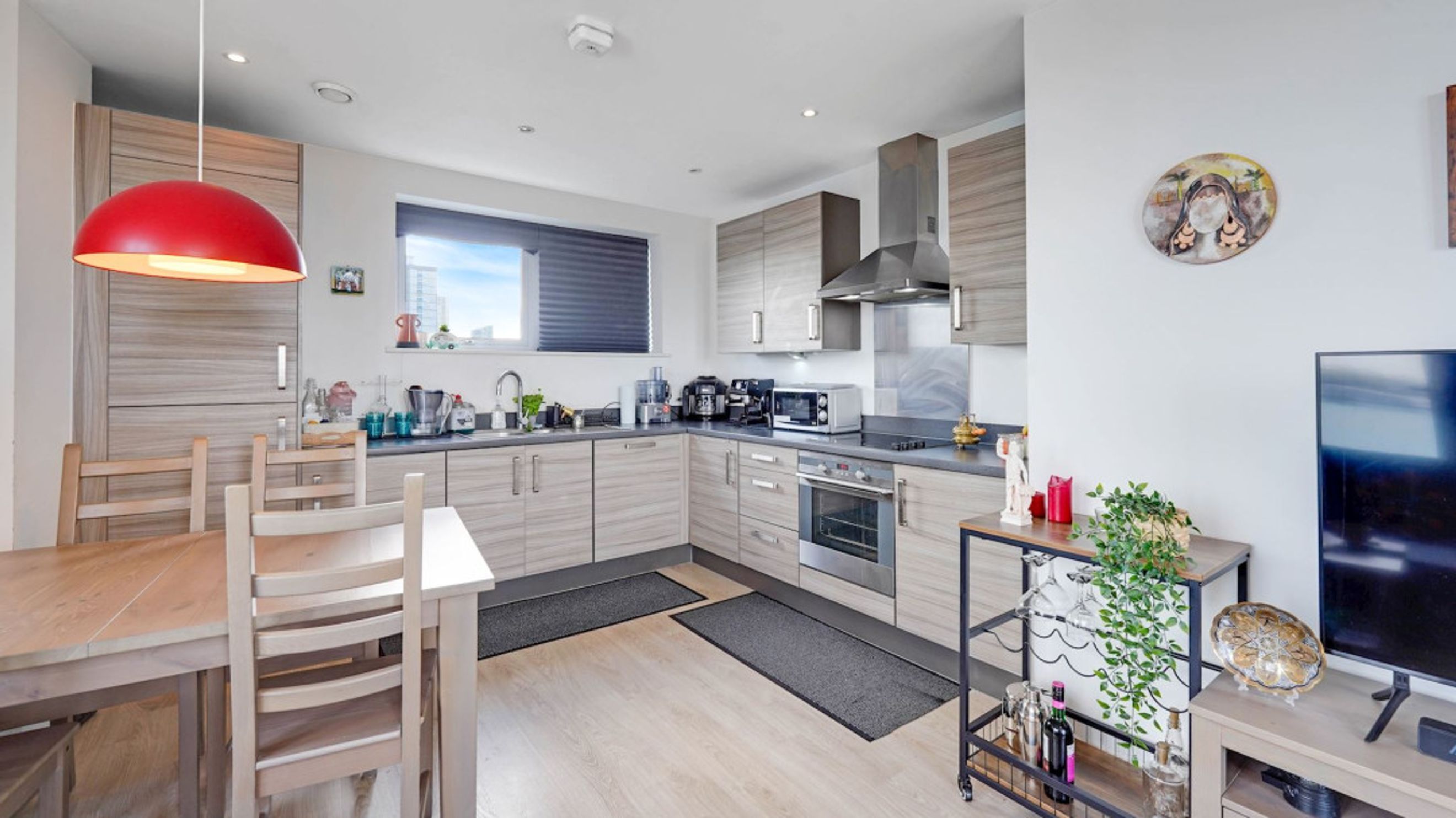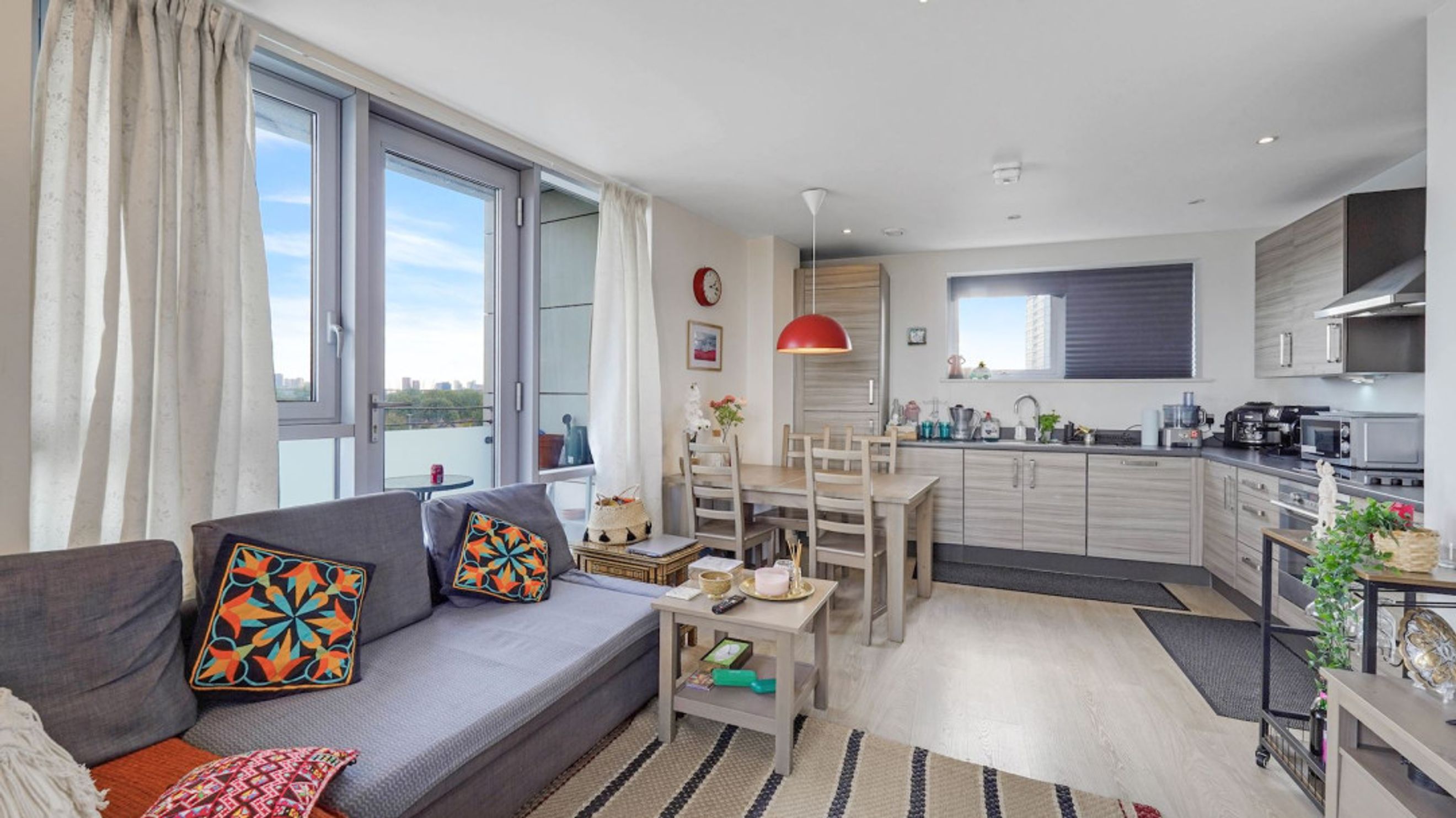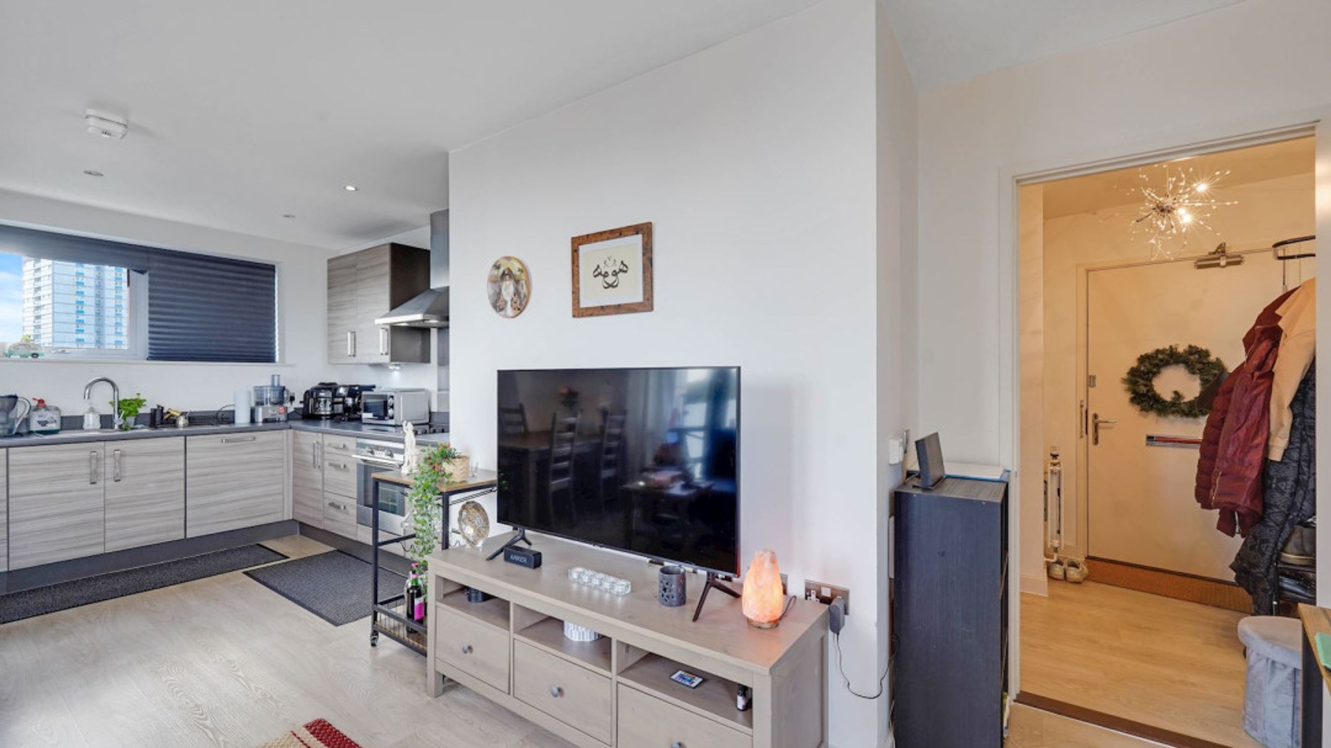 Flat 36, 3 Rick Robert's Way, London, welcomes you with its bright, modern charm and cozy ambiance. The bathroom invites with its warm recessed lighting and a stylish bathtub with shower, complemented by a sleek sink and toilet with bidet. The bedroom offers a snug retreat with glowing natural light from large windows and a chic ceiling fixture, plus a built-in wardrobe. The living room opens up with radiant floor-to-ceiling windows and soft recessed lighting, leading to a delightful balcony. The kitchen/dining area shines with natural light and elegant pendant lighting, featuring sleek cabinetry and a cozy dining nook. The hallway greets you with gentle overhead lighting and handy storage. The balcony enchants with its sunny views of the London skyline. The property benefits of an allocated parking space in a secure underground car park.