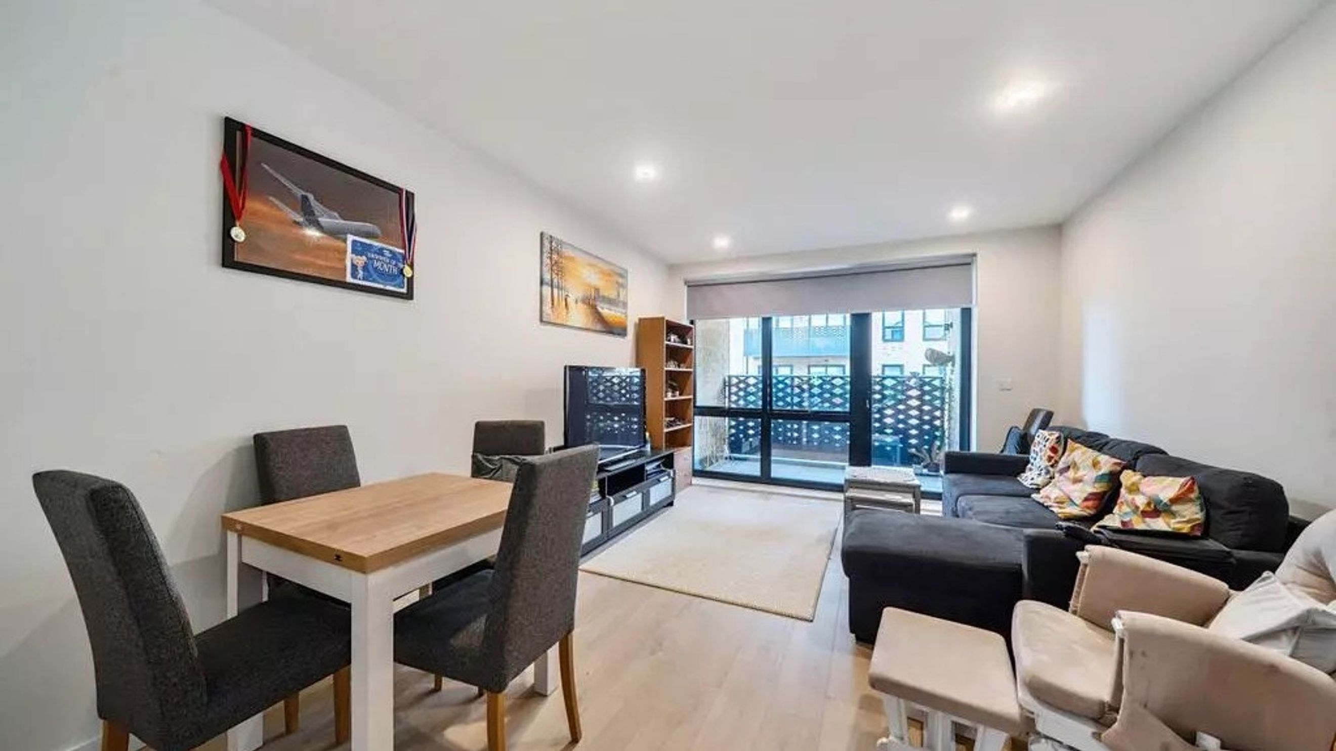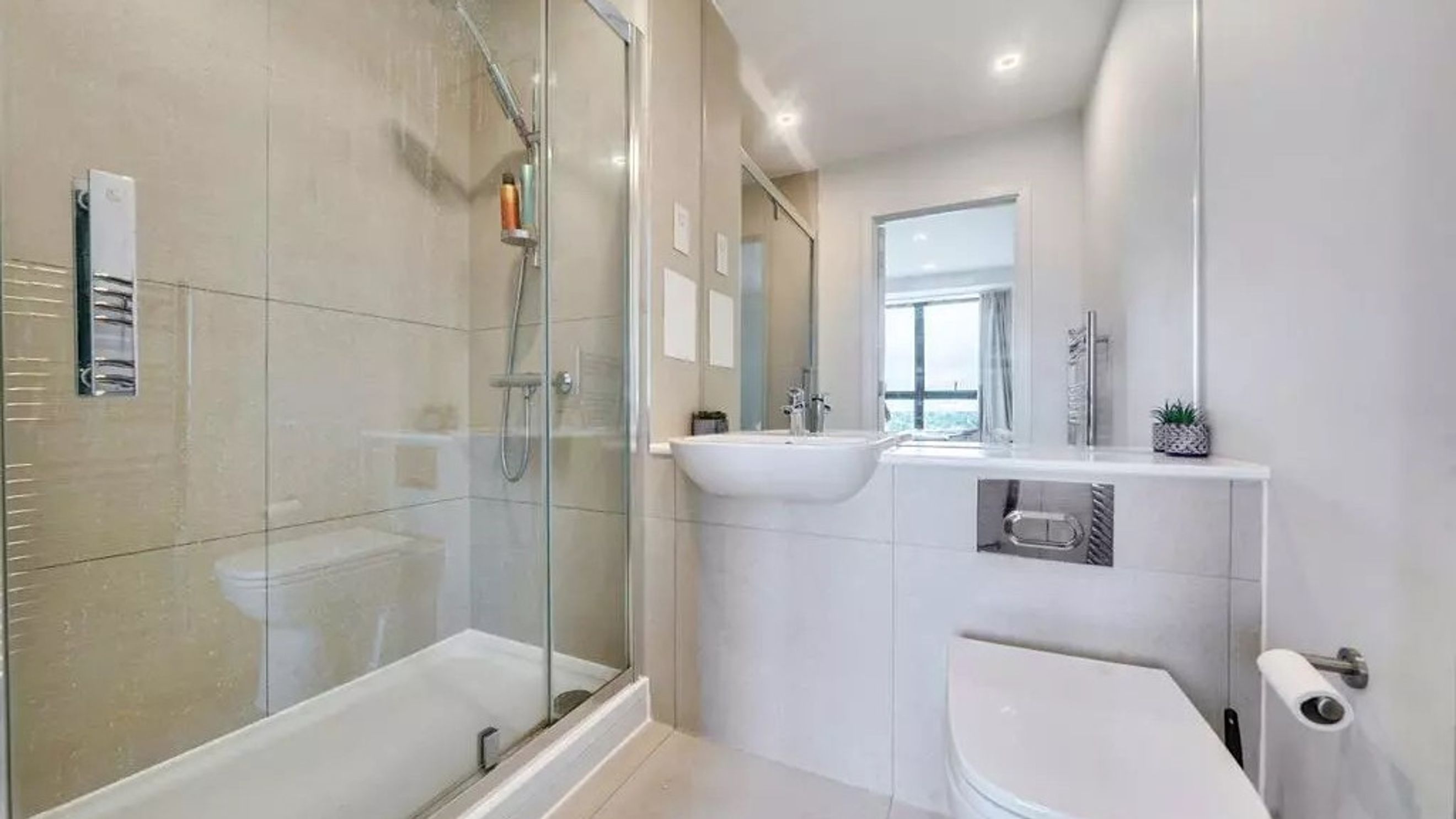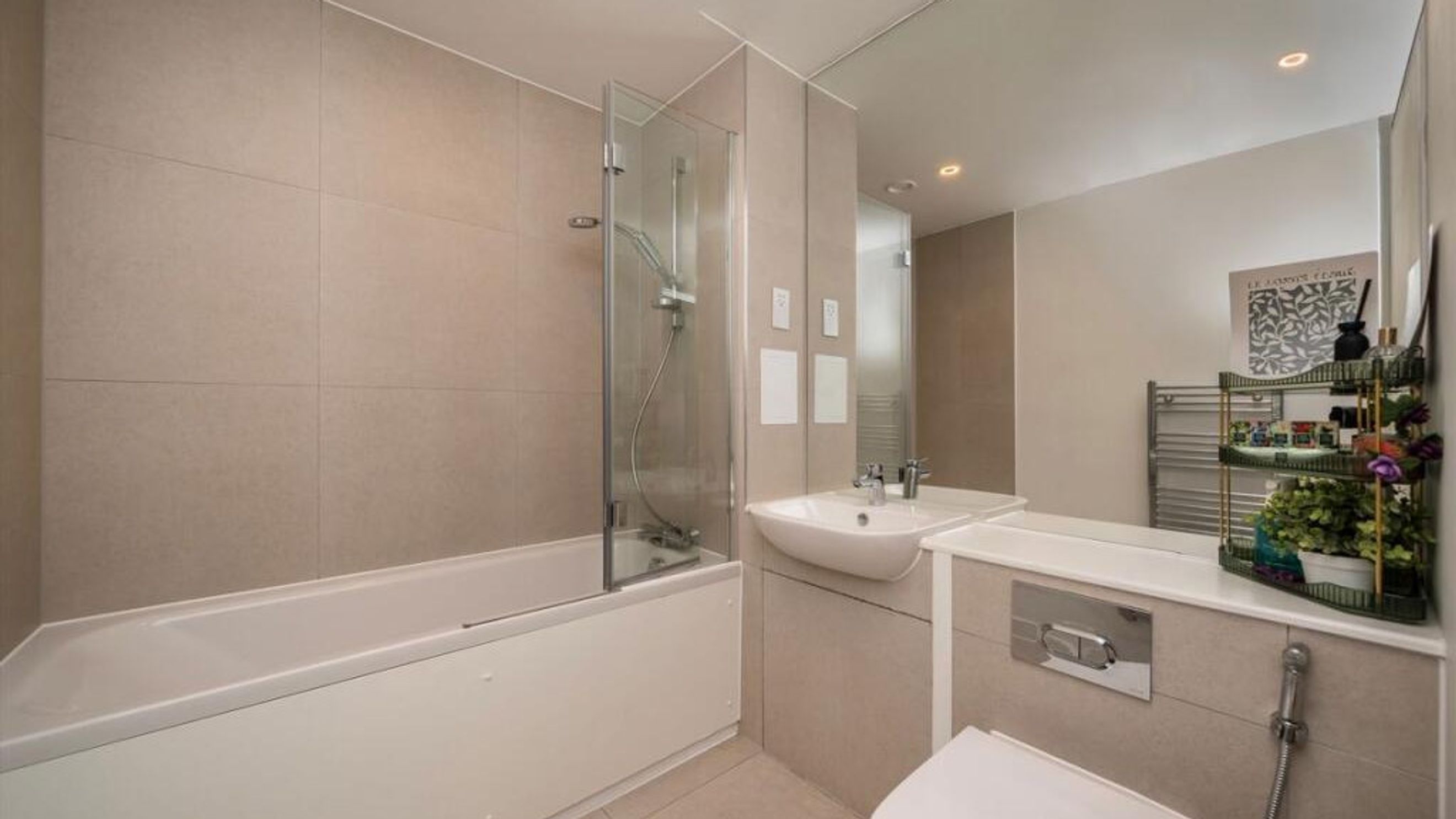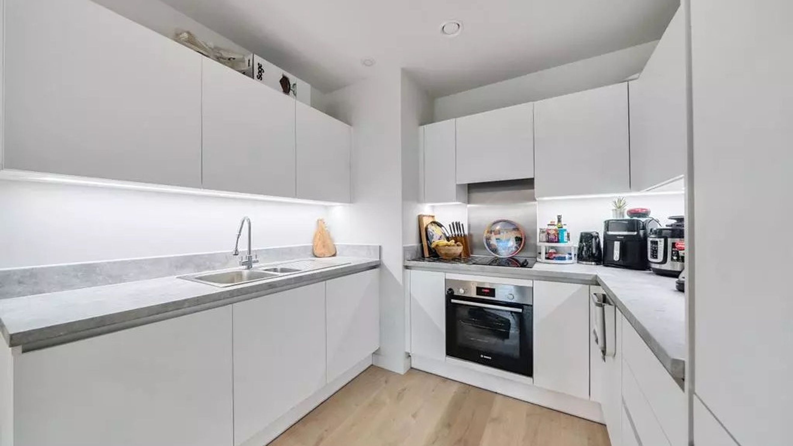The apartment opens into a welcoming hallway leading to a bright and spacious open-plan kitchen/reception room. The sleek modern kitchen is fitted with integrated appliances and ample storage, flowing seamlessly into the living and dining area. Large doors open out onto a private balcony, perfect for enjoying the outdoors.