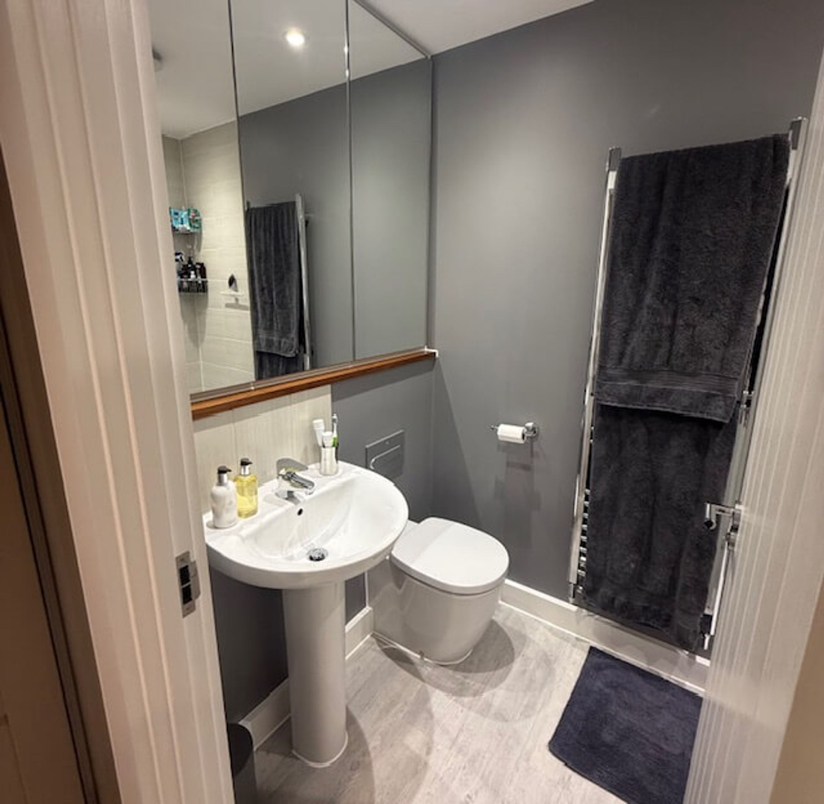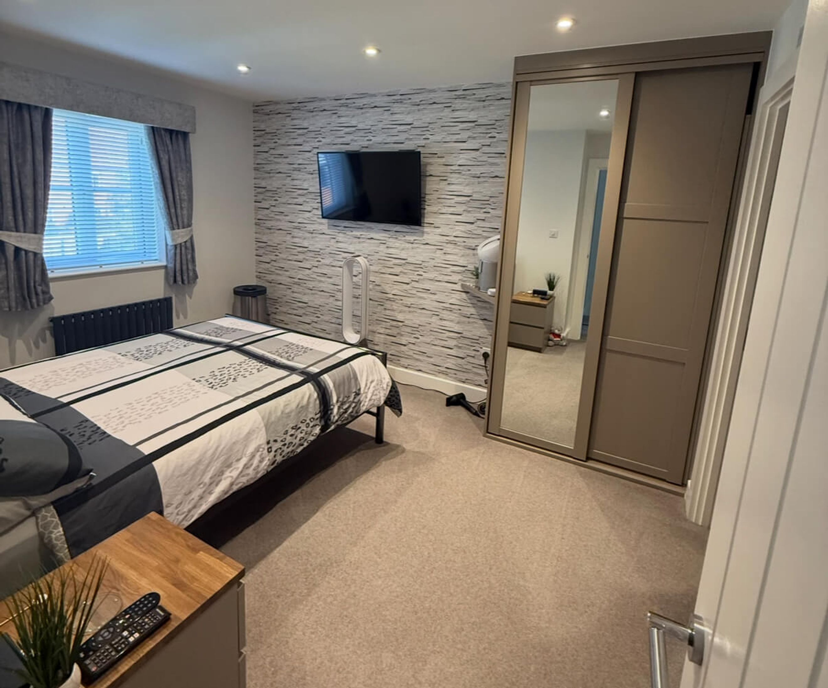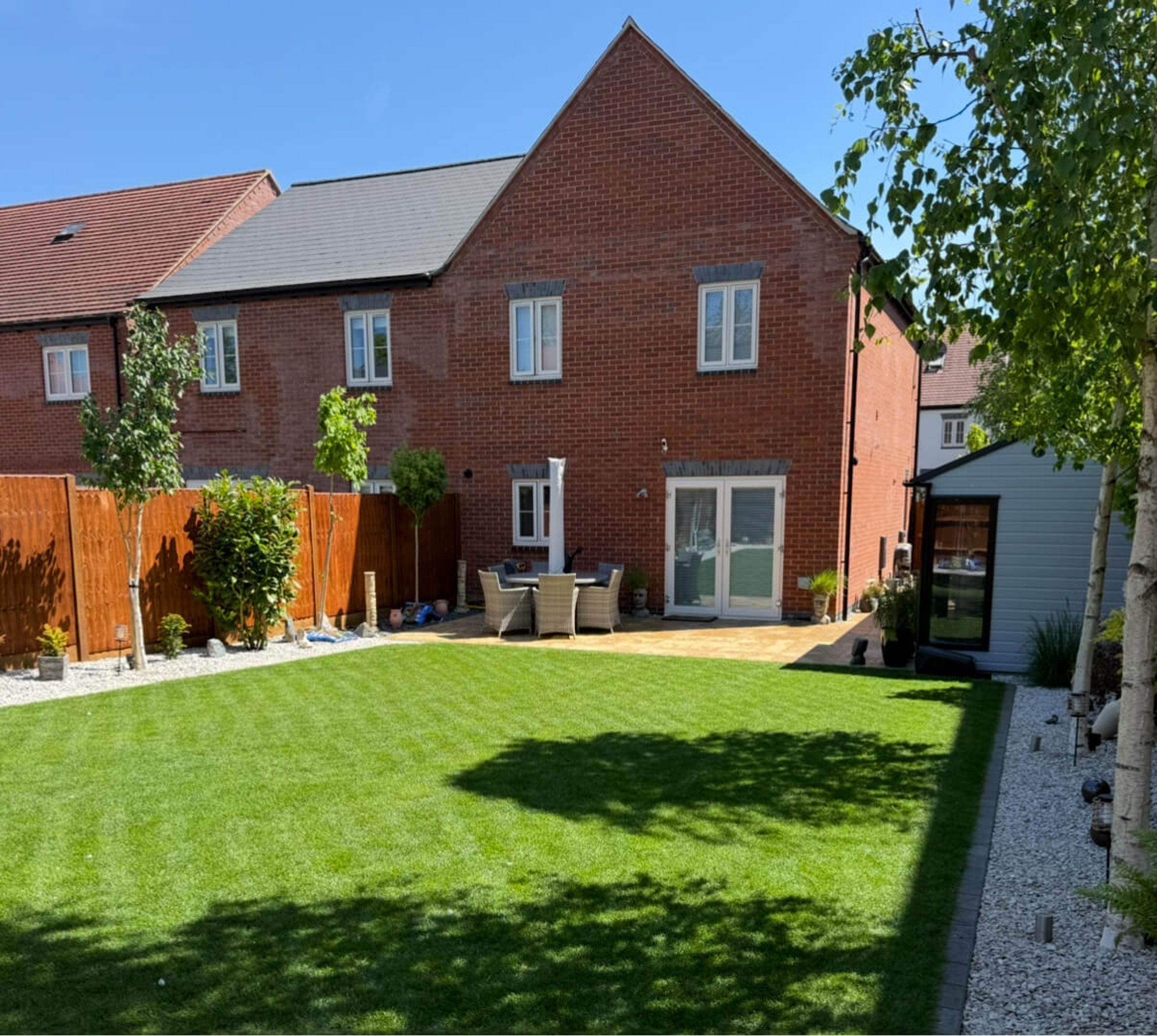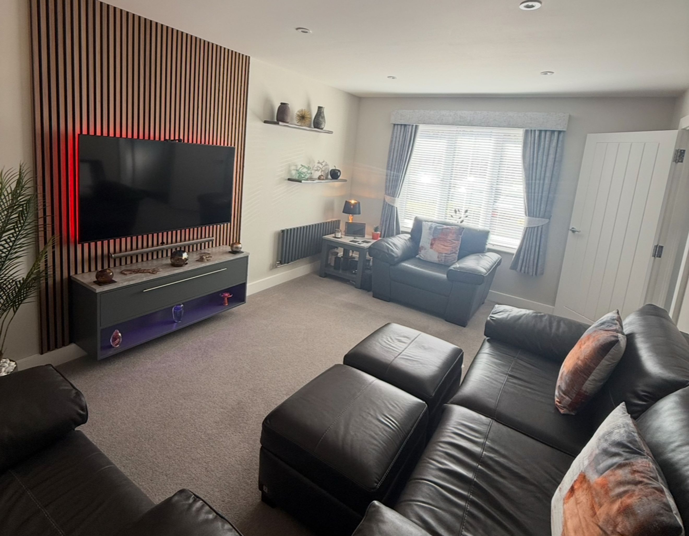 Upstairs, the home continues to impress with a large family bathroom featuring a shower over the bath. The main bedroom includes fitted wardrobes and a stylish en-suite with a walk-in shower. The second double bedroom also has fitted wardrobes and both main bedrooms offer additional lit storage cupboards. A third good-sized bedroom with fitted wardrobes completes the upstairs. Outside, a large landscaped rear garden with a side patio area, two powered sheds, and a summerhouse offers privacy and plenty of space. A driveway for two vehicles and visitor parking add to the appeal of this well-appointed family home.