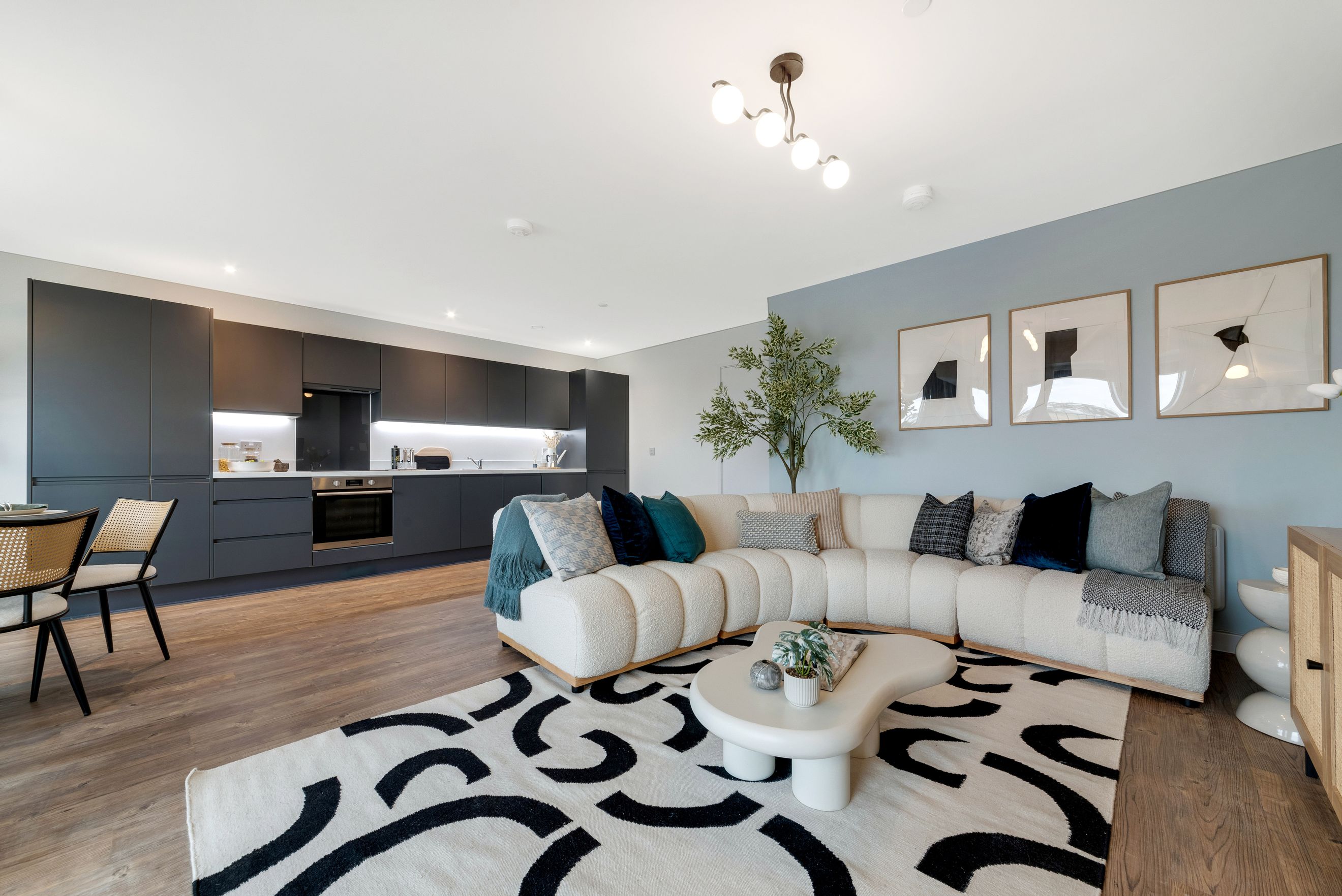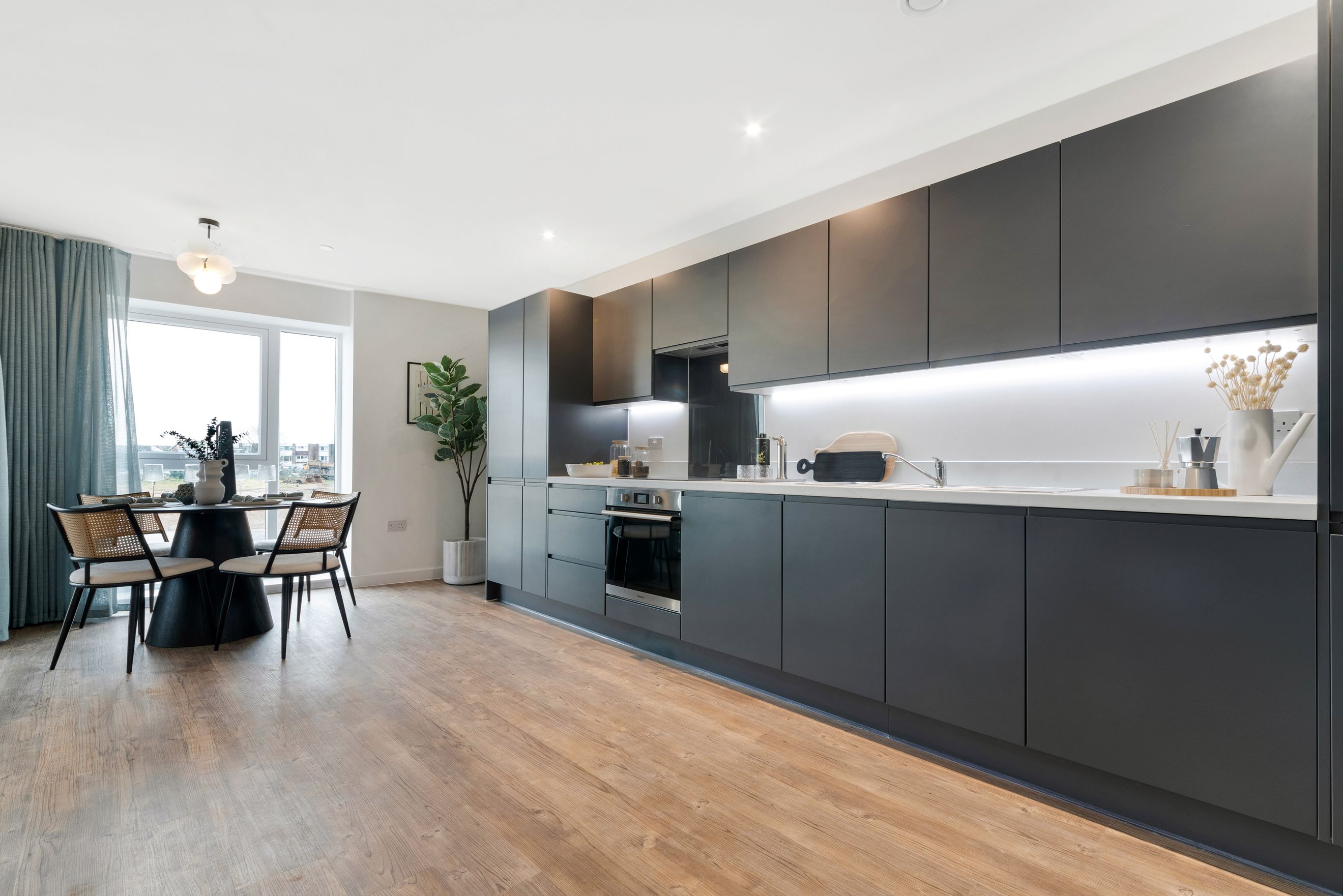 Step through the front door and immerse yourself in the modern, open layout of this first-floor three-bedroom apartment. Experience the seamless blend of living and dining areas, featuring a pearl grey gloss kitchen with integrated appliances, quality Amtico vinyl flooring throughout, and ambient downlighting.