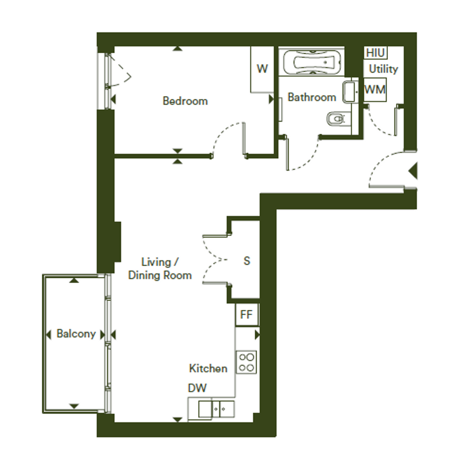Jet House - Plot E2.12.03 is a 1 bedroom twelfth floor apartment offering 50sq.m of internal floor area with outdoor space.