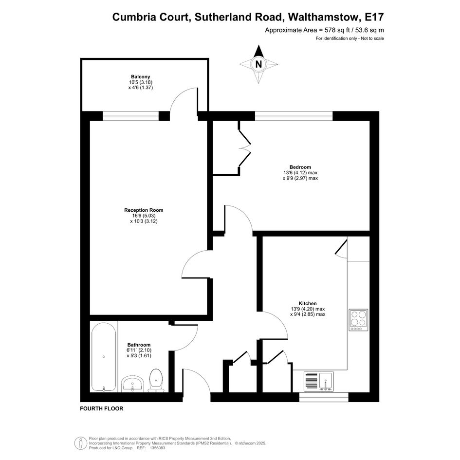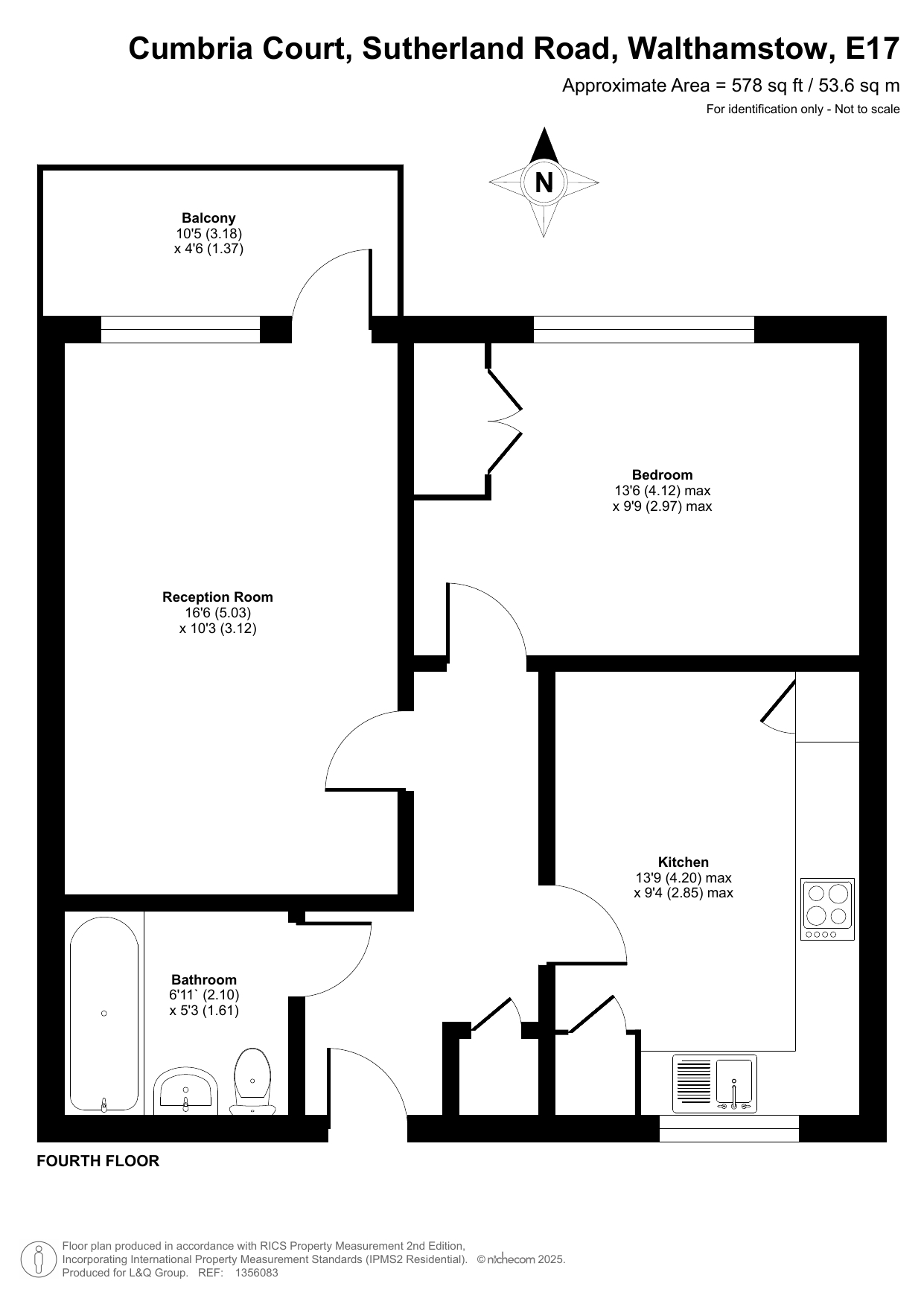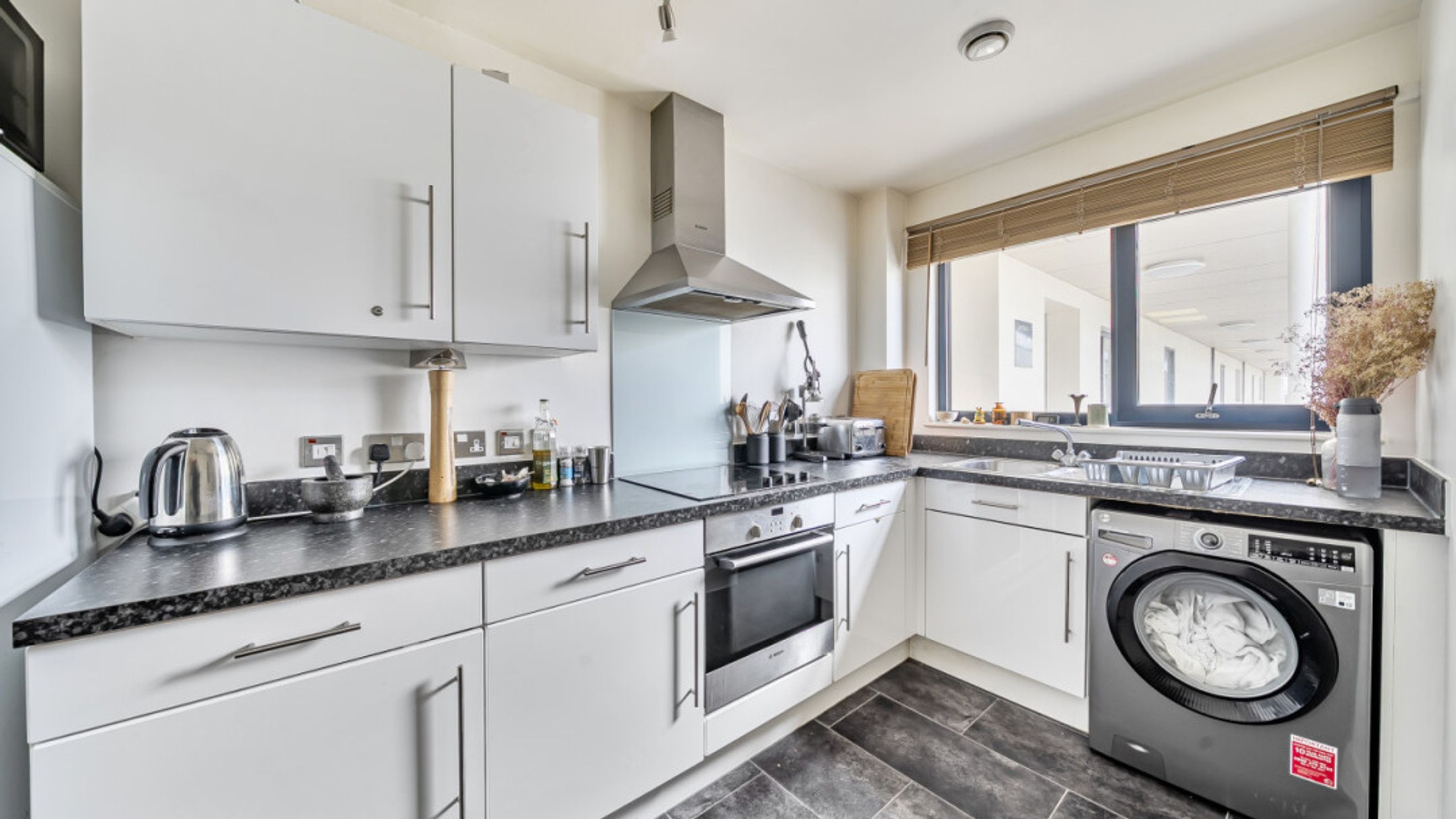 Enter this dual aspect fourth floor apartment via a central entrance hall with storage. The separate kitchen is to your right and fitted with a range of white wall and base units with black worktops. There is an integrated oven, hob and extractor fan and spaces for white goods as well as room for a dining table. A double bedroom with in-built storage faces east as does the main reception room that has doors to a private balcony. A bathroom with shower over bath, completes the accommodation.