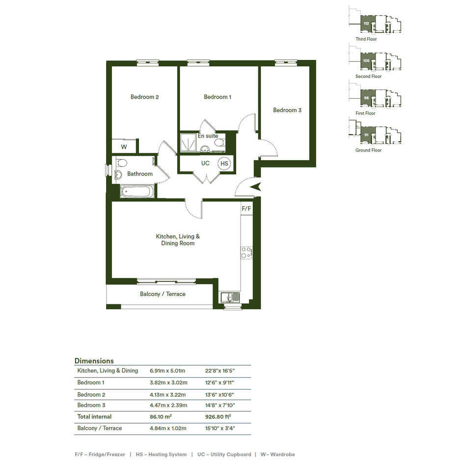 3 bedroom, 2 bathroom apartment. 86 sq m of internal space and private terrace.